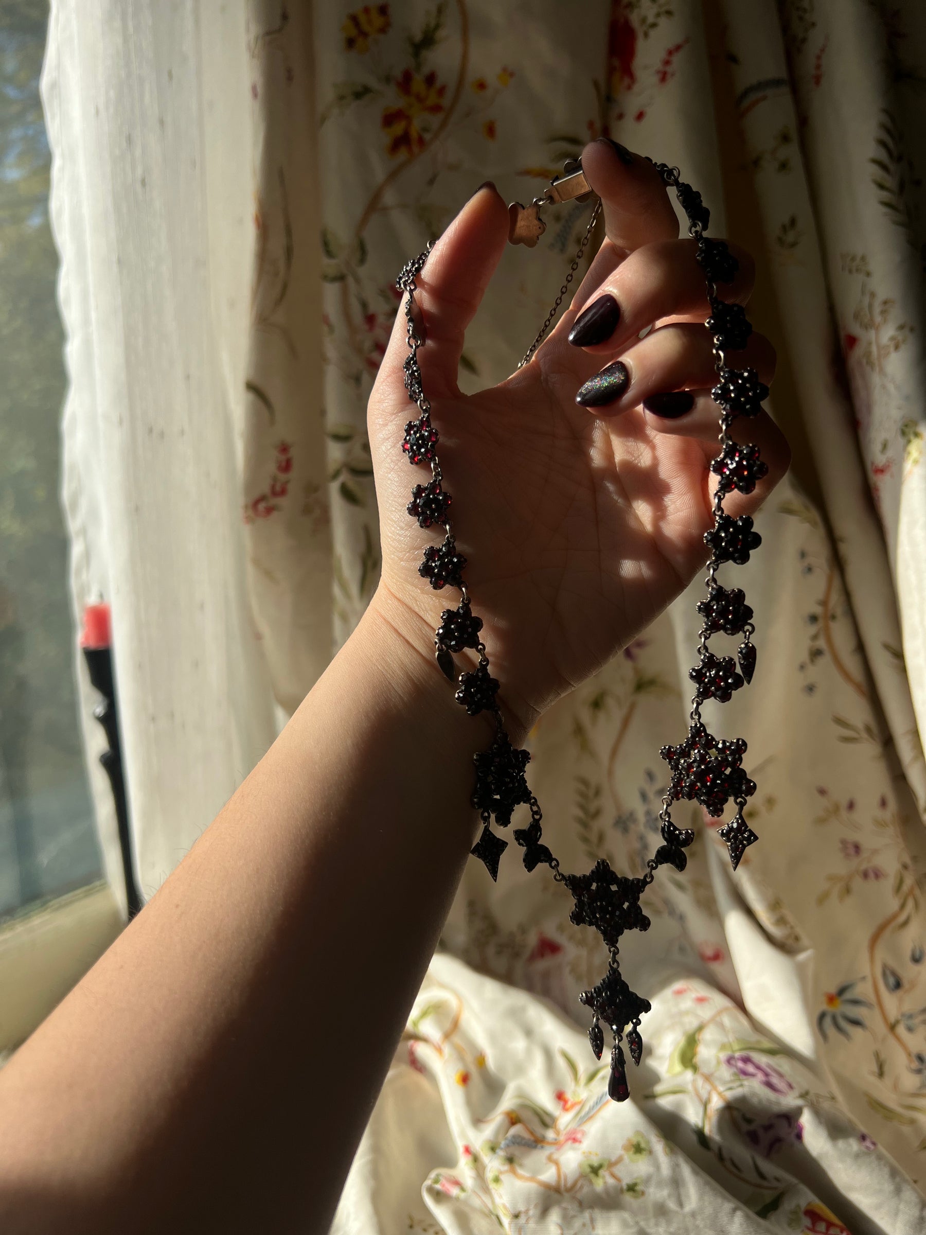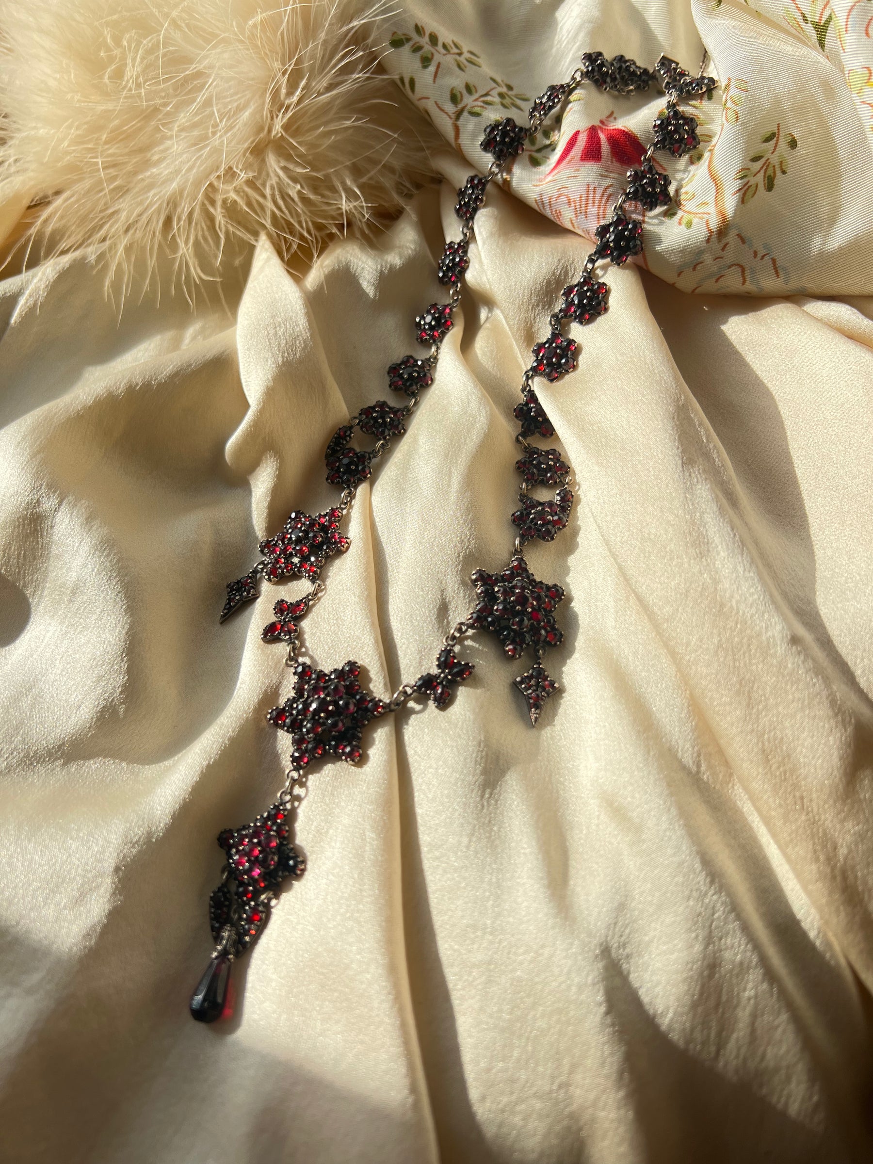 Oh but what could entice a vampire more than a neck full of bohemian garnets? One of the top jewels of Vampire weekend would most assuredly be this exceptional Bohemian Garnet necklace with festoons to drip down your decoletage, culminating in a large briolette at the bottom of the central drop! Comprised of stars, forget-me-nots and butterflys, this necklace is the ultimate and exact example of a feminine take on the gothic fascination of the 1870's. All original and phenomenal to find, this example is 14ct pink gold over sterling, which is, in fact, the most desirable combination of materials for one of these gorgeous bohemian necklaces.