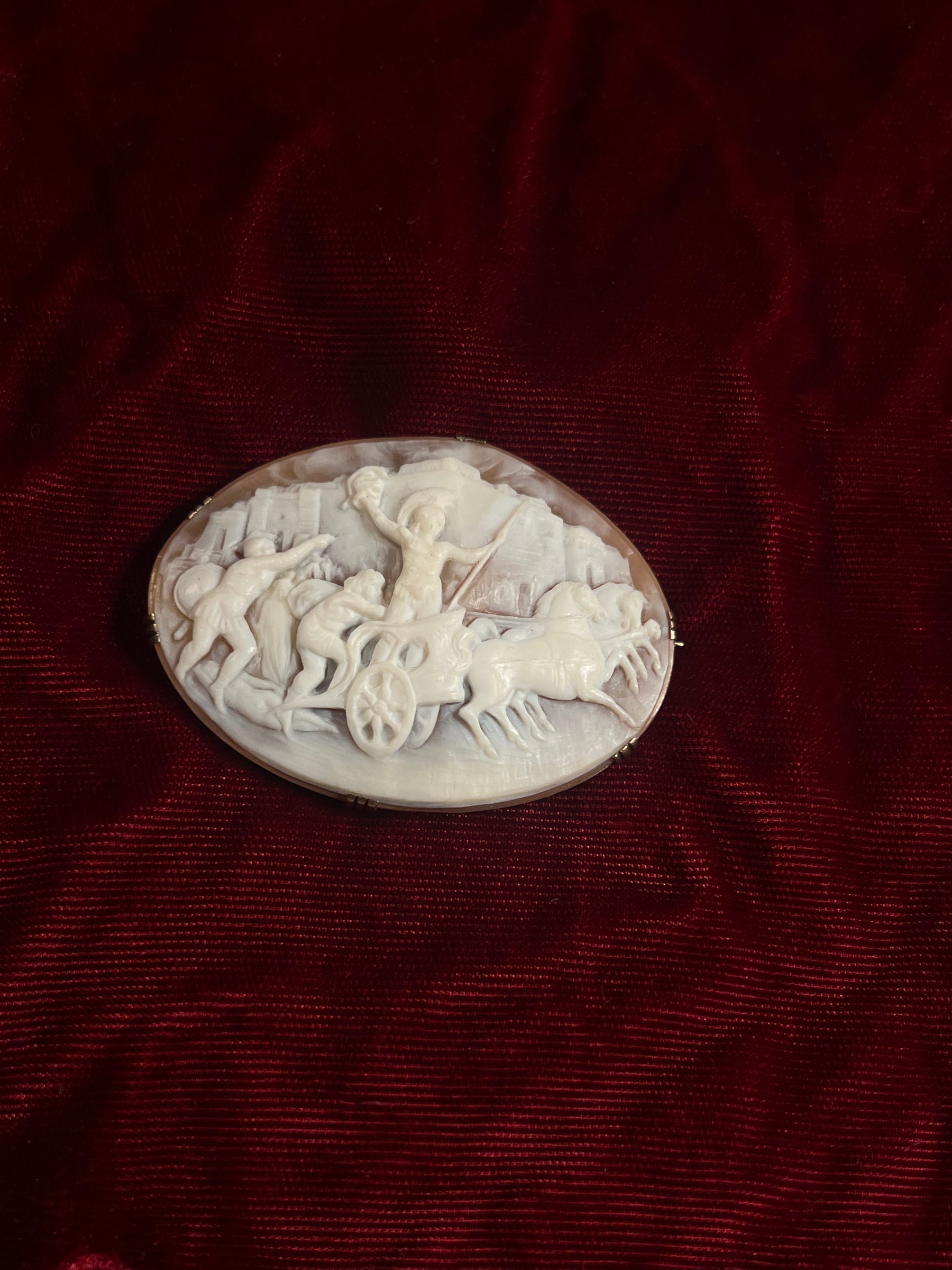 An exceptional shell cameo circa 1850. With a remarkable three dimensionality, this one-of-a-kind brooch represents the allegorical adage 'To The Victor Go the Spoils.' In excellent condition, a wonderful amount of gold was used overall, with a full circlet at the back. Notable features include three central figures, two horses, a completely carved, nearly three dimensional chariot, and a fully rendered castle behind the unfolding scene.