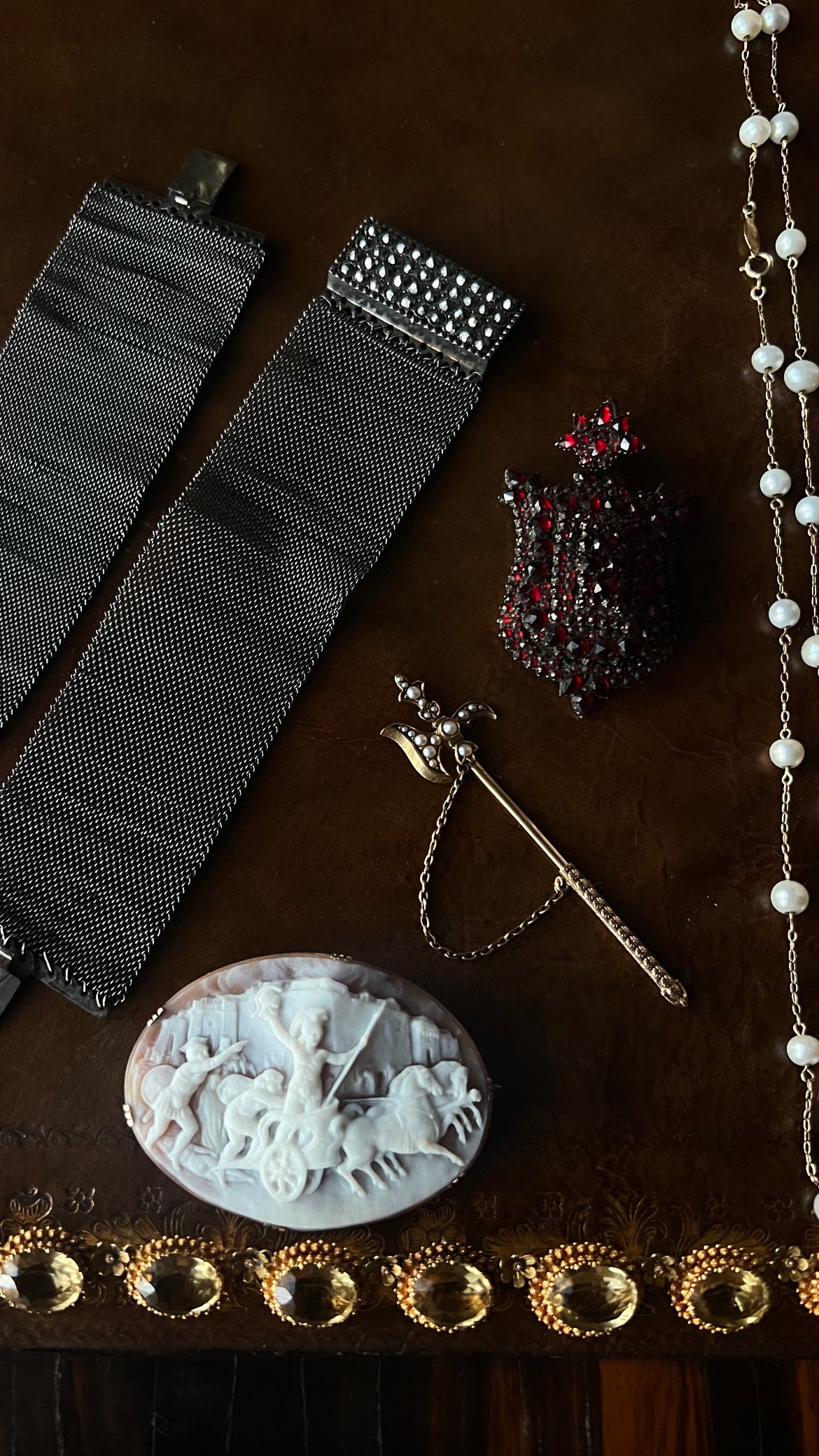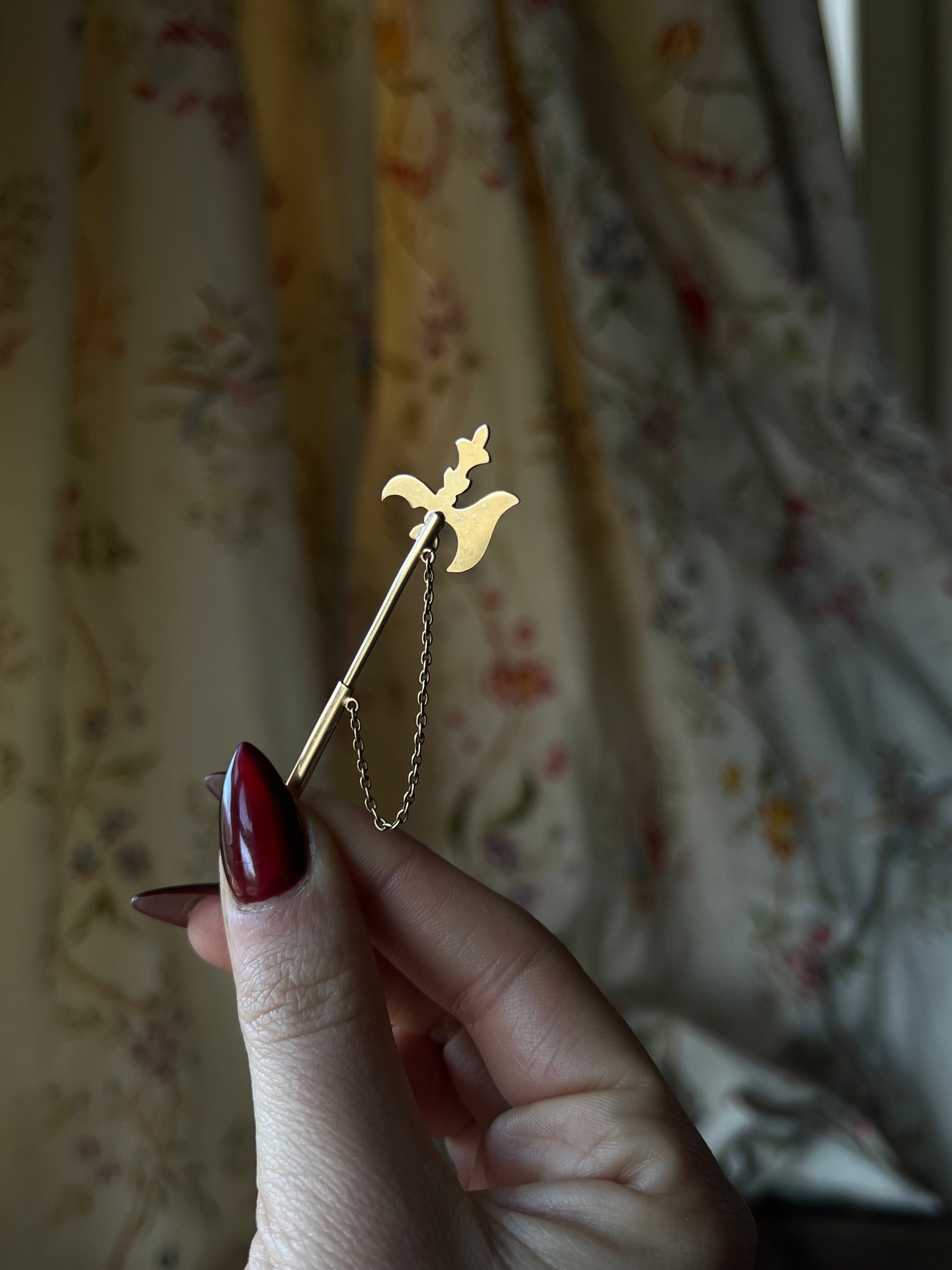 With its finely rendered detail and small but mighty figure, this medieval inspired pin speaks to the trend of women wearing weapons as pins in the Victorian era.