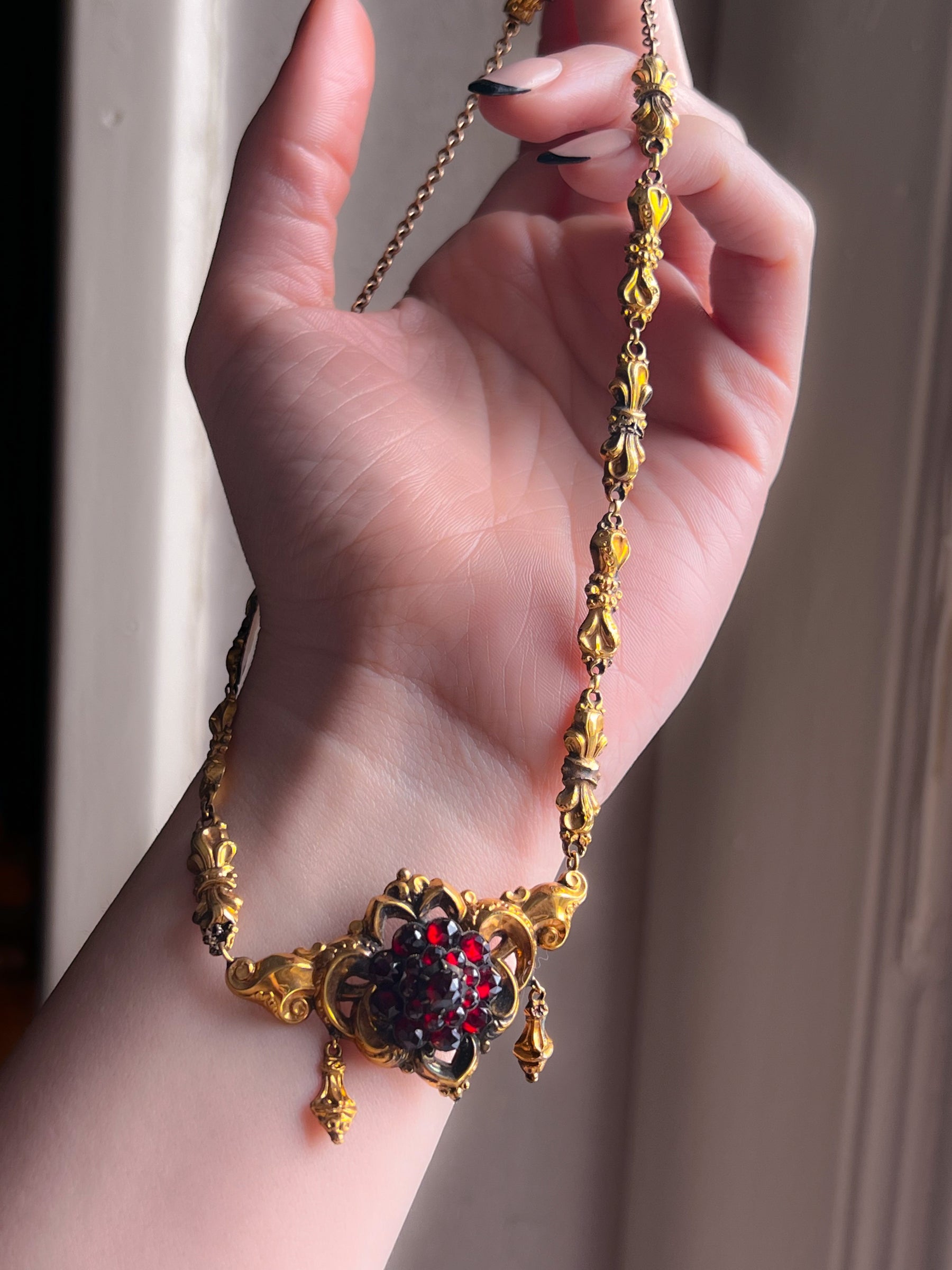 An extremely rare late Georgian dinner necklace, this garnet jewel possesses a special auditory secret! Constricted utilizing not only a beautiful garnet medallion, but of a chitter chain! The  “chitter” chain was named as such for the lovely chittering sound it makes as the wearer moves! This is a very rare example, I’ve only had one other.