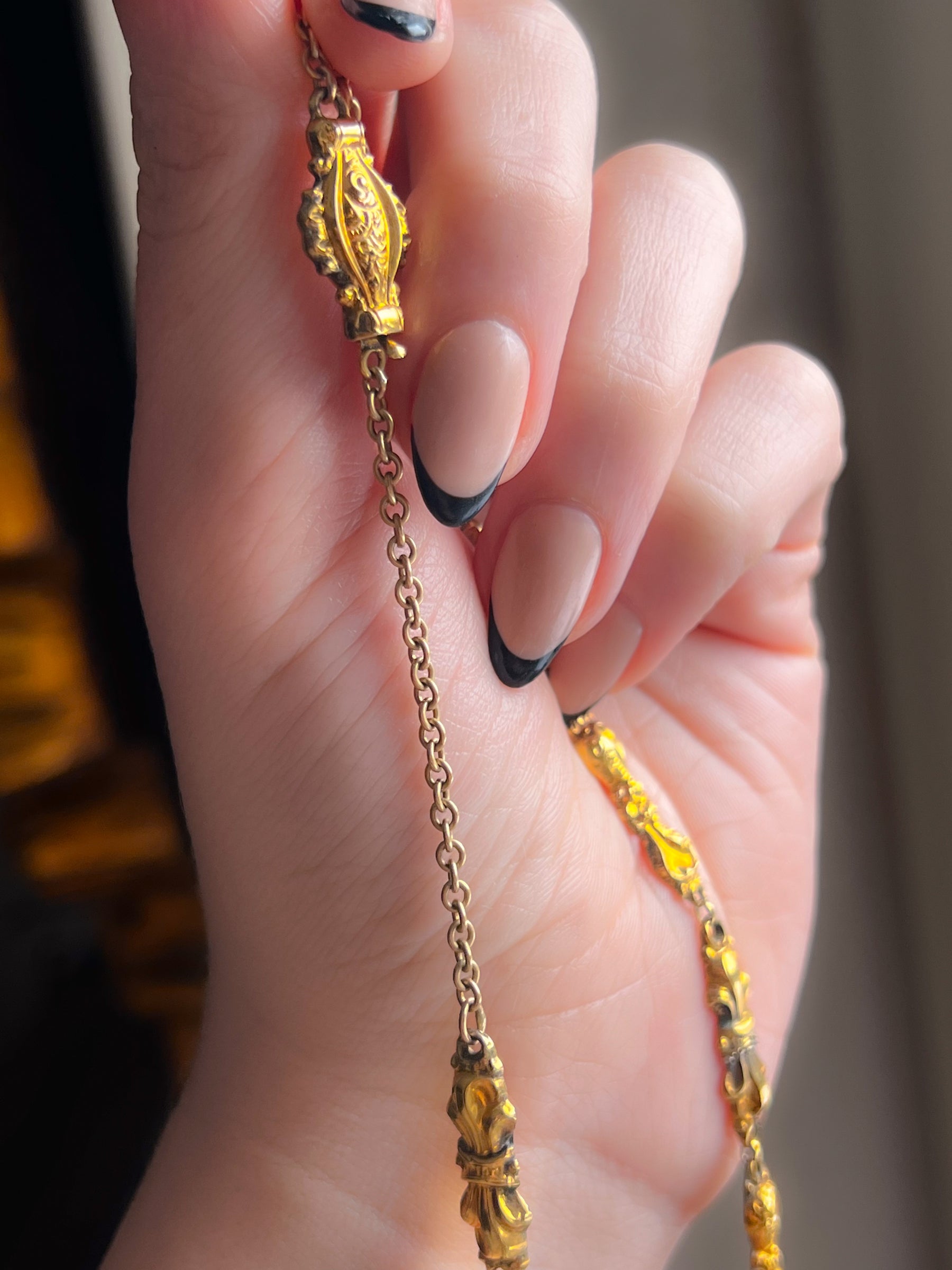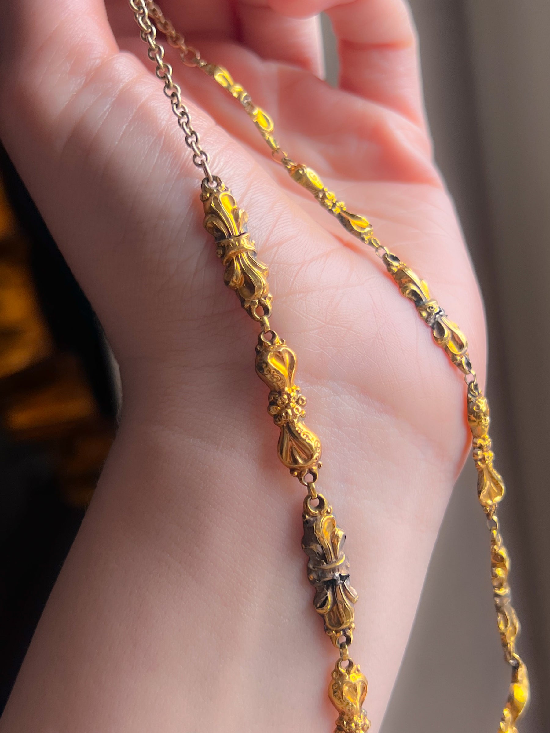Condition: Good for her age! Having some battle scars including; solder repairs to 3 links, one link is in weak shape, the back has been completed with Victorian chain to make her effortlessly wearable, please see photos! She has been priced accordingly; in mint condition, this necklace would be in the $5k+ ballpark ♥️