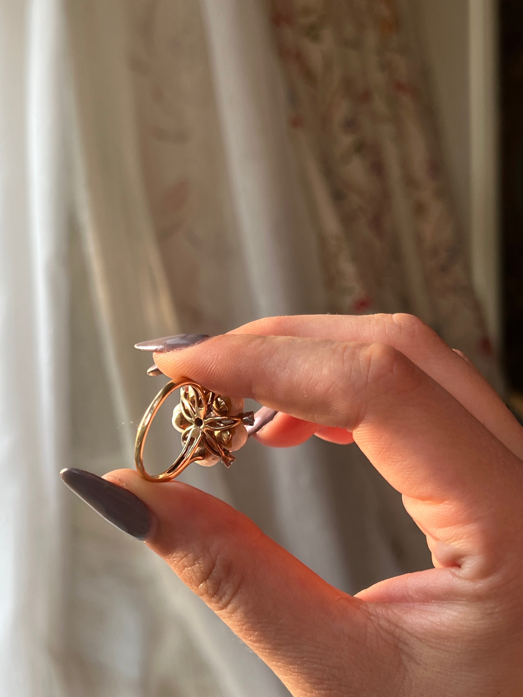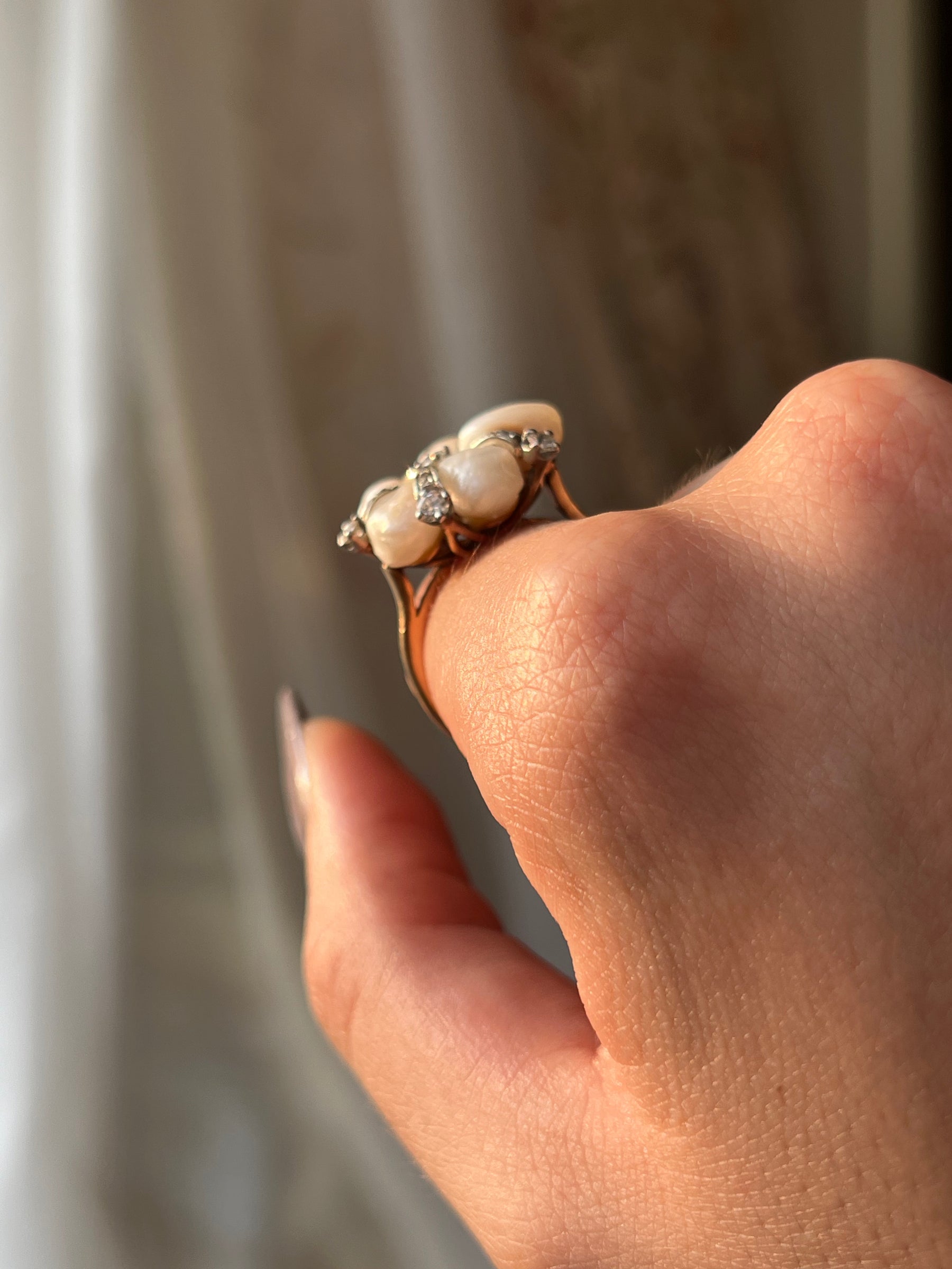 We personally love this ring, as it underscores how the 20th century had an โ€œorganic figureโ€ backlash to the Art Deco period in the 1930โ€™s. As the U.S. was recovering from prohibition (which officially lifted in 1933) there was a heavy departure from the stringent geometry that came the decade before. This ring is a wonderful example of organic design, with the smooth irregular edges of the pearls rounding out some of the harsher lines of the gold gallery.