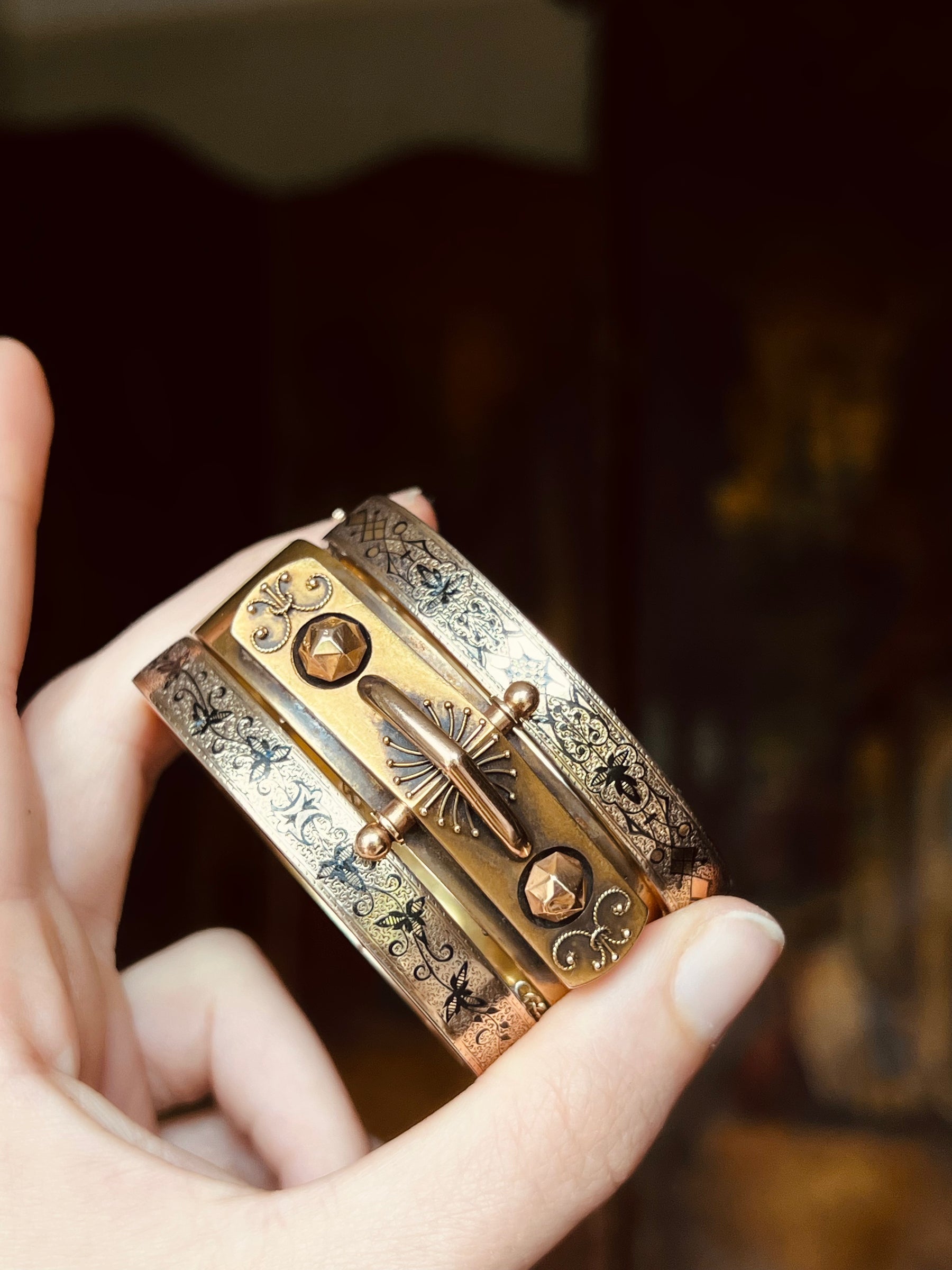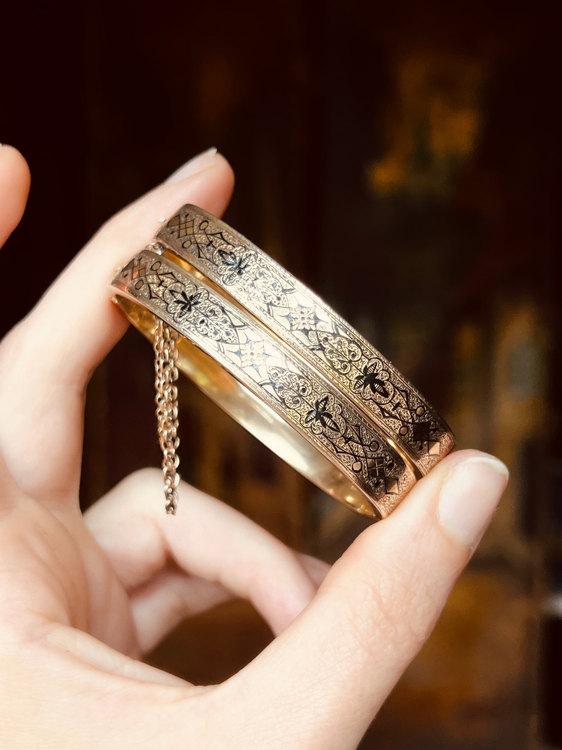 Condition: Excellent. Near to mint condition on this outstanding duo of rare aesthetic movement bangles- minor enamel loss as expected.