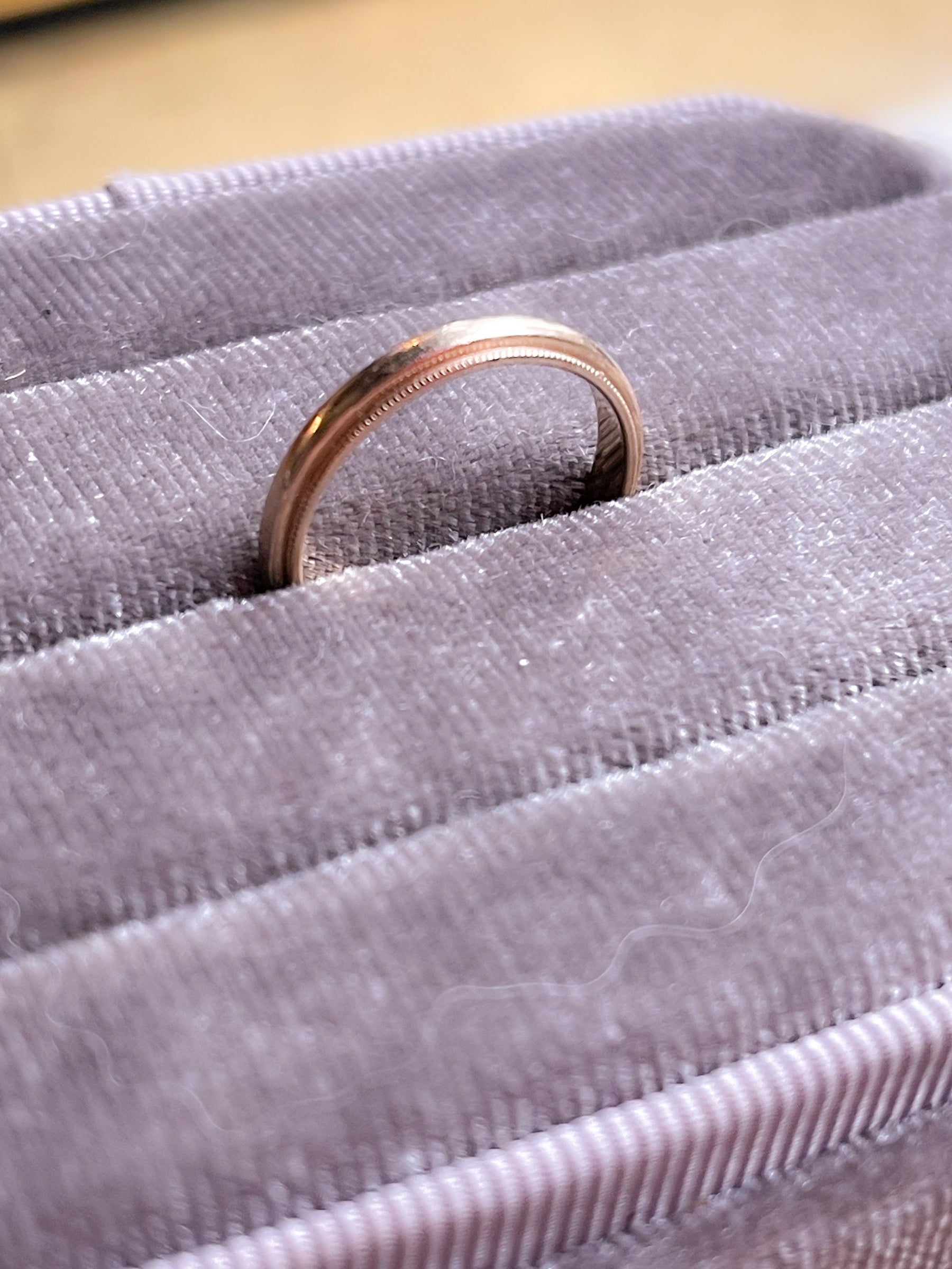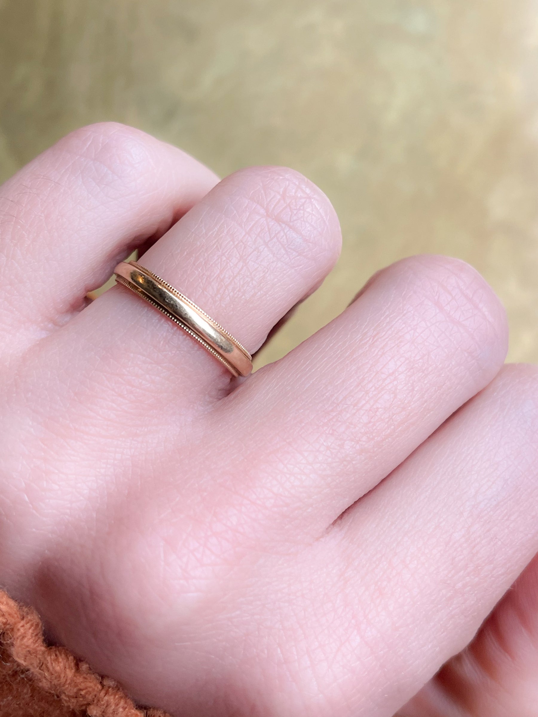 14k yellow gold wedding band circa 1960 with a delicate milgrain edge detail. A splendid example in a desirable size 5, this particular band would be a delicious stacking addition to any collection.
