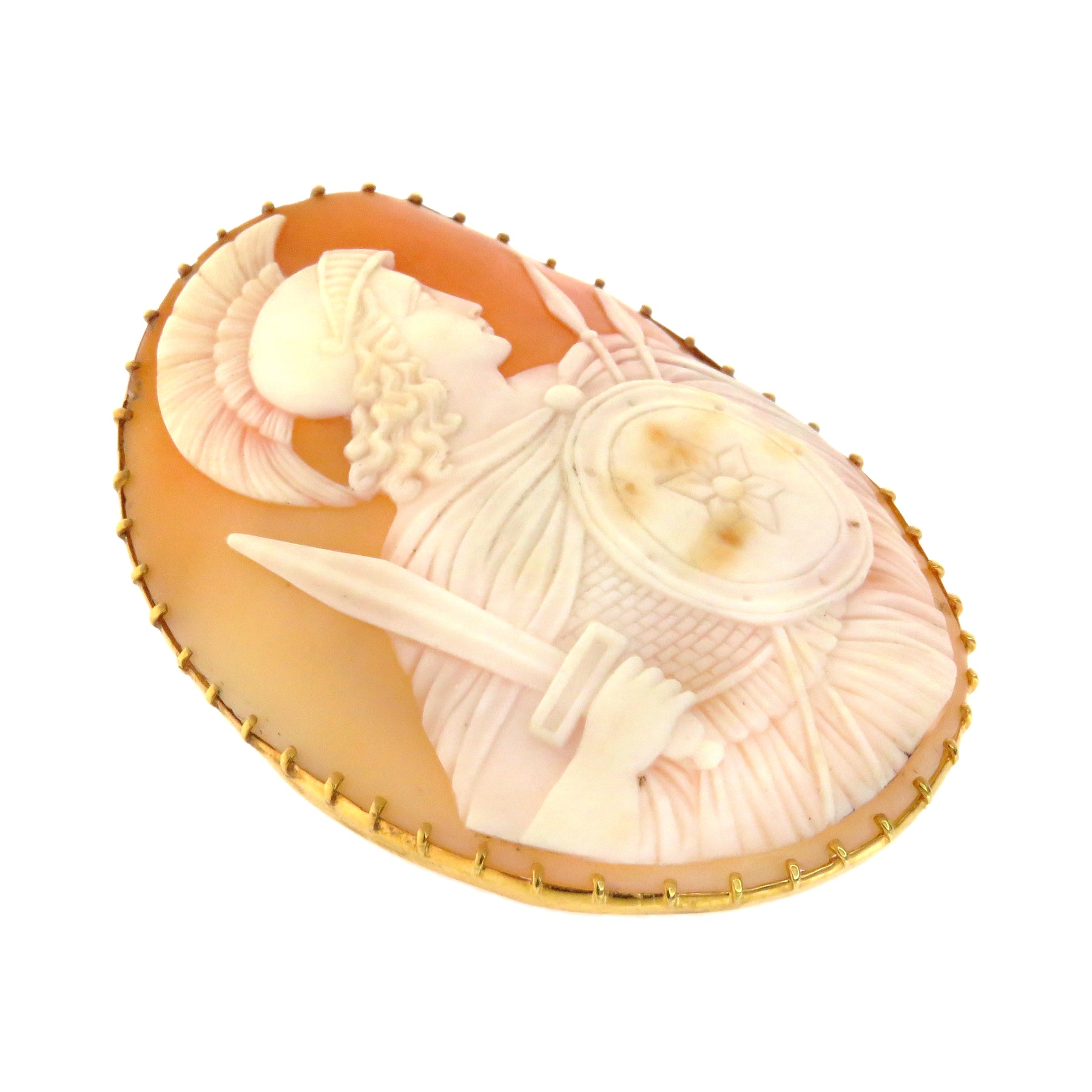 Apollo, the Sun God makes an appearance in this stunning 14k bezel set shell cameo. Pictured in an effeminate manner with the flower depicted on his shield, as well as his curly locks, the also-known-as God of War completes the look with ancient Roman helmet, sword & arrows.