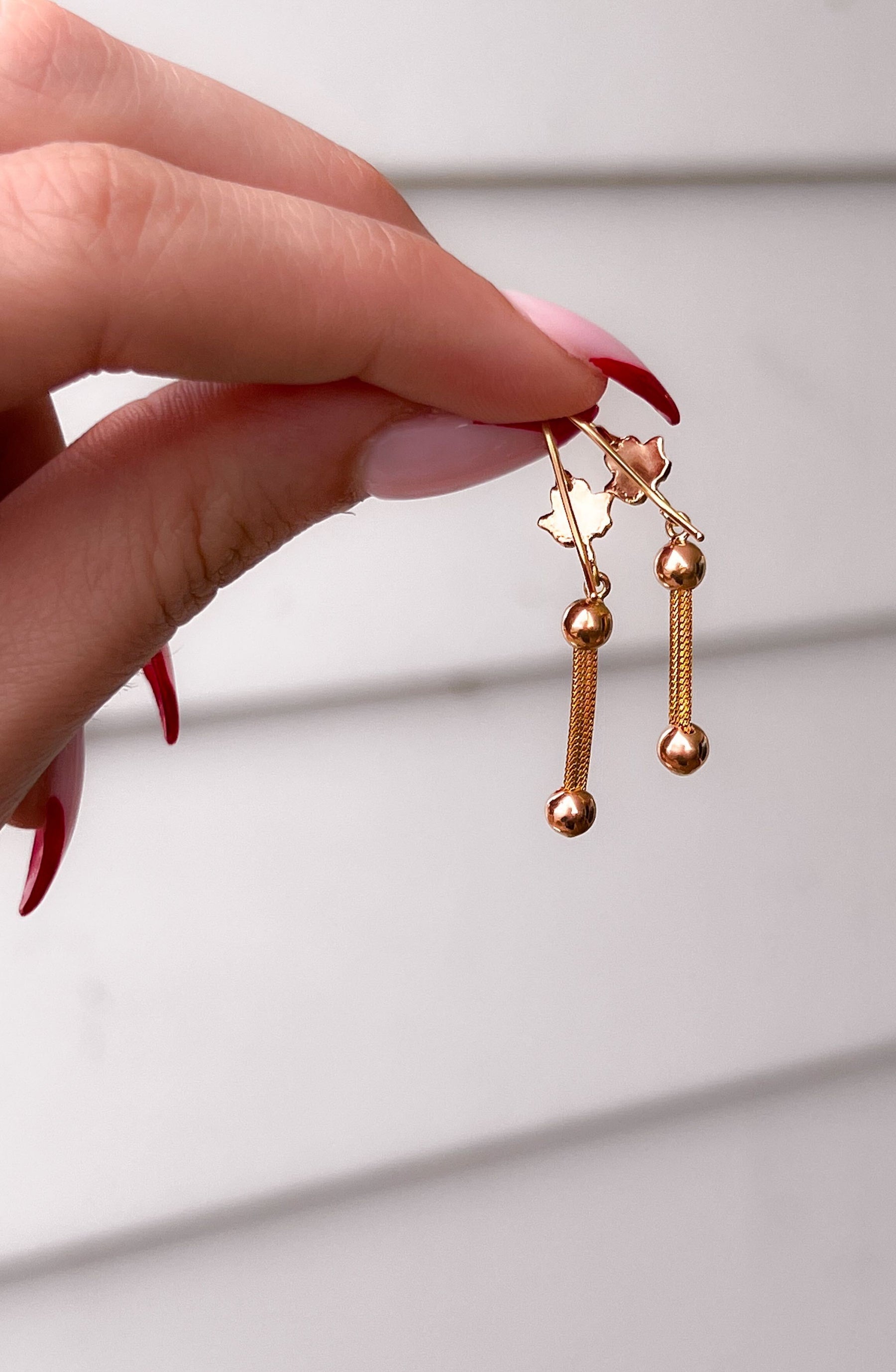 A gorgeous pair of American aesthetic movement earrings with stylized leaf tops. With two sensual tones of gold, pink and yellow play wonderfully together to create this delightful pairing.