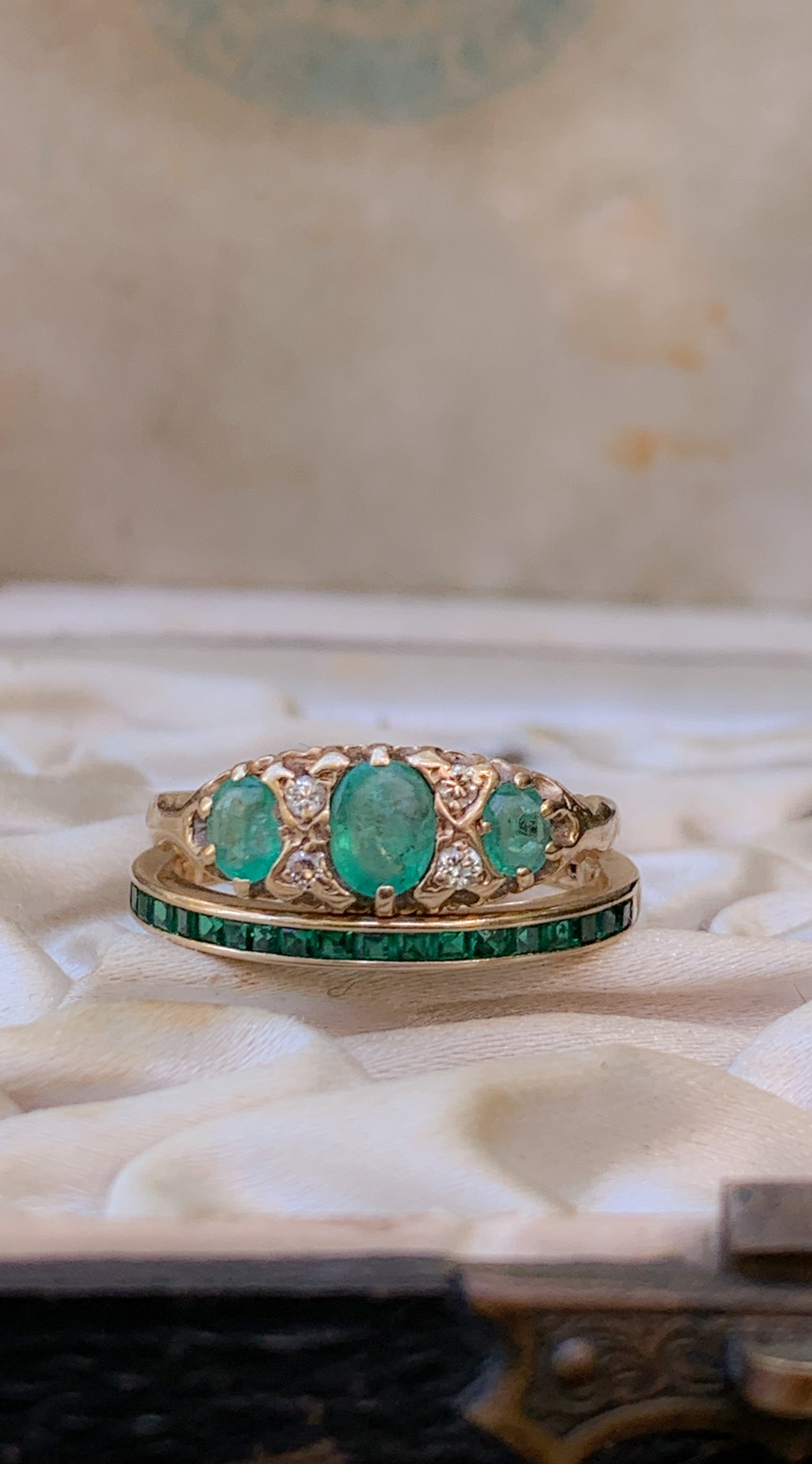 A stunning 1950s natural emerald band designed to stand out. Boasting an elusive size, the bright 14k gold cradles half a bad of emeralds.