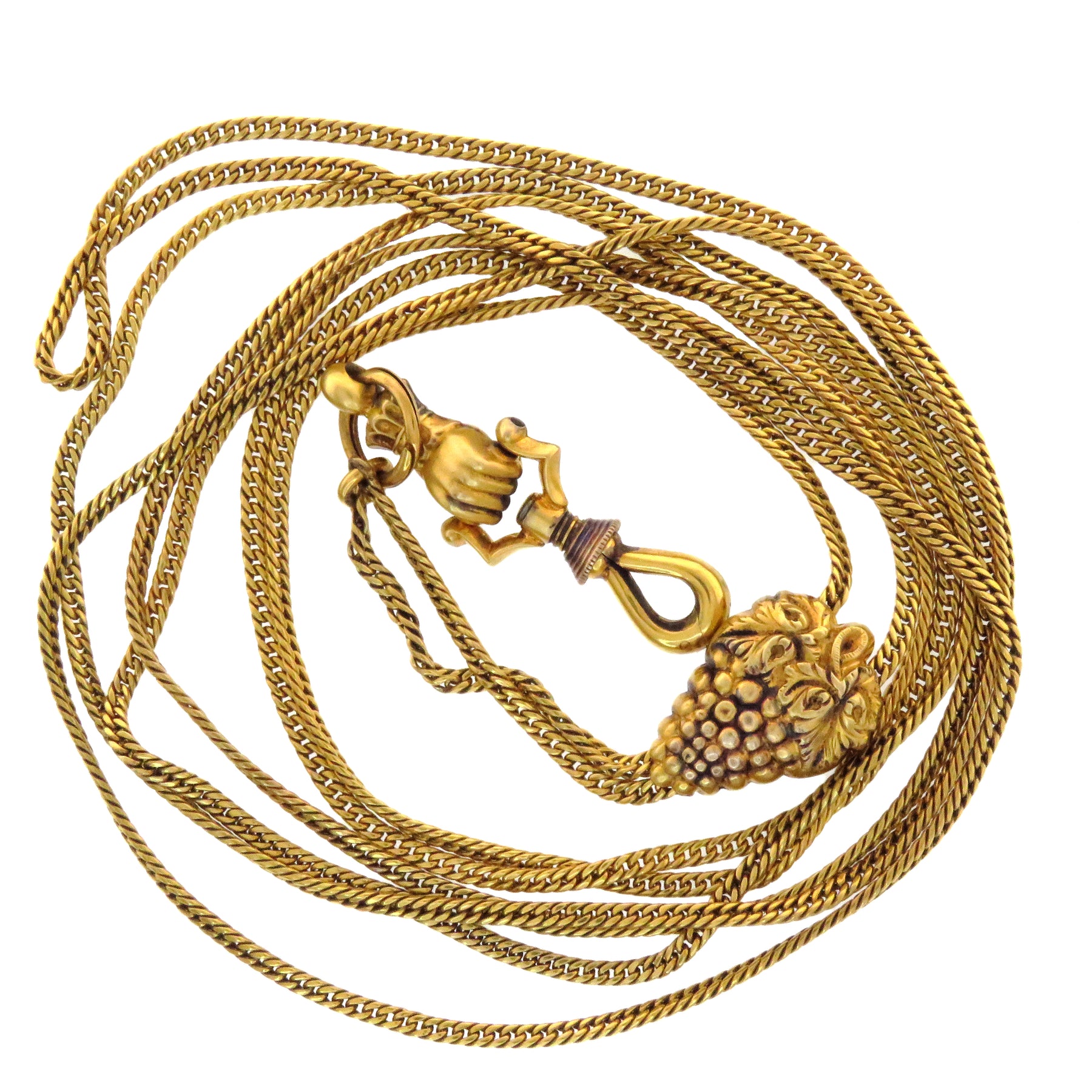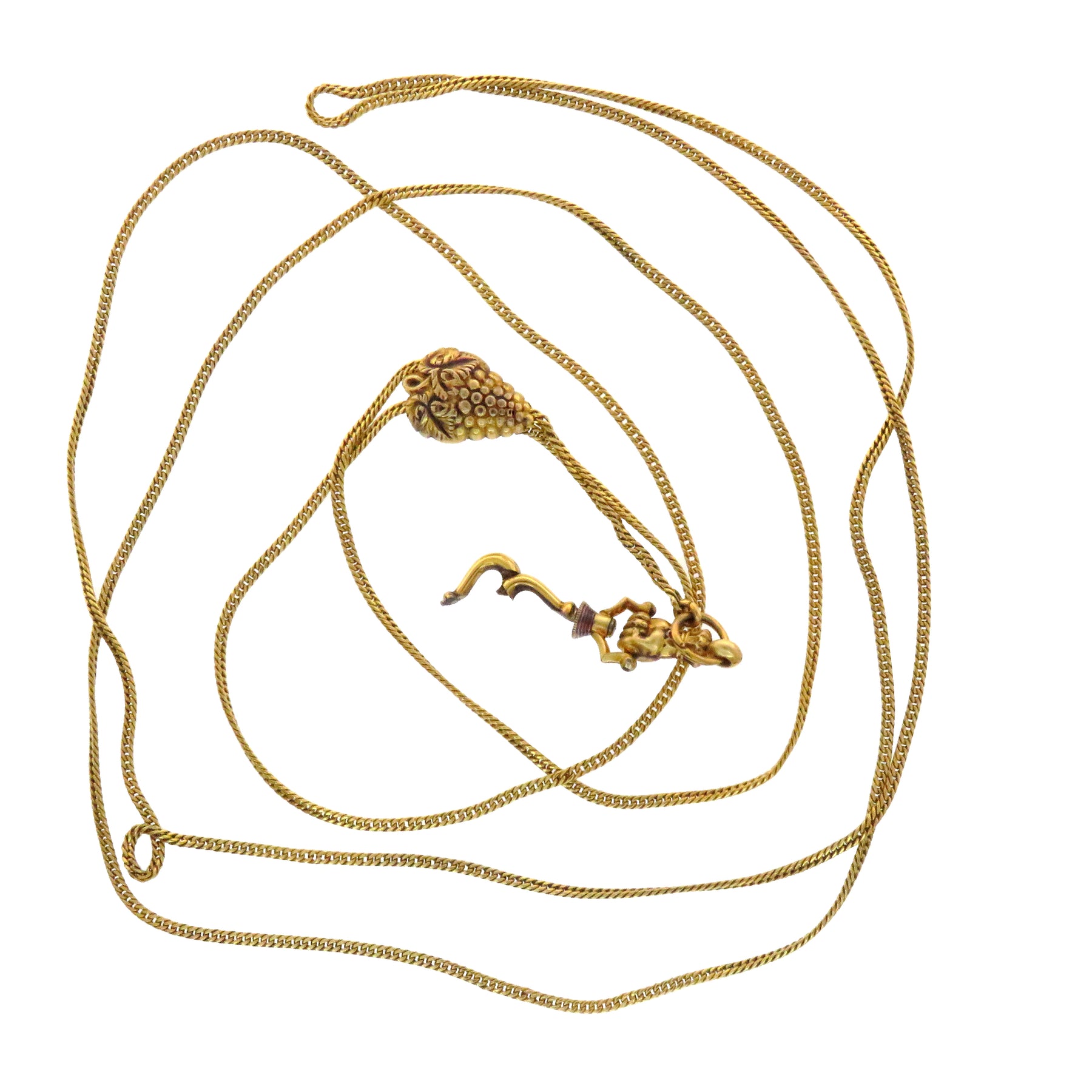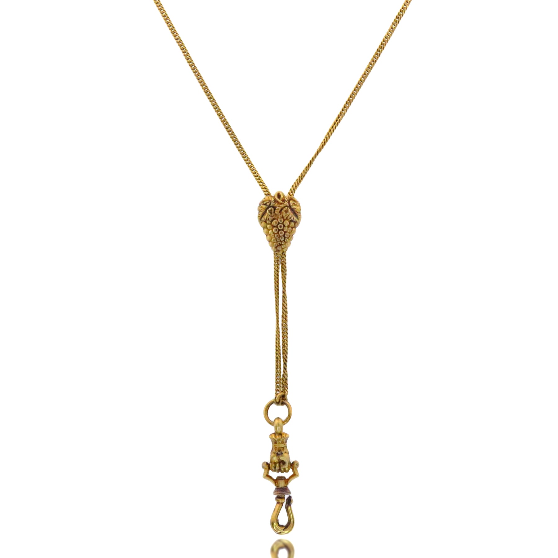 Slide chains were originally designed to hold a lady's watch and can still be used for this, but they are very versatile. A long, thin chain with a decorative slide and ending in a watch hook, with a slide that glides on the chain and stays where you put it. This special one includes a grape slider, symbolizing plenty, freedom, and rebirth.