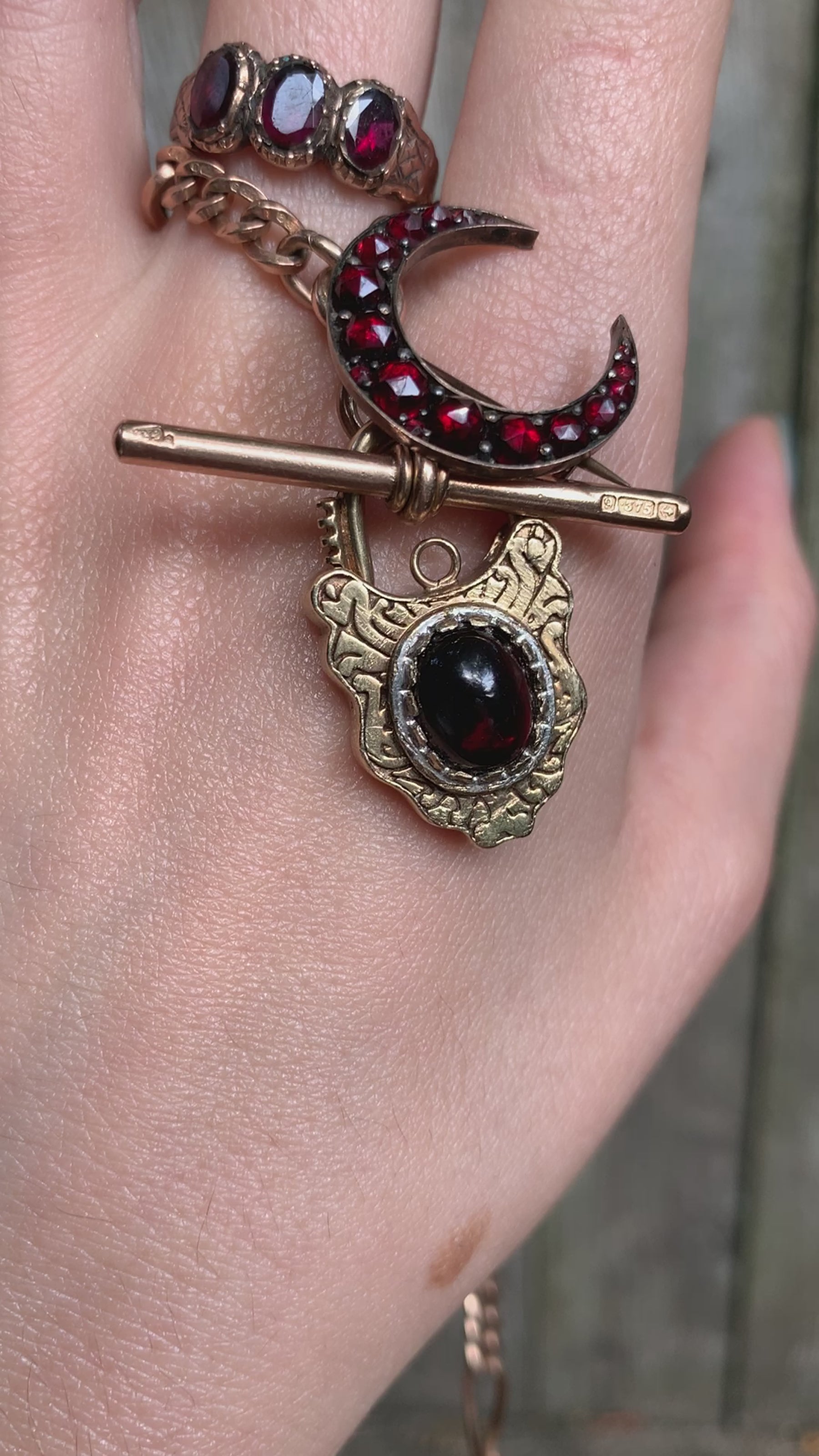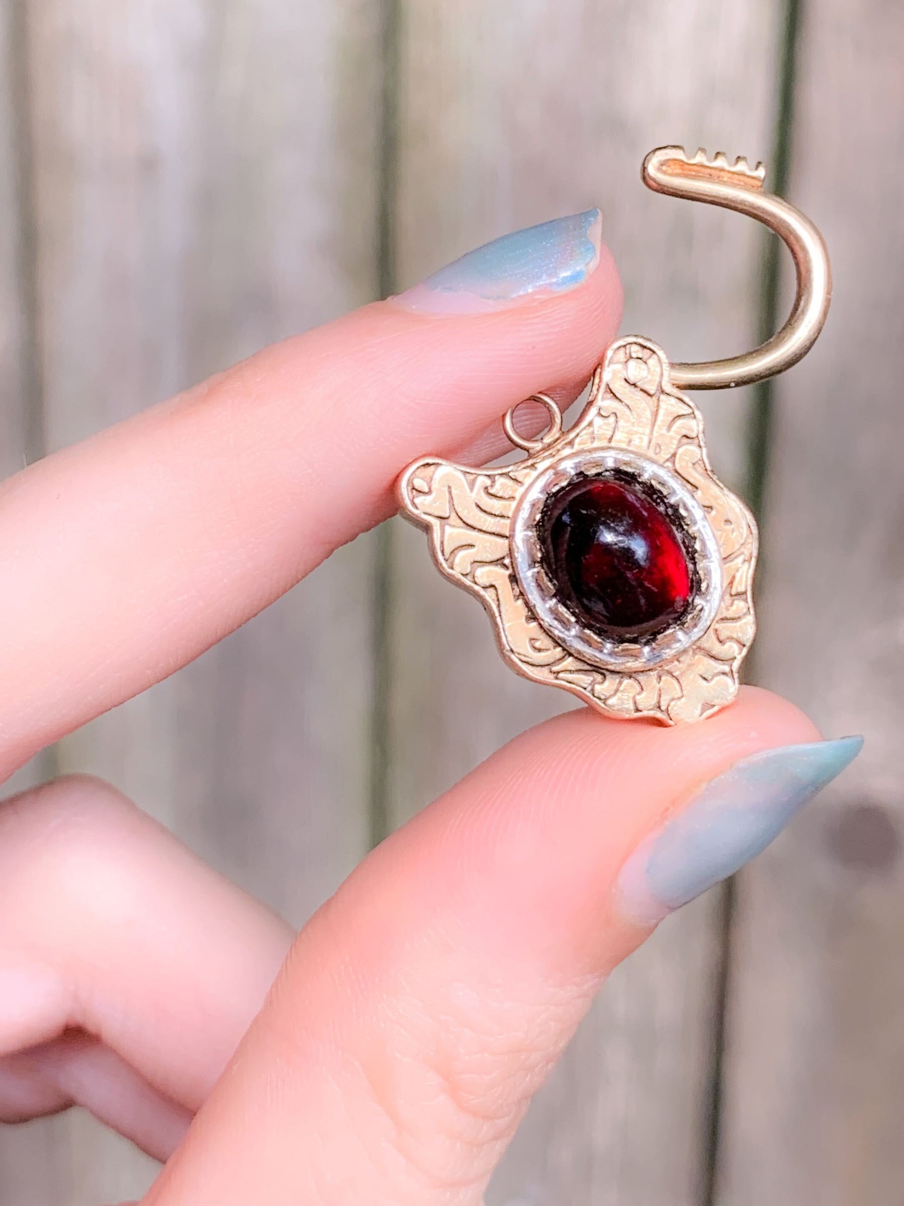 A gorgeous 1960’s does 1860’s Victorian revival padlock, this extraordinarily functional jewel will be a staple in whatever collection she may join for her versatility and vibrant cabochon. Attach to chains, bracelets, use as a lengthening element, and even attach other jewels to the top lock.