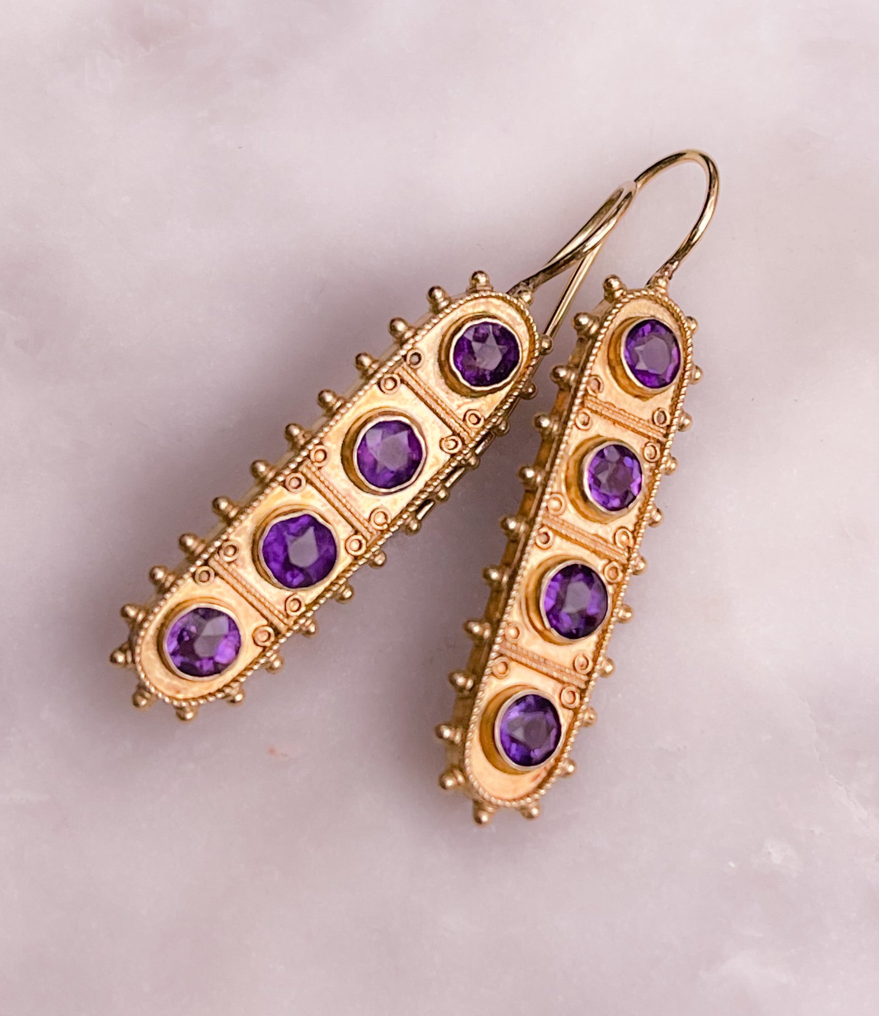 A perfect example, this elegant pair of amethyst drop earrings have been crafted in 15k solid yellow gold. If you look closely, you notice the gorgeously designed ornate boule details that add to the Etruscan look in this pair.
