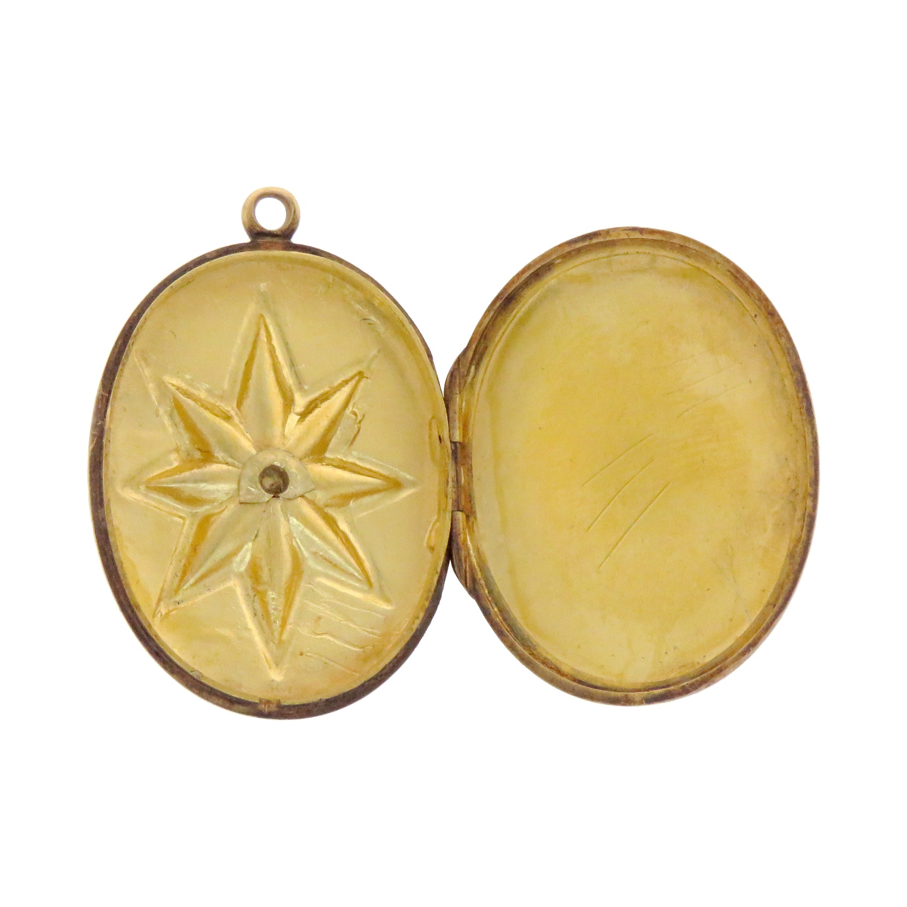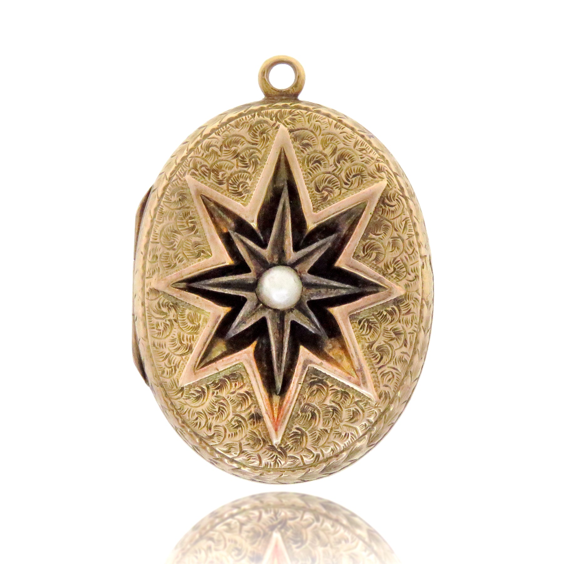 A classy pearl star locket, featuring a deep intaglio star front and center. All hand-engraved, the reverse additionally features a cornucopia of flowers, apples, and pineapples.