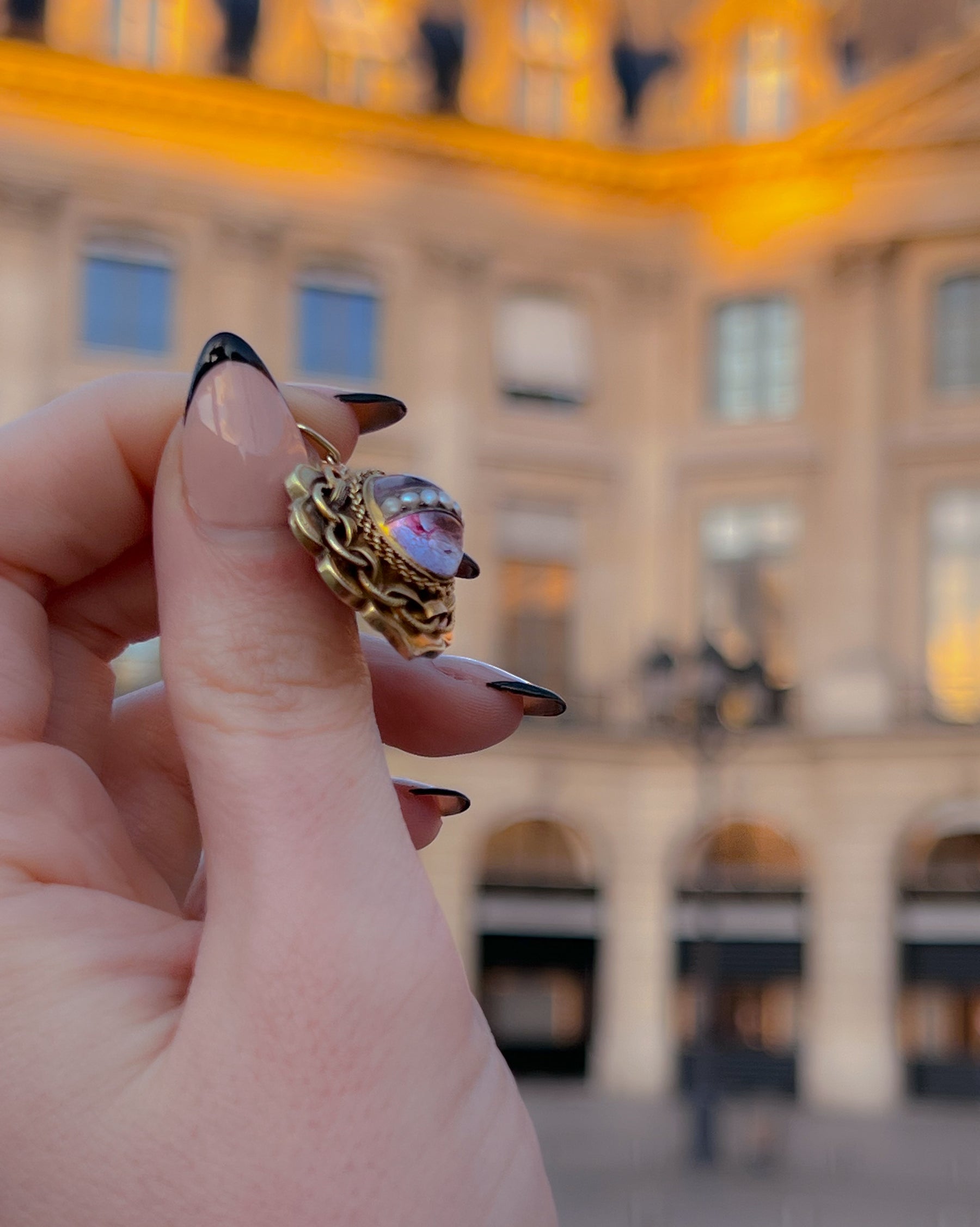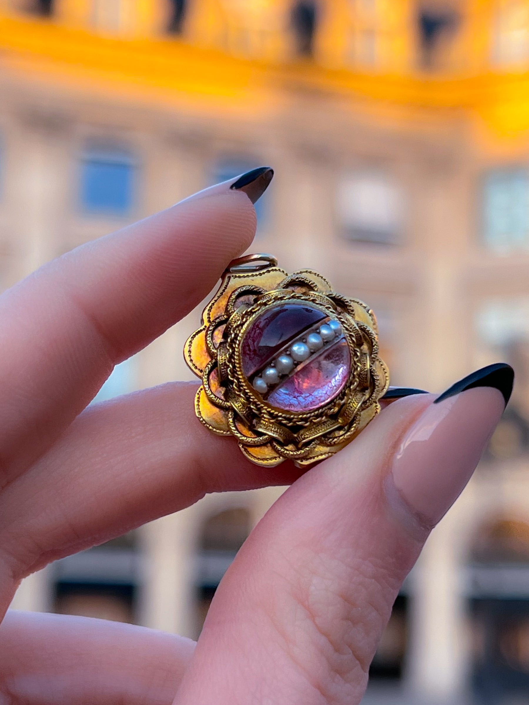An outstanding blushing pink foiled rock crystal cabochon with pearls set into a magnanimous 15ct English pendant of the Etruscan Revival movement. Circa 1870, this historical heavyweight will captivate all who appreciate her crystal-ball cabochon. In person, she truly glows, the foiling gives her the temperance of an amulet, as though an oracle lives within her.