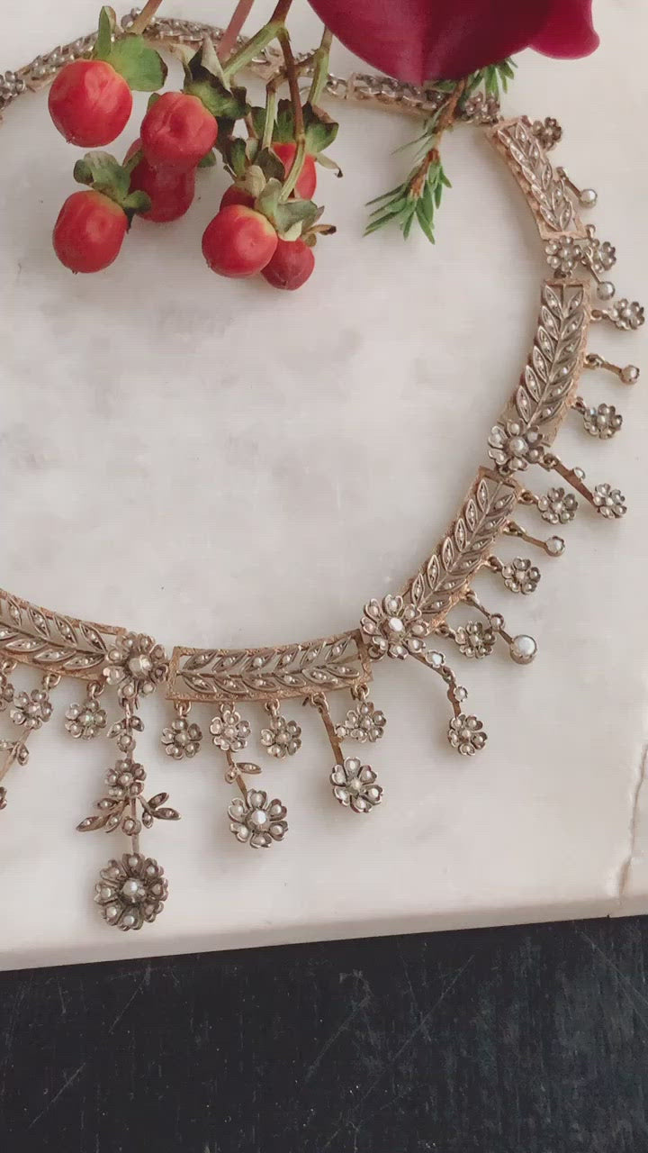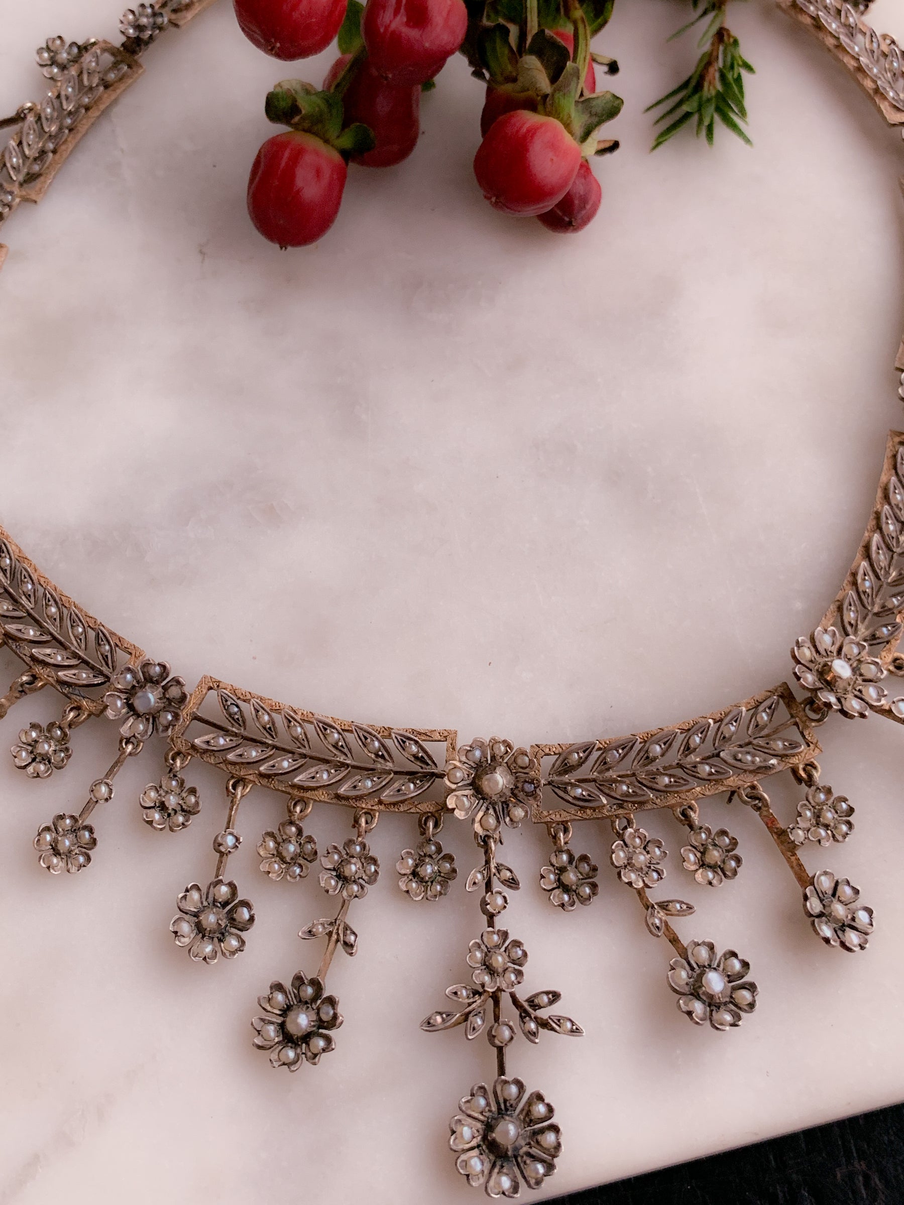 This earlier piece features 14k pink gold, sterling, as well as stunning flower details throughout. A substantial weight, this necklace lays perfectly on the neck, adding a sophisticated statement to any night look, and even more special addition to any collection.