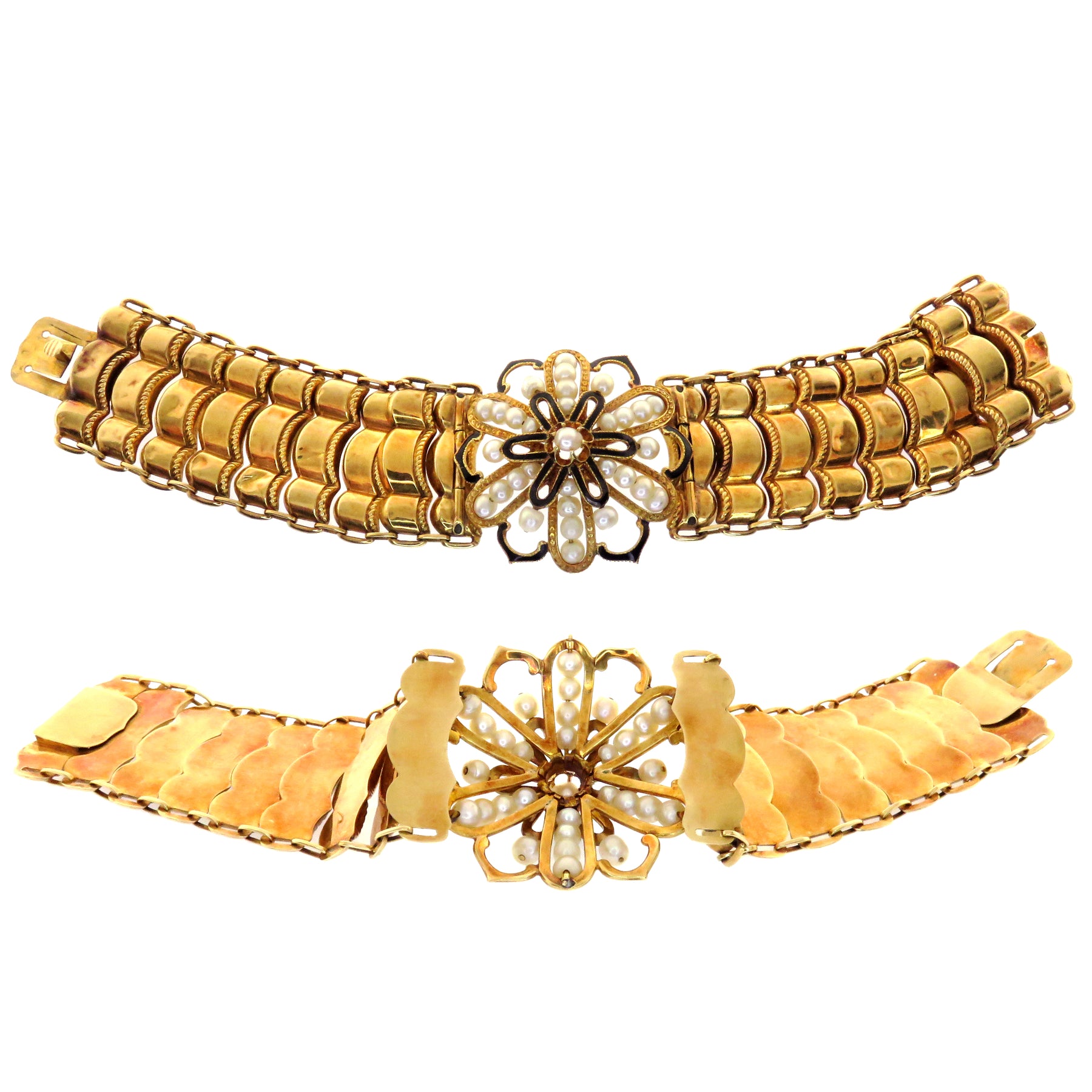 Condition: Note that both bracelets have some minor denting to the gold. All pearls appear to be natural save the central pearls in the earrings and brooch, which are cultured. Overall, the pearls and black enamel are in excellent shape. Minor associated age wear.