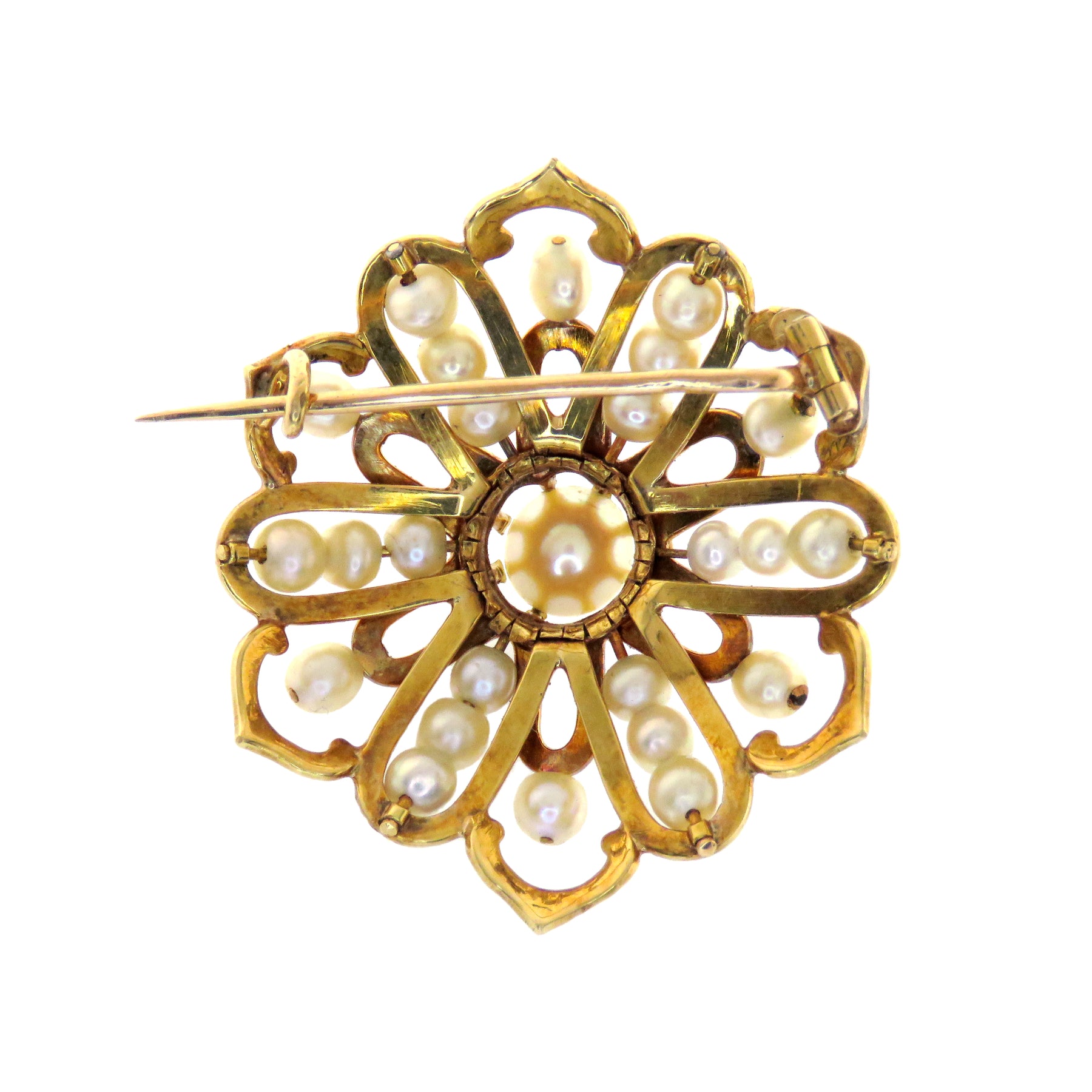 The versatility of this exceptional set of French pearl and black enamel parure reminds us of the ingenuity of 19th century craftspersonship. The two substantial gold cuffs centered on massive pearl medallions can be connected together to form a fully articulated golden collar. The stunning simple black enamel and pearl earrings boast pointed arabesques and center on delicious cultured pearls. The brooch features yet another blooming pearl cluster reminiscent of an Indian mandala, which harkens to the Eastern influence felt strongly in French bijouterie of the mid 19th century. Other elements of “Oriental” design enjoy homage in this outstanding set. Fit for a duchess.