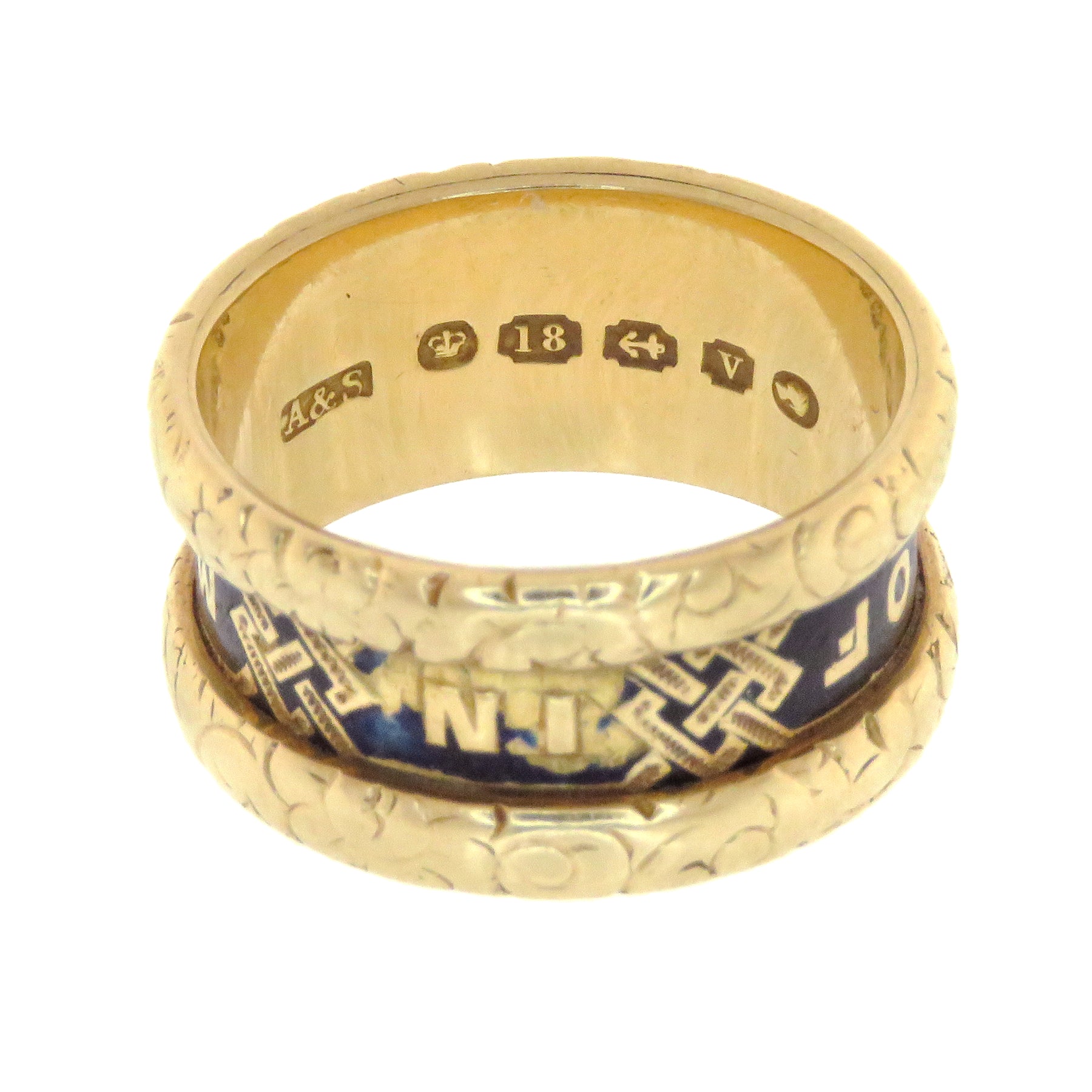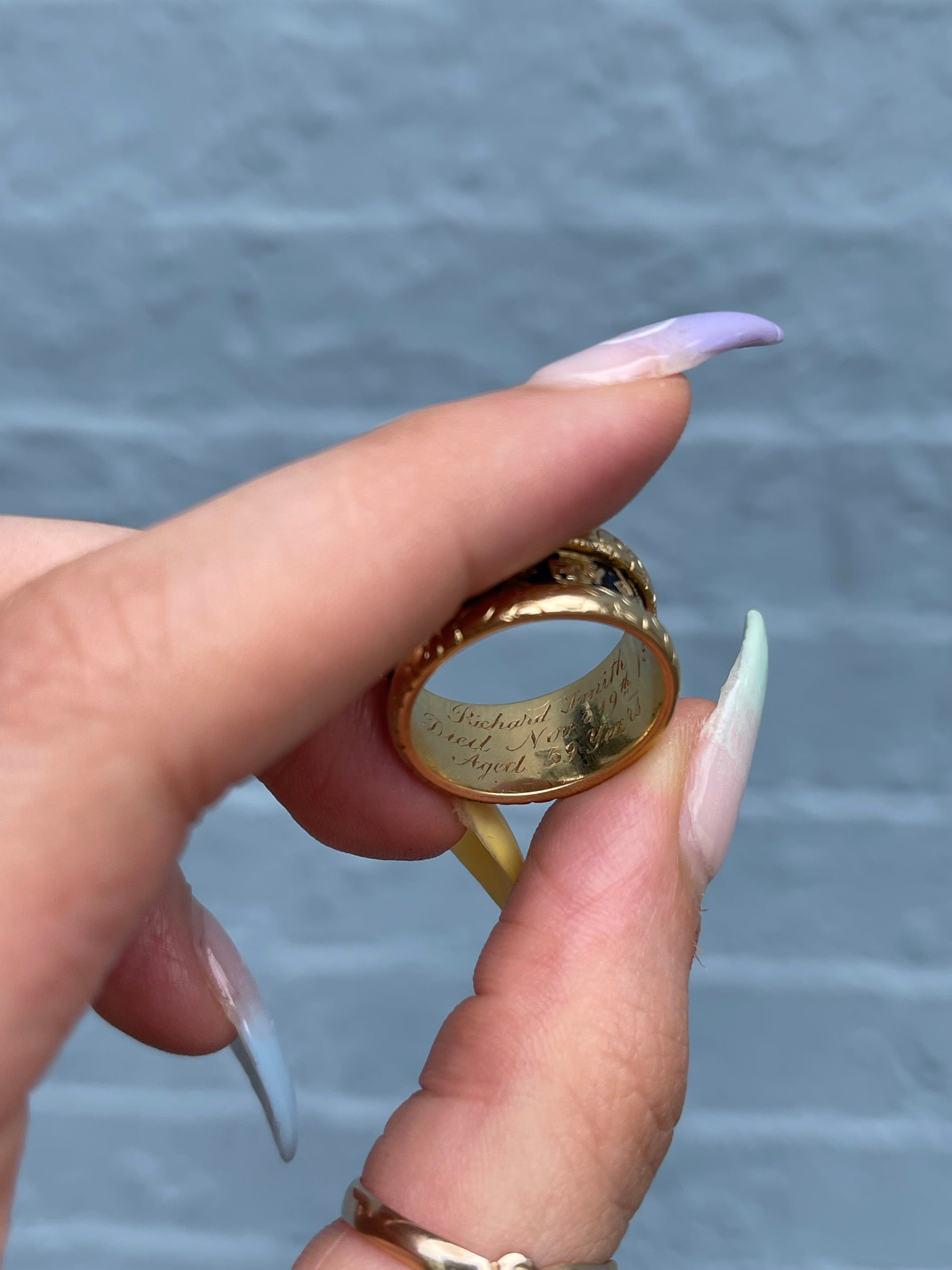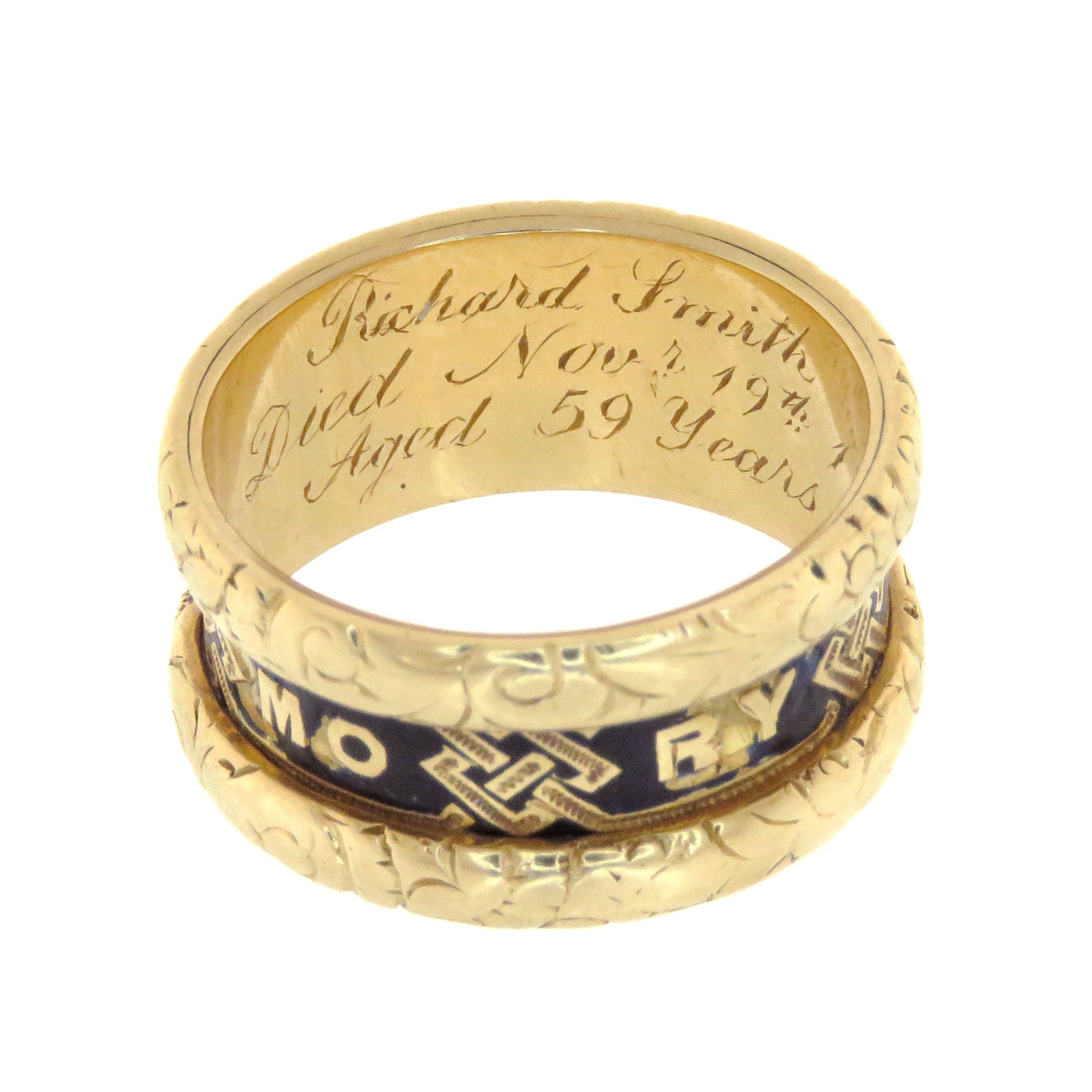 An exceptional mid 19th century memorial ring with a very rare love knot motif on spaces throughout, this stunning Victorian 18ct example has the most beautiful text and inscription. Commemorating the passing of Richard Smith in 1869, the sentiment of this ring is both haunting and sweet; the love knot likely indicates that the ring was made for his life partner left behind. As the enamel is in black, we can be assured he was married.