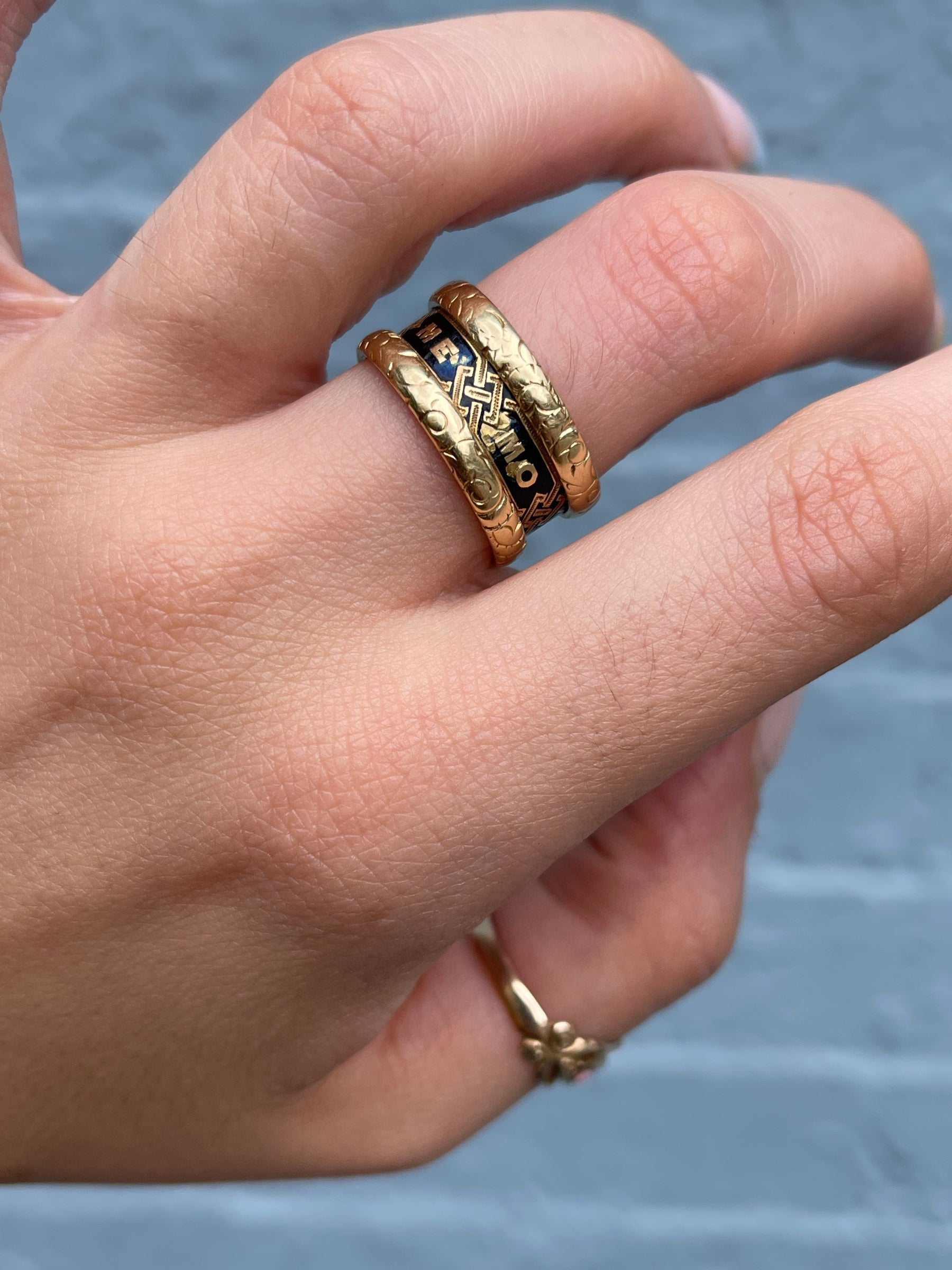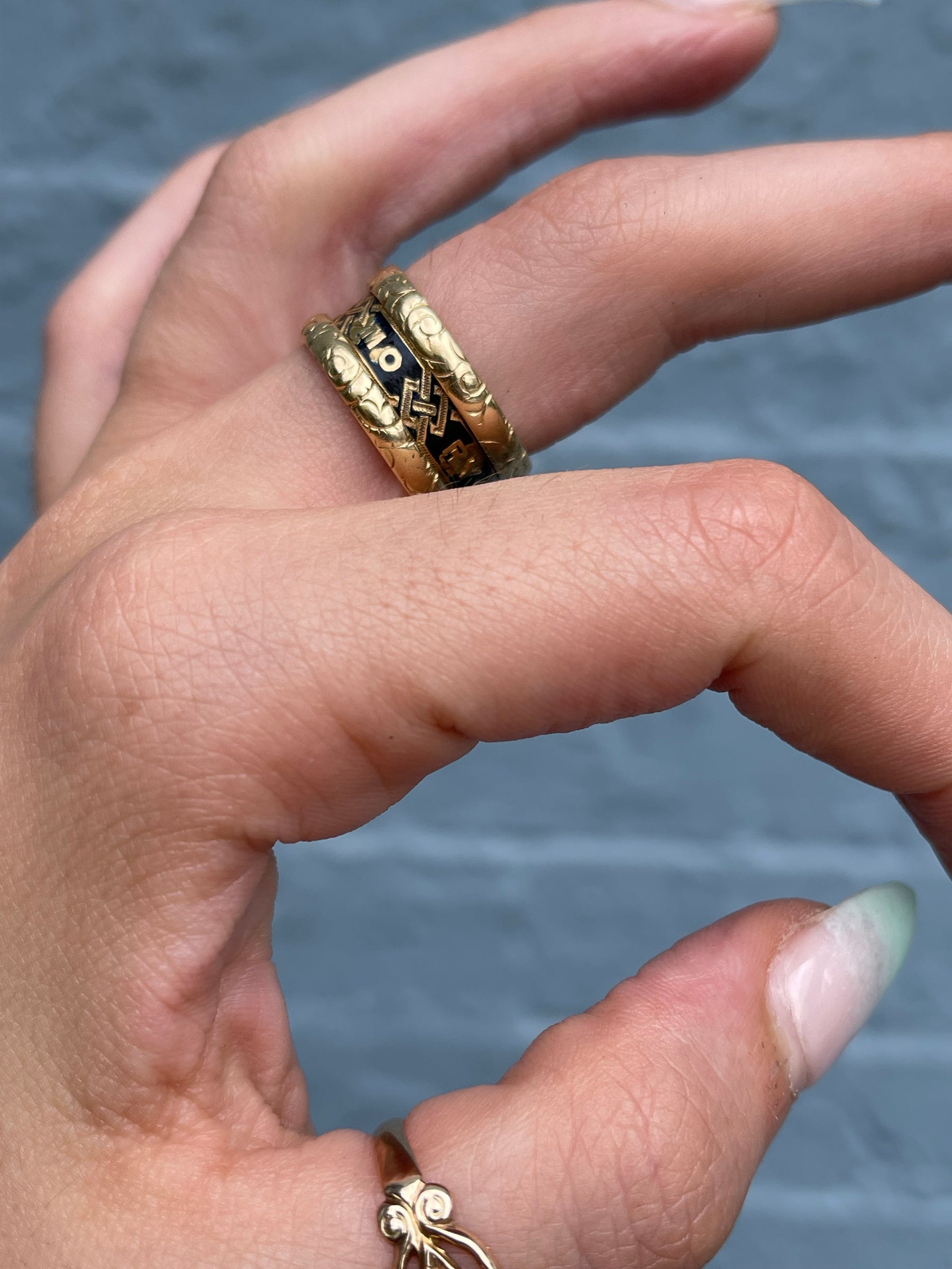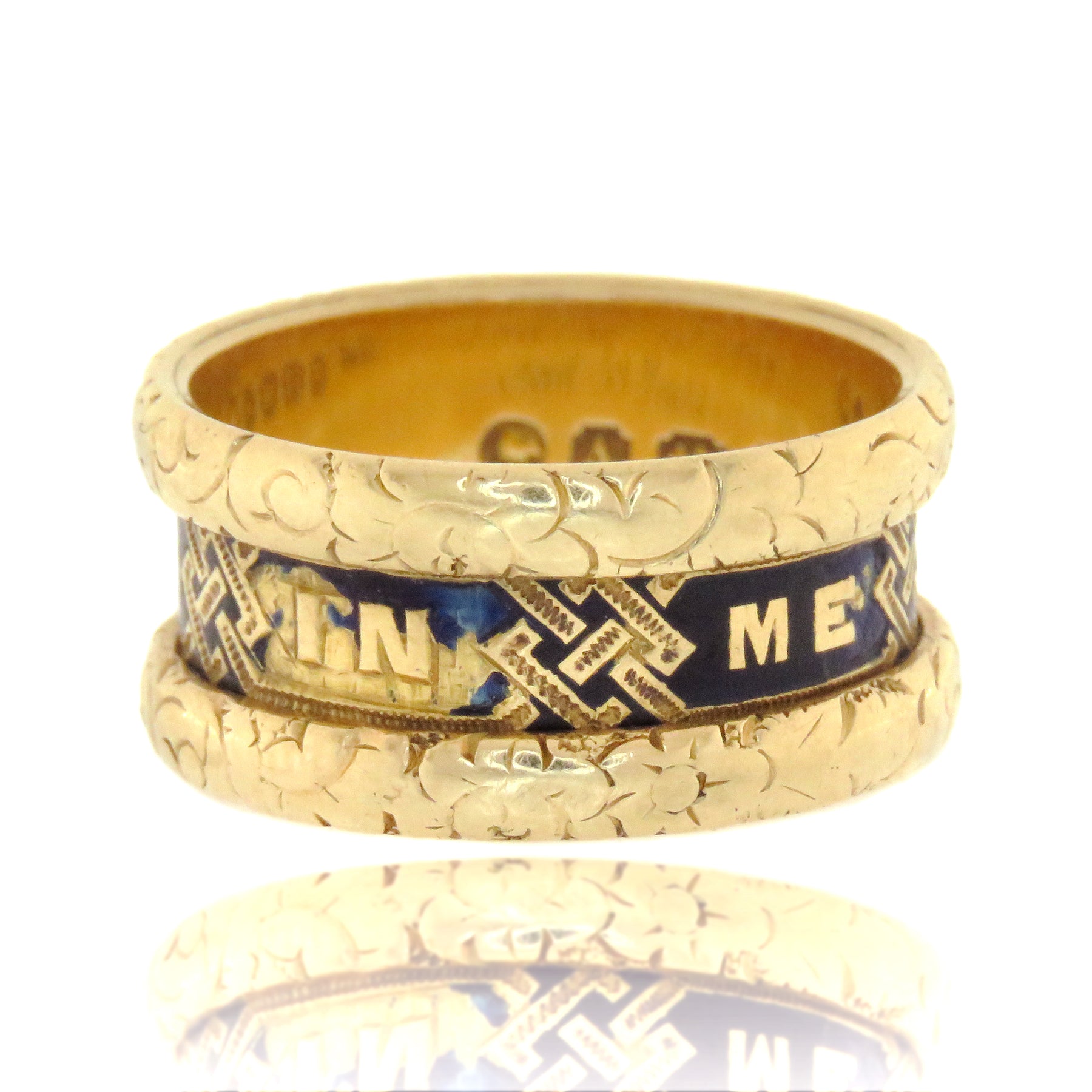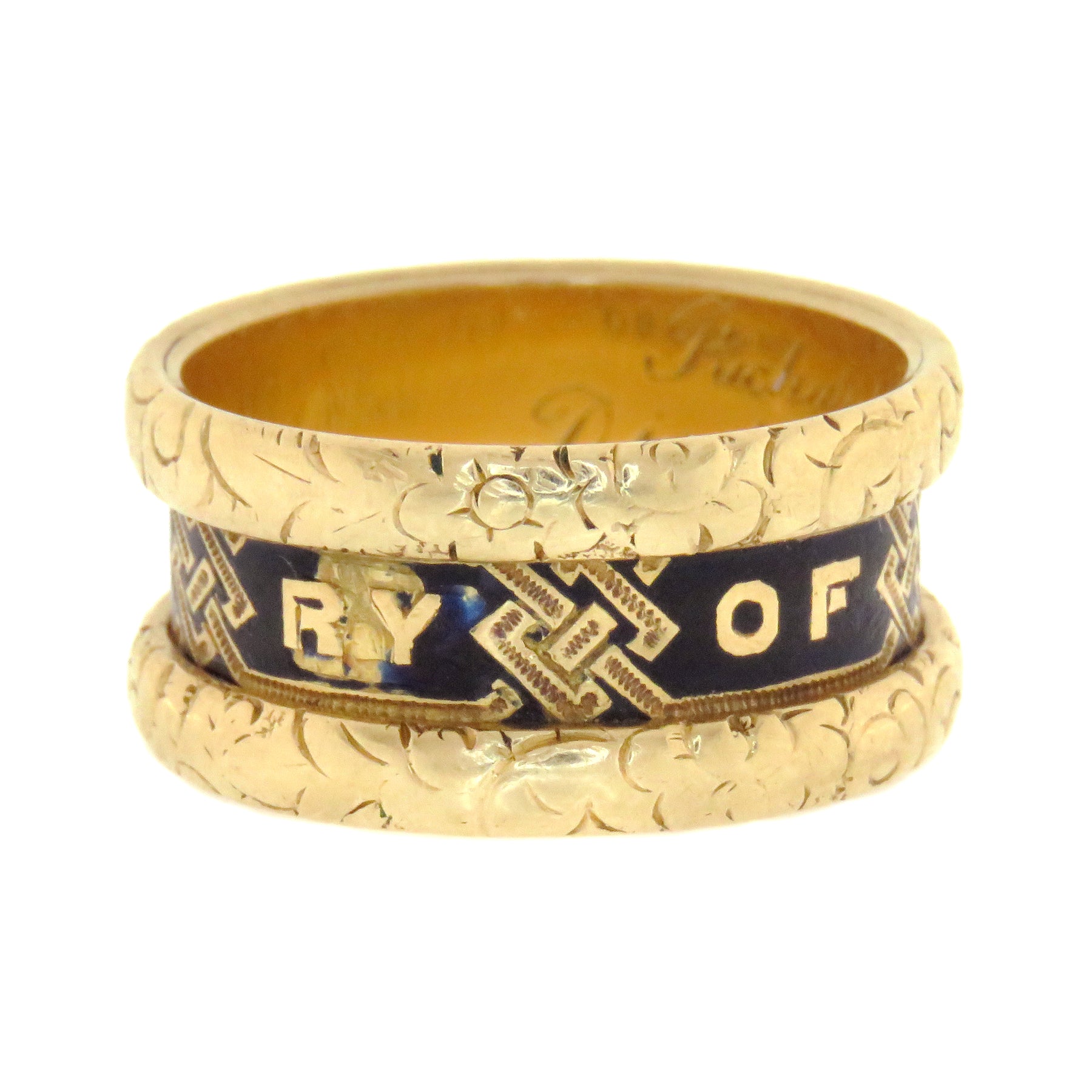 An exceptional mid 19th century memorial ring with a very rare love knot motif on spaces throughout, this stunning Victorian 18ct example has the most beautiful text and inscription. Commemorating the passing of Richard Smith in 1869, the sentiment of this ring is both haunting and sweet; the love knot likely indicates that the ring was made for his life partner left behind. As the enamel is in black, we can be assured he was married.