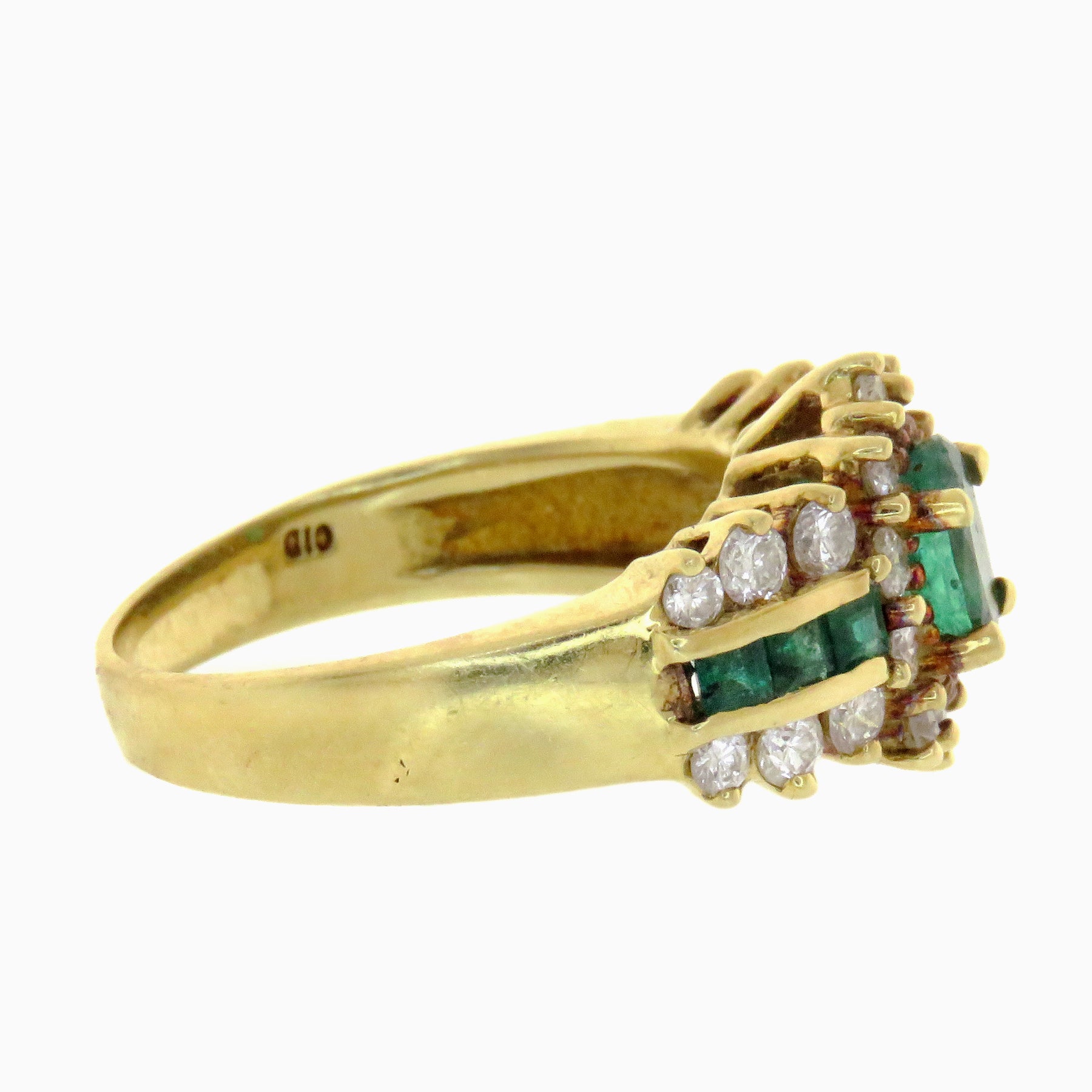 A special vintage halo band ring, this memorable emerald and diamond example is rendered in buttery 18ct. Curated into the Curio collection because of her verdant greens and silky inclusions, the emeralds in this ring defy bing captured by cameras or lights; a certain glow sets the tone for her explosive diamond halo and substantial setting. She truly is an exceptional ring, ready to be stacked and adored.