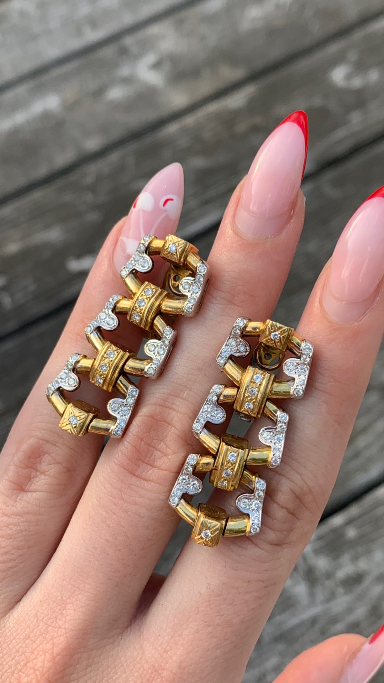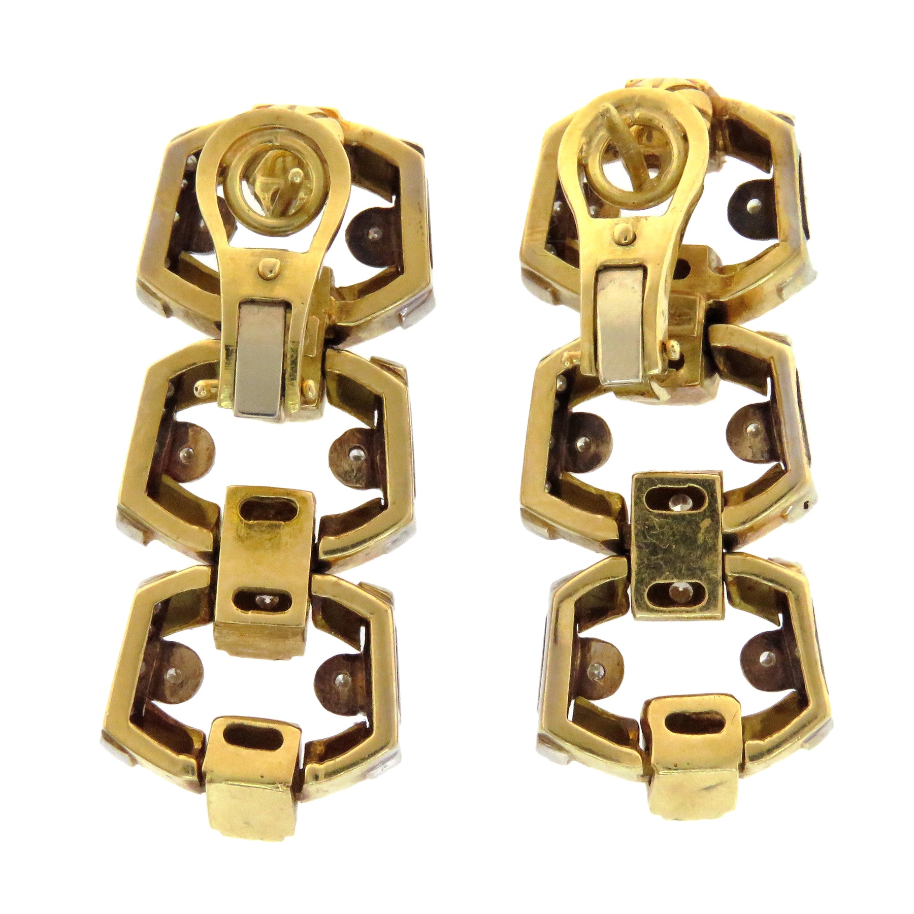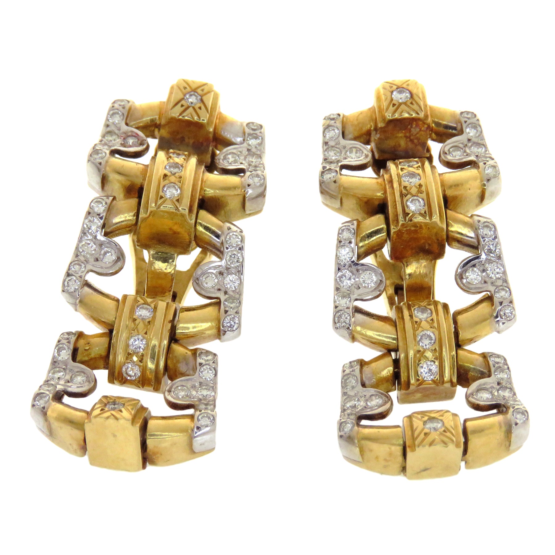 White and yellow gold work harmoniously to create a compelling contrast studded with diamonds and station shapes to craft these exceptional couture quality earrings. Substantial yet wearable, these earrings would make a killer mainstay addition to any collection.
