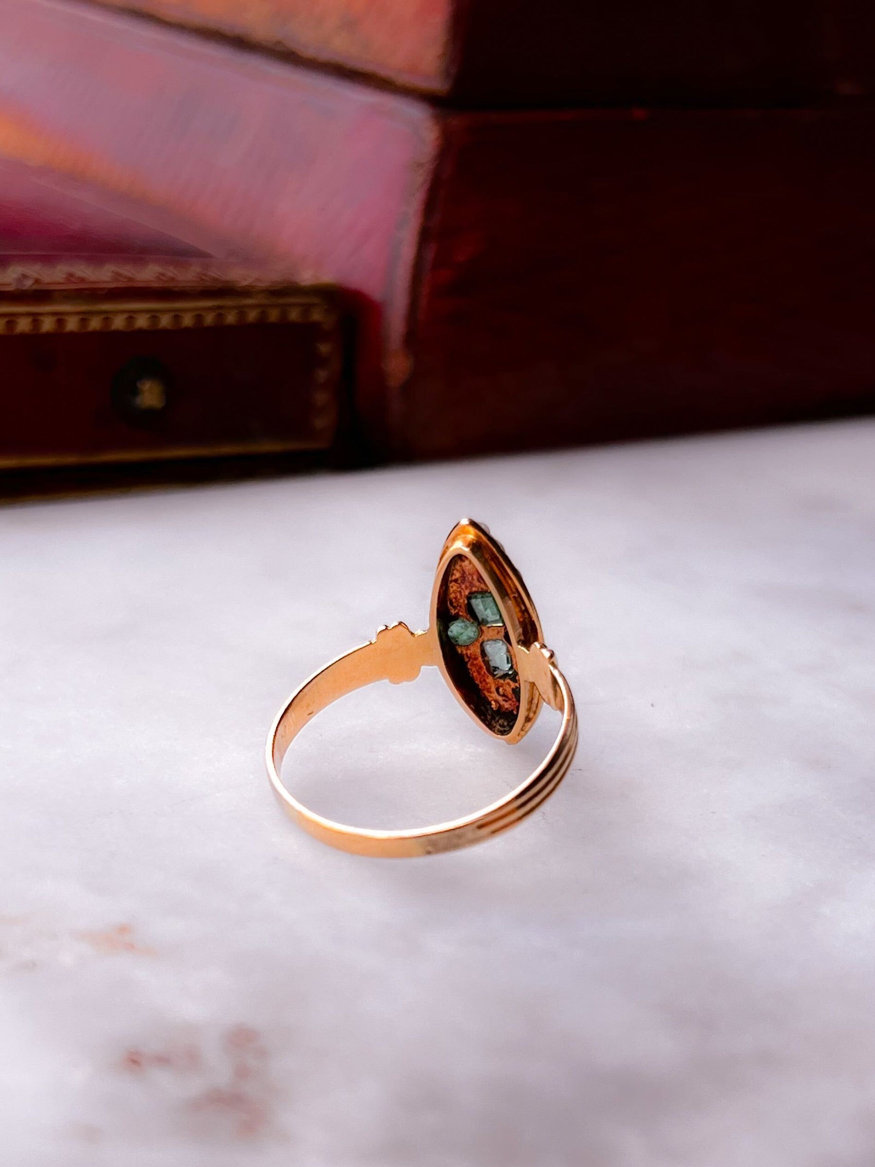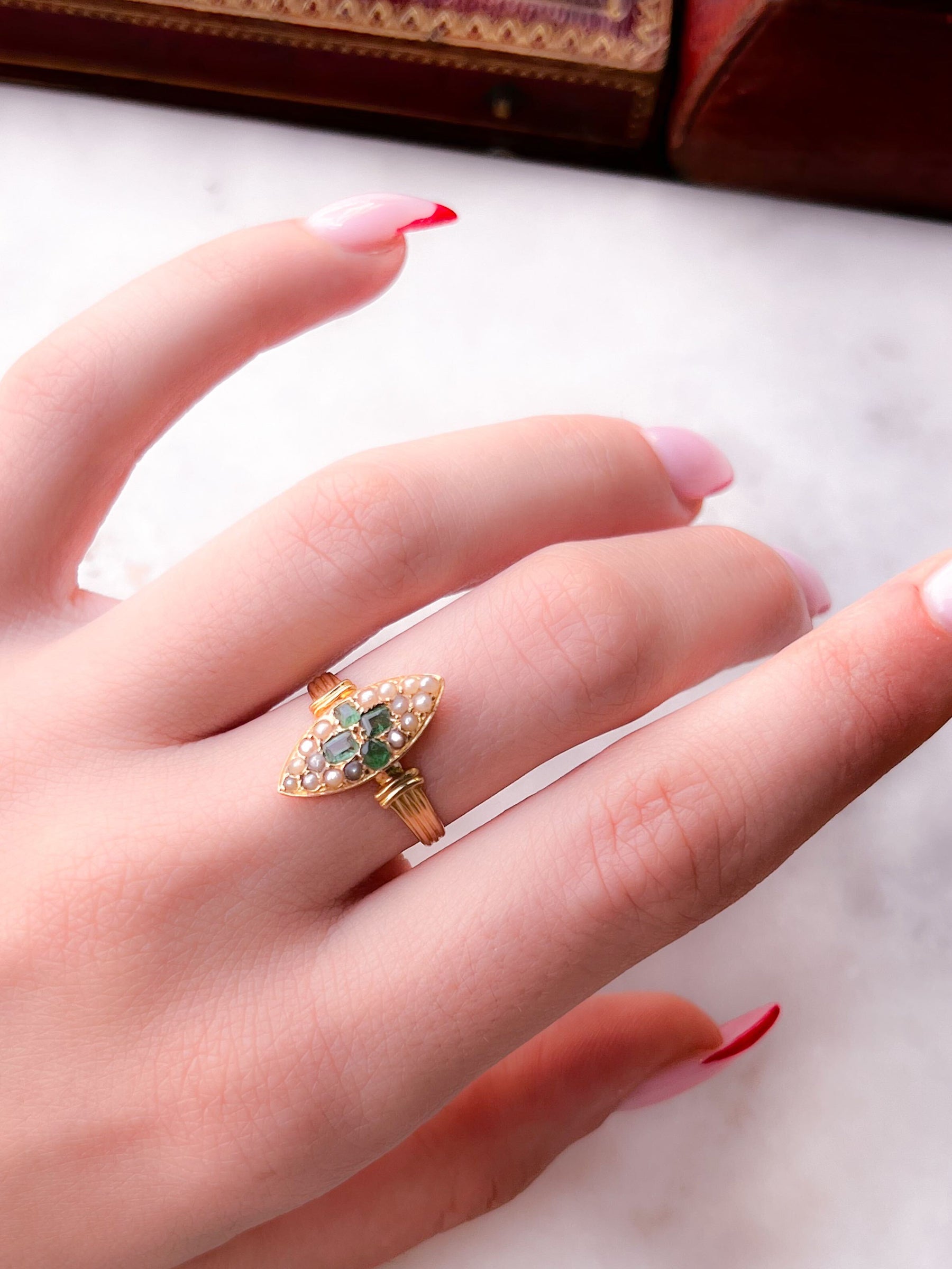 Featuring a gorgeous natural emerald cross, this special navette features a fascinating intersection of gothic (cross/shape/pearls) aesthetic with a neoclassical (reeded band/ionic detail) finish, that was quite classic to Napoleon III period jewels. Circa 1860, French attributed as the hallmark has perhaps been sized out.