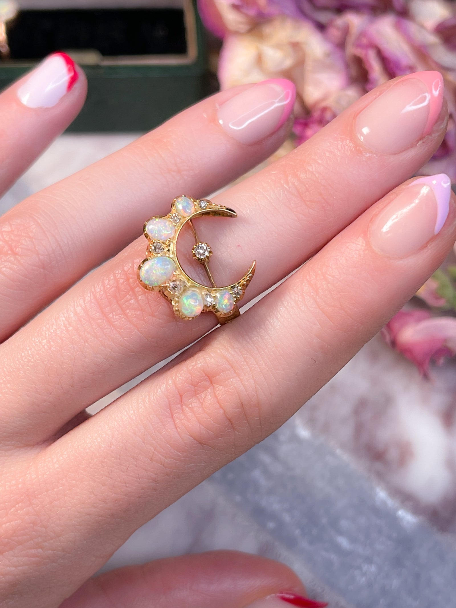 This gorgeous ring can shine on its own, with the help of its five Australian opals that shine beautifully in any light. Additionally, the floating-like diamond in the center of the crescent adds the sweetest touch. Wear this when you need to feel like the goddess you are (every day) and add a new treasure to your collection!