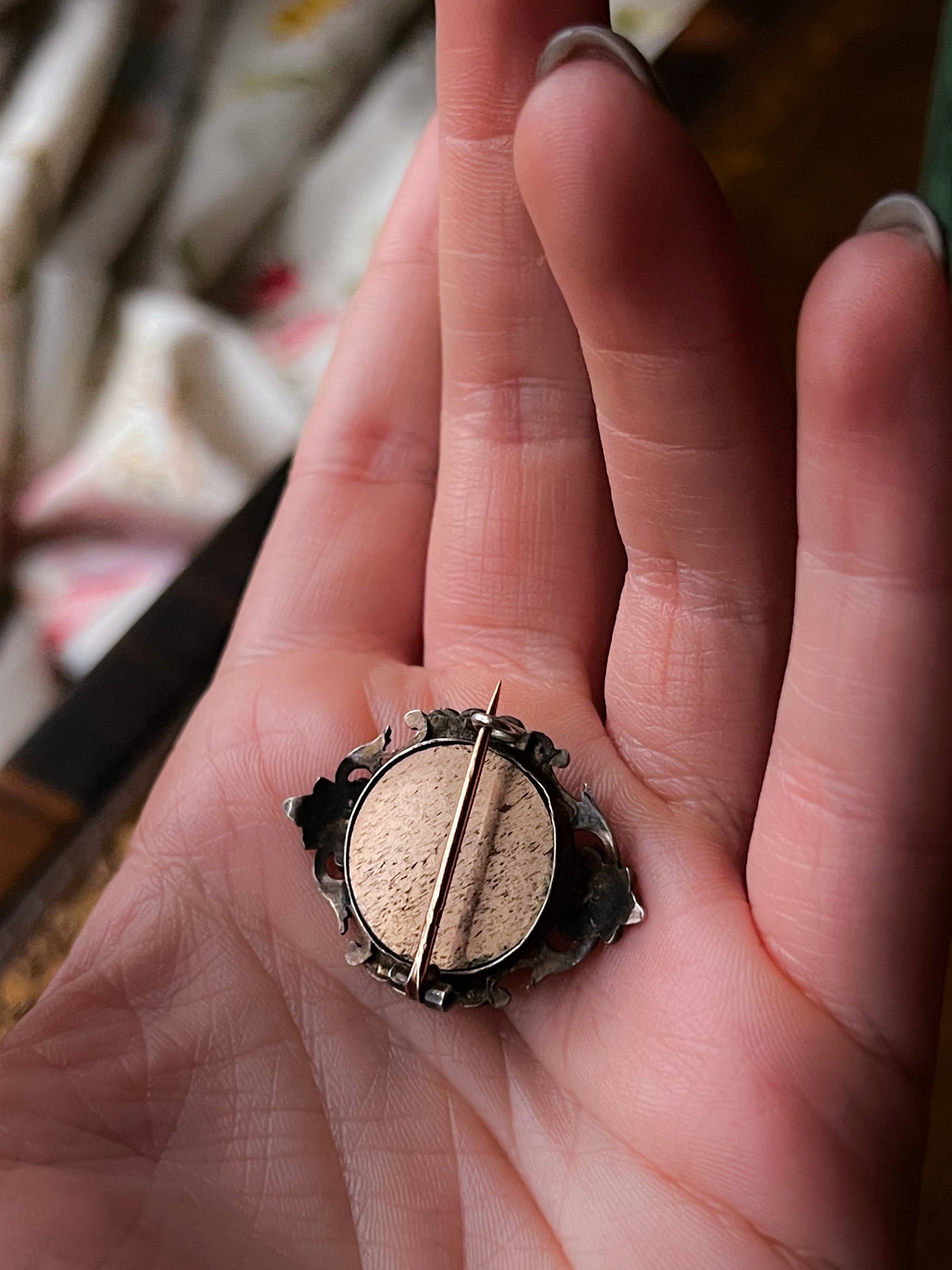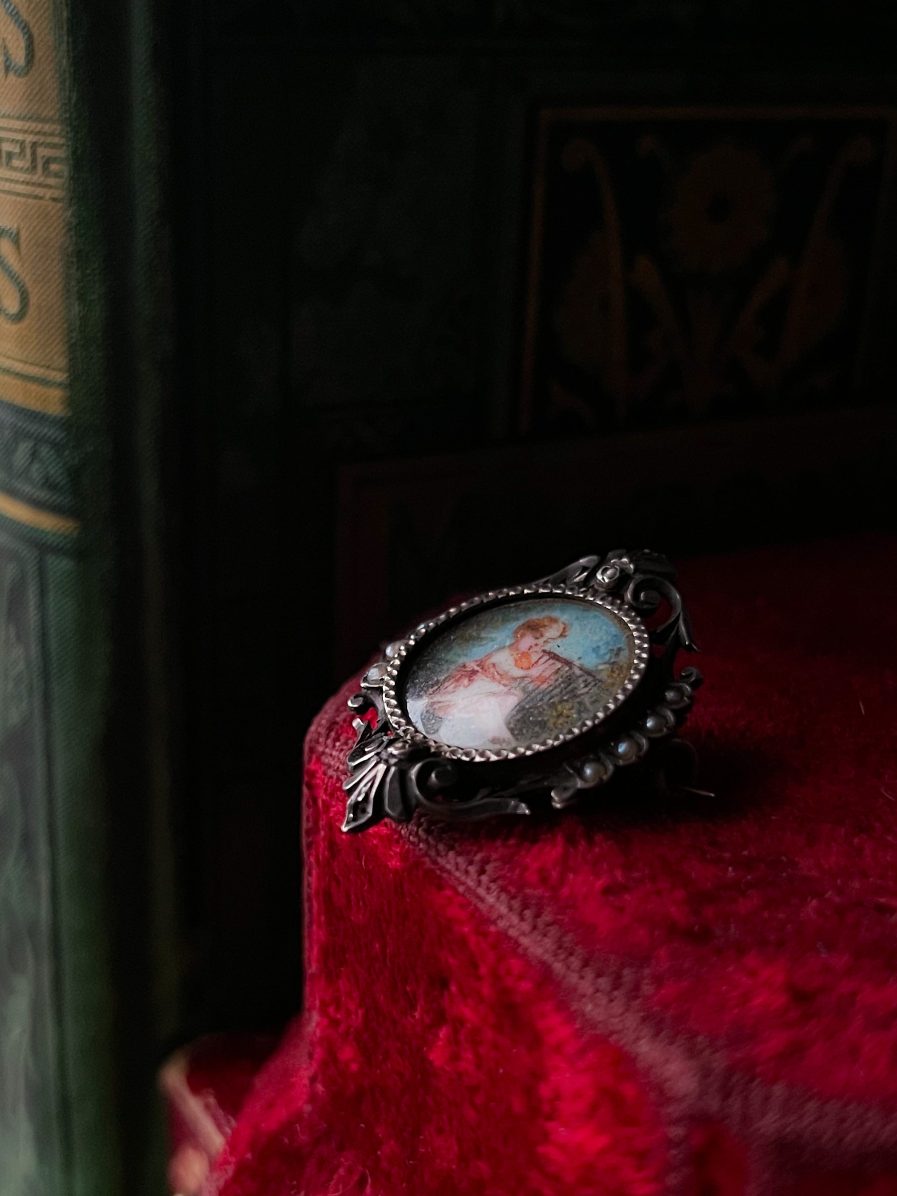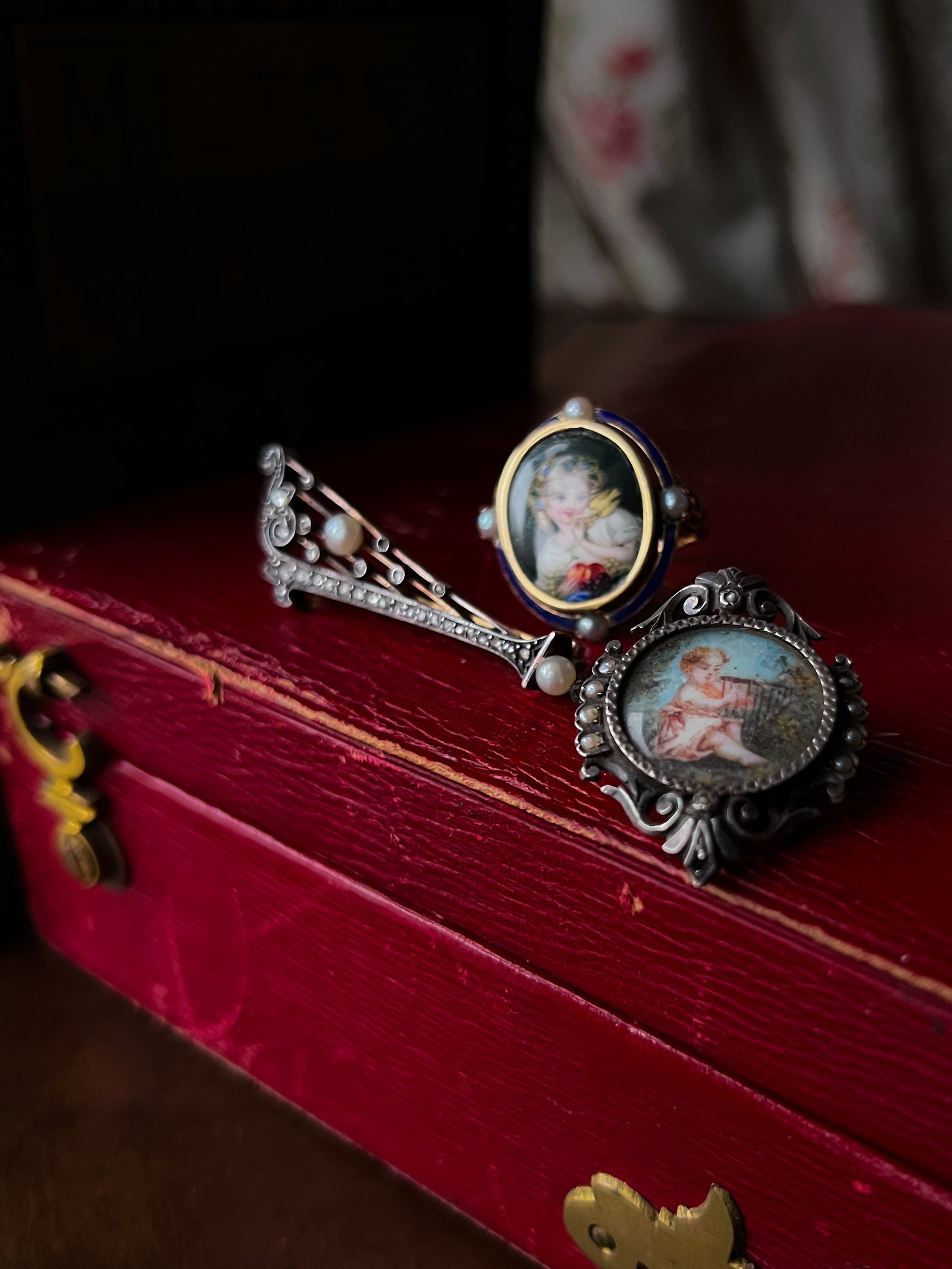 The French Napoleon III period loved romantic depictions of classical Greek and Roman scenes, and this little cherub is a wonderful example of the trend. A tiny, darling, curly-headed child plays a lyre in a bucolic setting on a disc that is less than one inch in diameter! Grandly framed in silver with fleur de lis motifs and accented with natural seed pearls, this piece is a wonderfully sweet trinket you'll want to wear on your favorite sweater as a part of your classical jewelry picture gallery always!