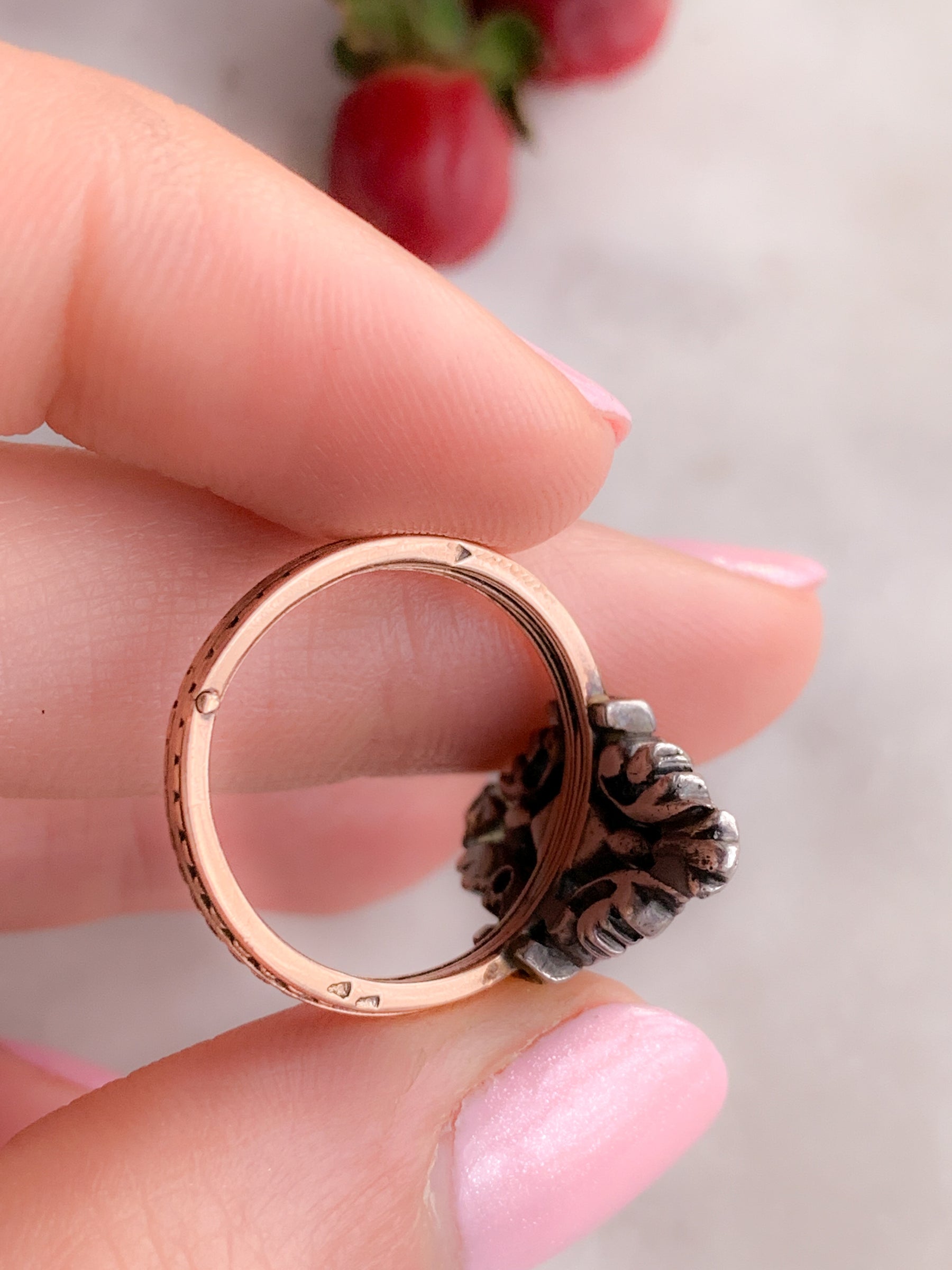 As a special example, this ring features a central amethyst stone, four emerald stones, and glistening rose-cut diamonds - a delicious cluster of gems packed in one heck of a ring. The hallmarked band also features intricate detail throughout.