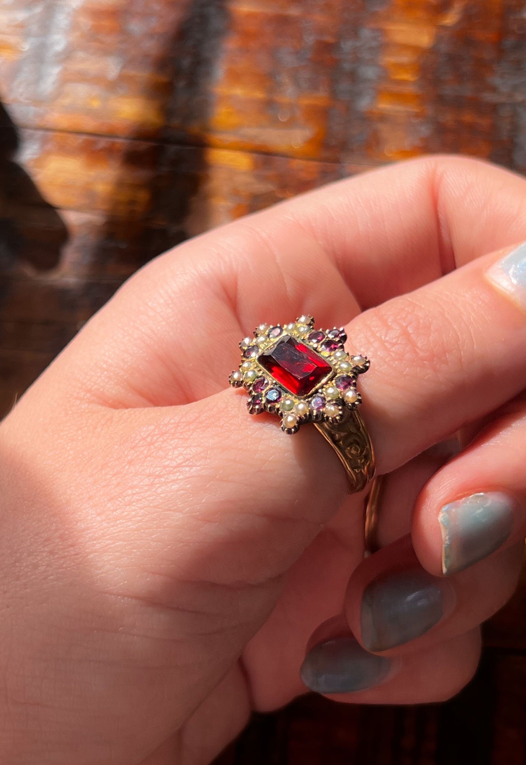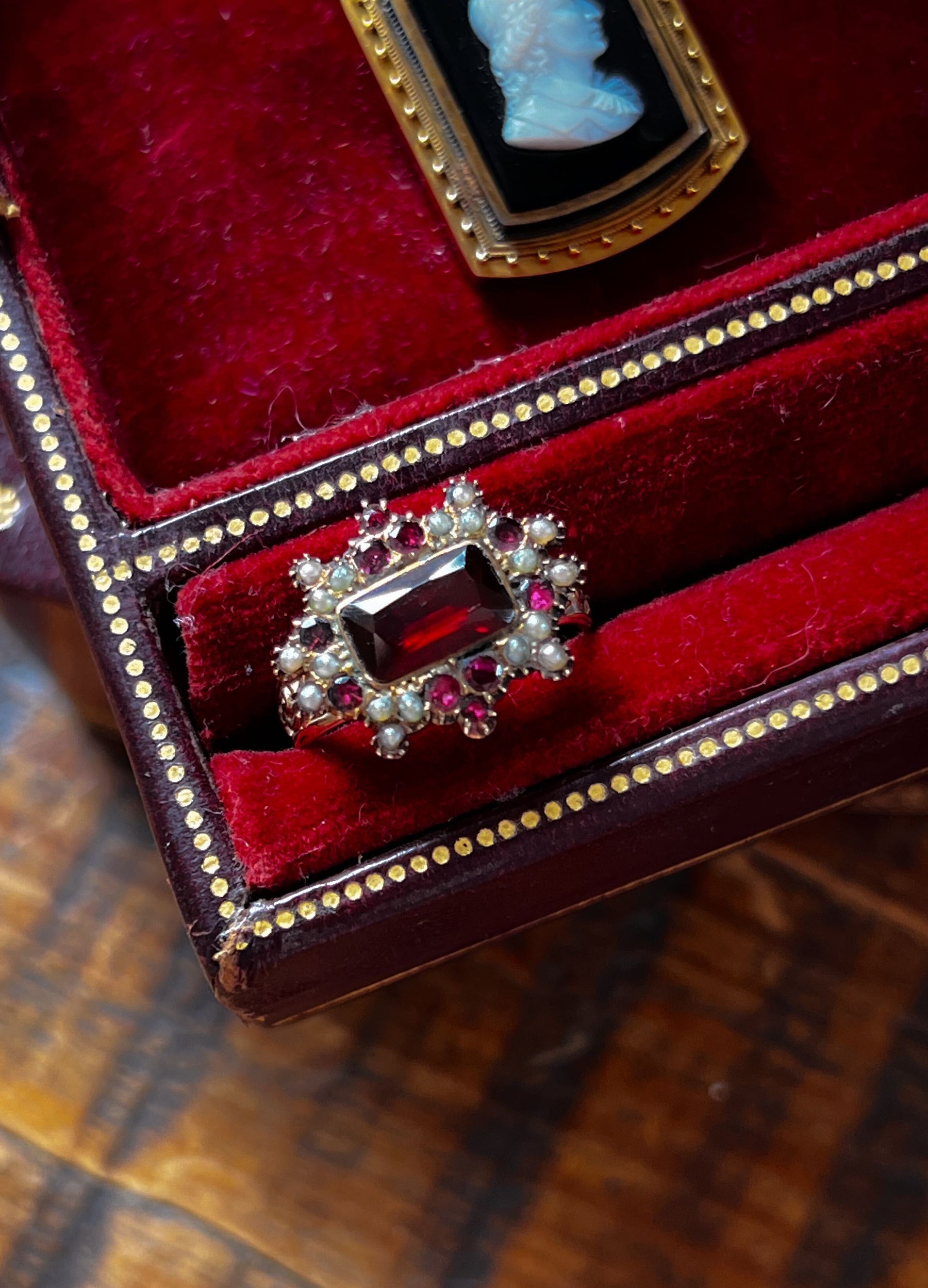 A superb Victorian brooch to ring conversion, this jewel has lived many lives. I imagine that the center once held a locket of hair, upgraded to an extraordinarily saturated, custom-cut garnet. The pin back was removed, but the glass locket was intact, she then became a ring, set with a 14K shank.