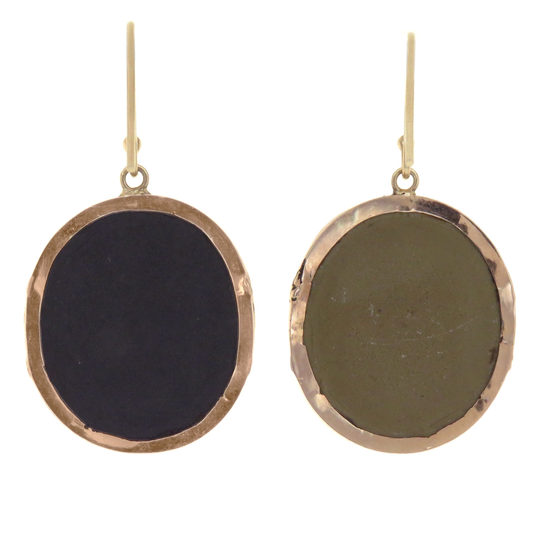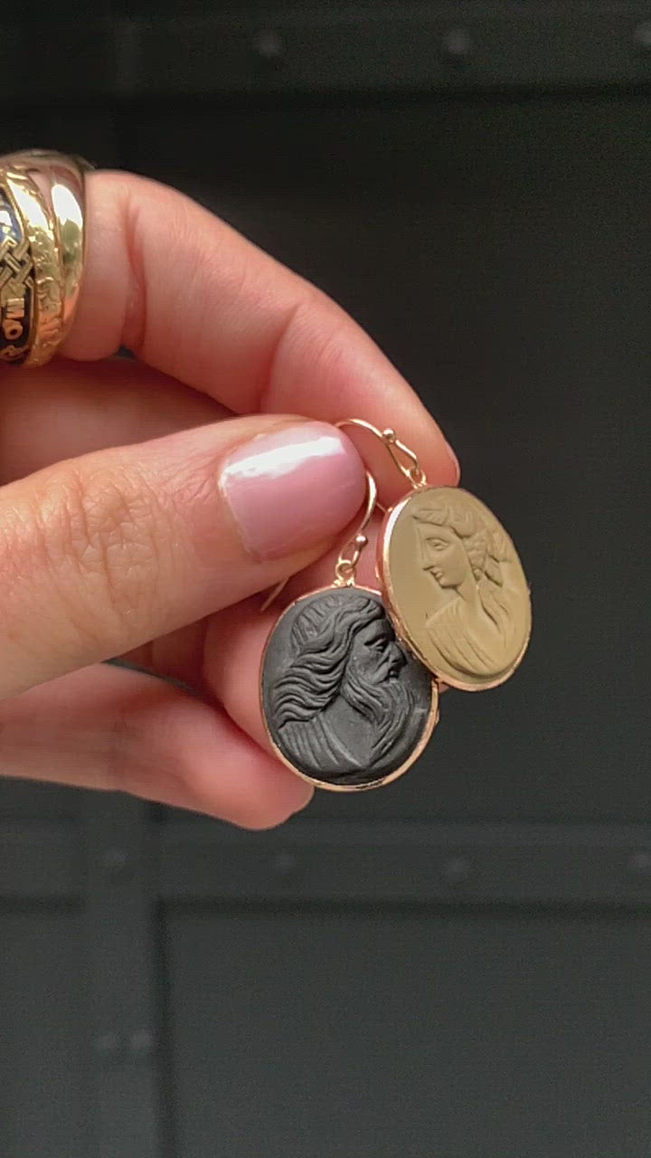 A special pair of lava grand tour earrings featuring a portrait of Zeus, the mighty frat king of Mt Olympus and a lovely bacchant maiden with grapes woven into her Locks. In contrasting tones of ochre and slate grey, this couple gives eternal summer energy.