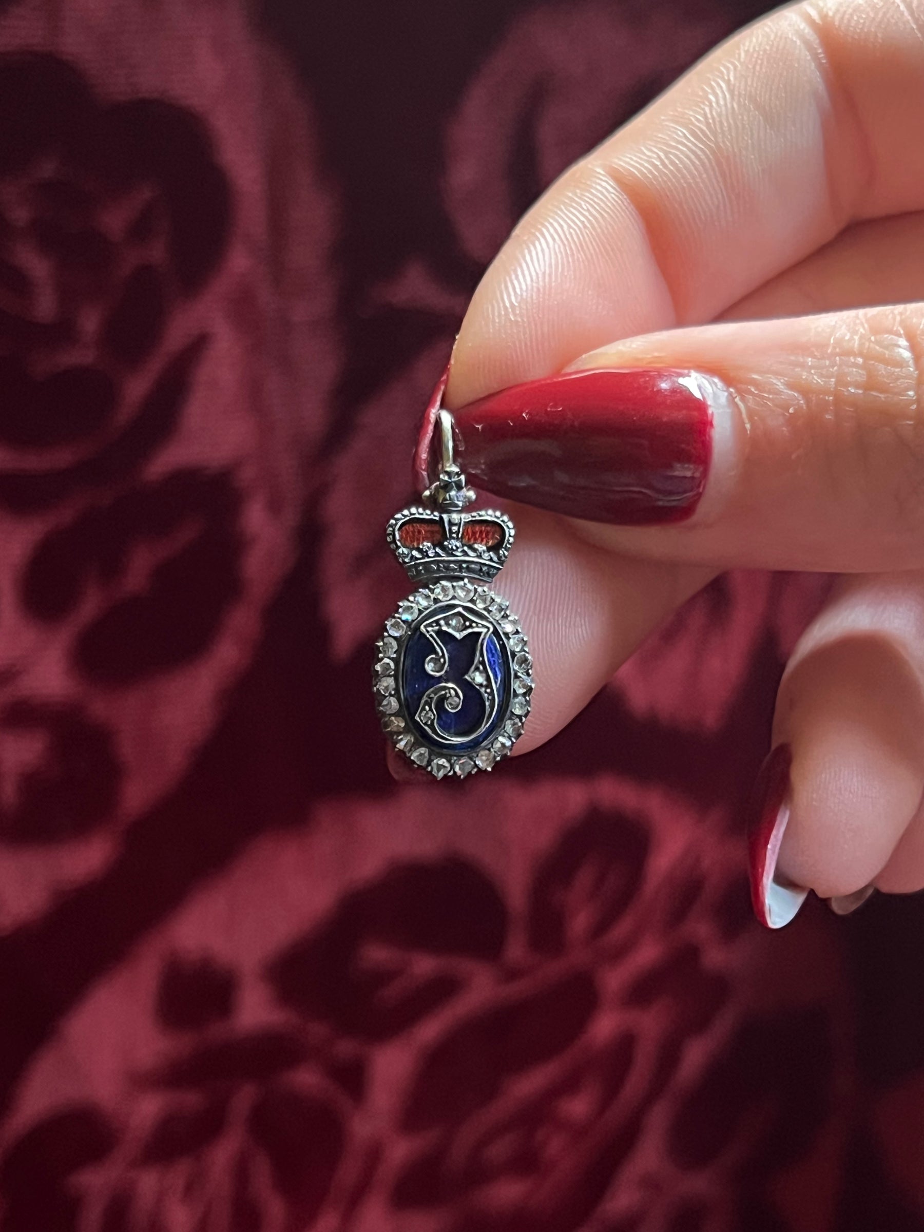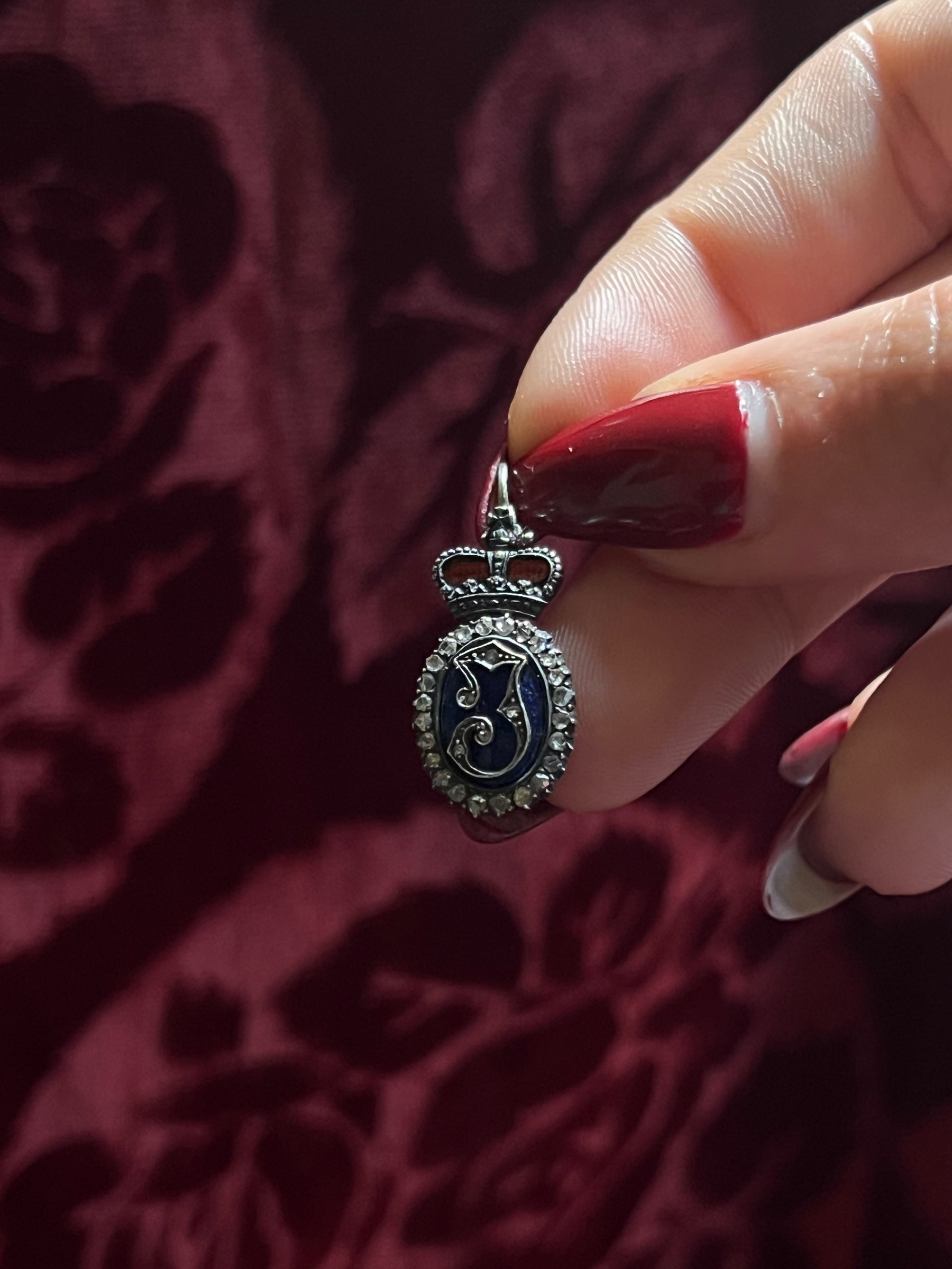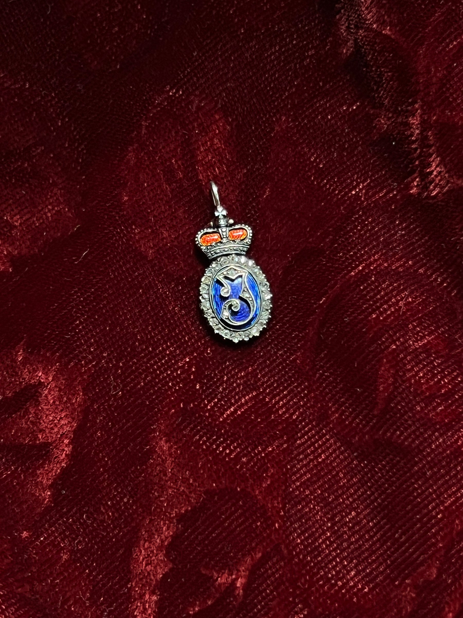 Crafted circa 1880 in 18 carat pink gold and sterling silver, this piece is a fine English example. The J initial in the center is designed in a scrolling Gothic style typeface, which creates a stylish juxtaposition against the vibrant blue enamel backing. Halo’ing the blue enamel are the sweet miniature rose-cut diamonds, adding a touch of starry glamour.  The pendant is topped by a sterling silver crown motif set against red enamel and featuring intricate detailing. The result is a glittering silhouette that feels truly fit for a royal!