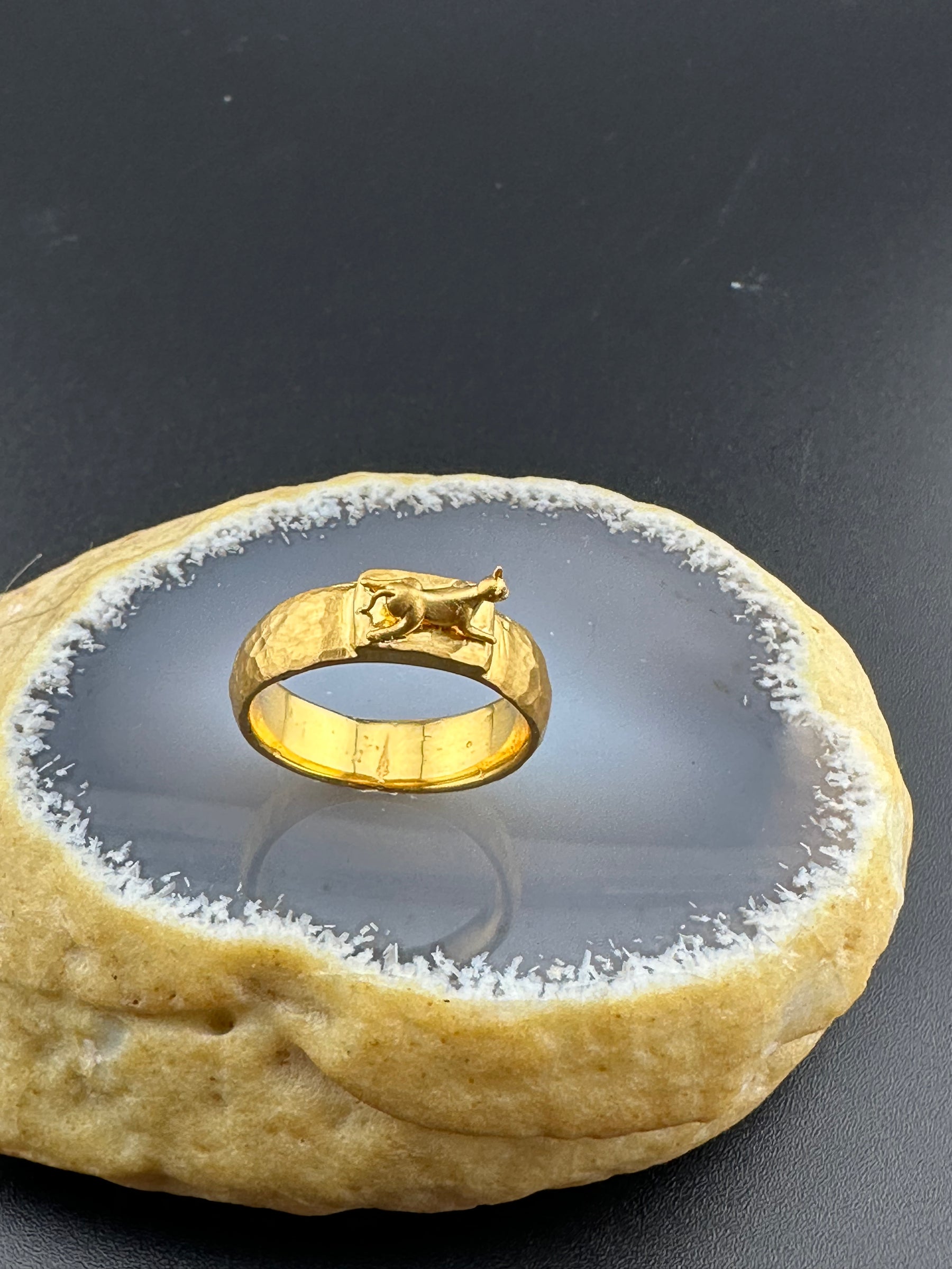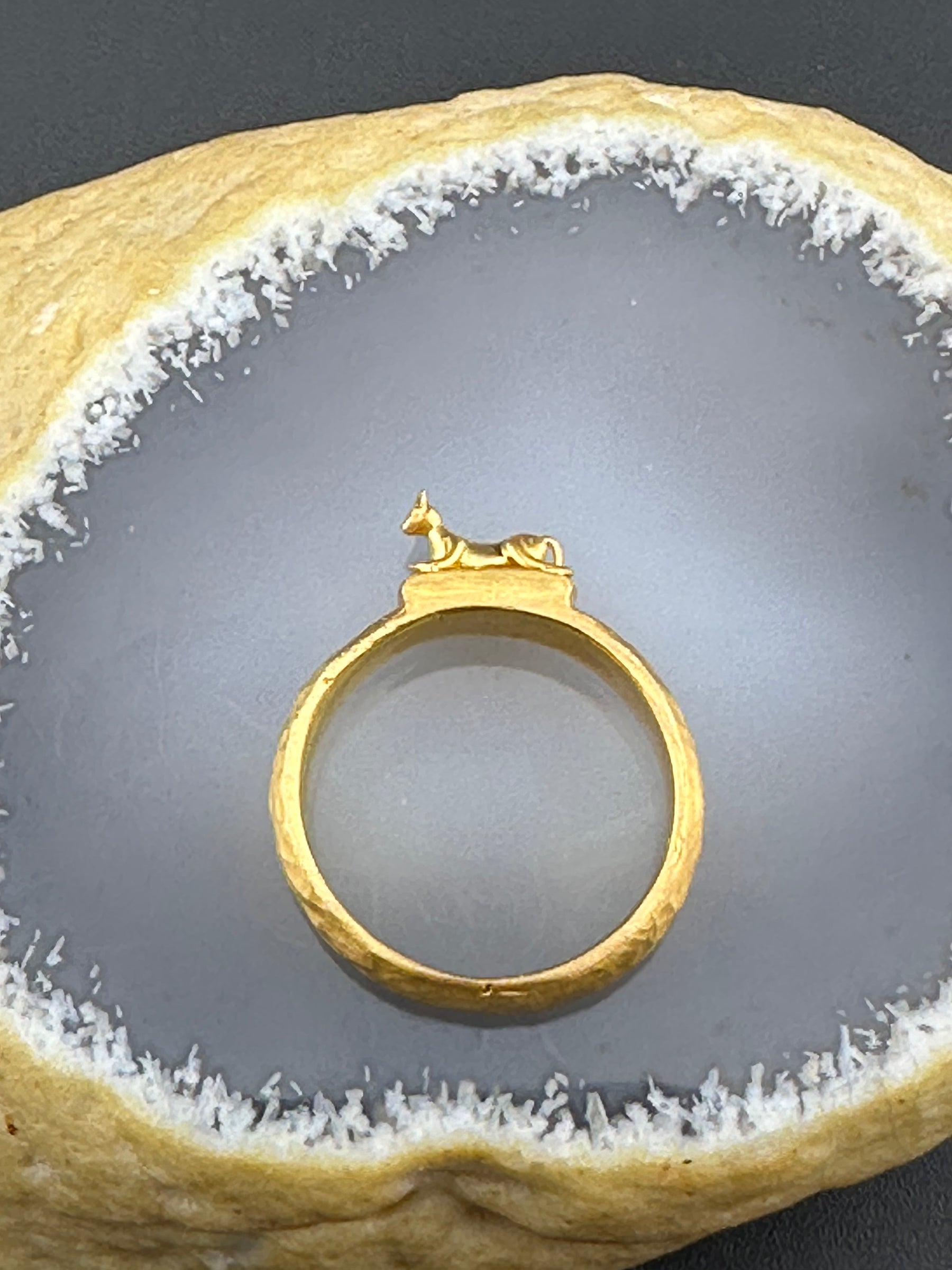 This kitty cat ring is one of the first Curious NYC artifacts, featuring a hand wrought cat in the style of Bast emerging from a 20ct buffed band, in the style of a hand hammered troy ounce ring.