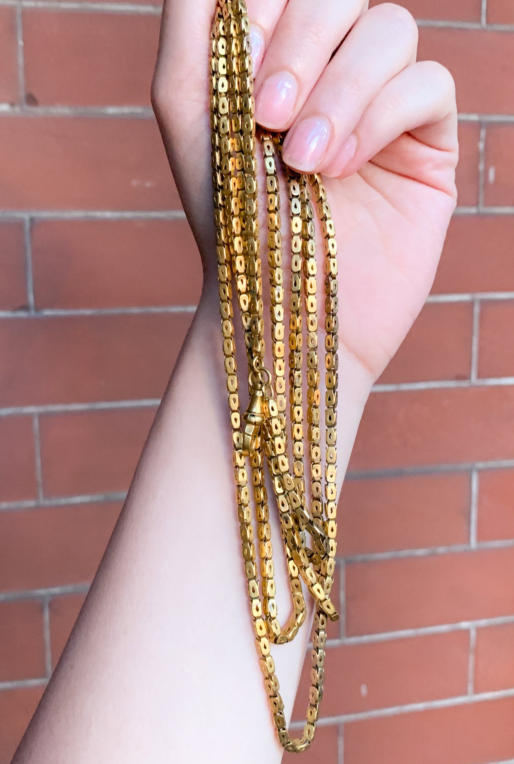 What an amazing example of an early Victorian long guard- particularly in the coveted 55ā€ length. We almost never find exceptional chains of this era, especially in all original condition with fully articulated links; this chain almost needs to be touched to be believed. Like an amorphous river of golden light, this Pinchbeck chain is going to make a landmark addition to any collection focused on special historical pieces.