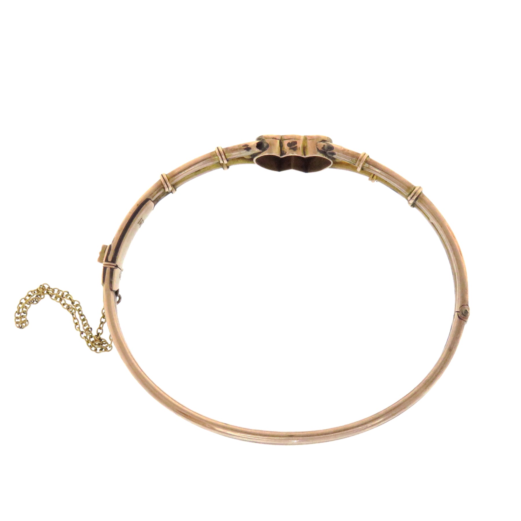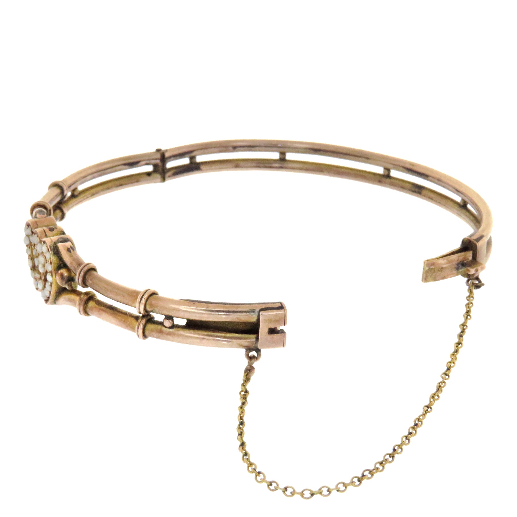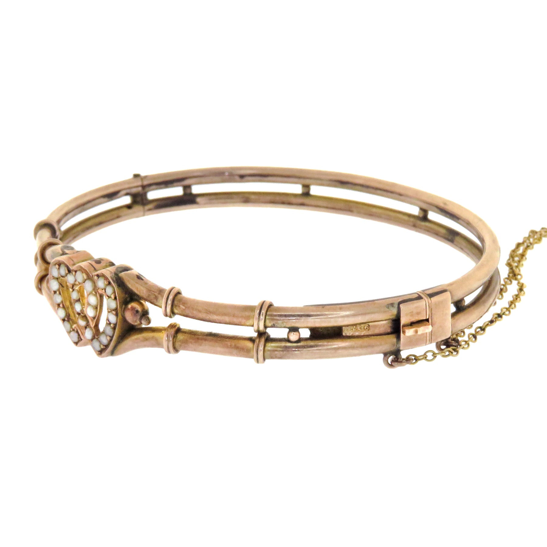 When two hearts beat as one. This sentimental English bracelet shows two entwined hearts set with pearls set in pink gold, to recall the first blush of new love. The symbolic nature of Victorian jewelry is largely unmatched throughout history, and transitioning into the Edwardian period saw an even greater focus on the language of jewels in the expanding vernacular of globalization. I love this bangle and think it will make an outstanding addition to any collection.