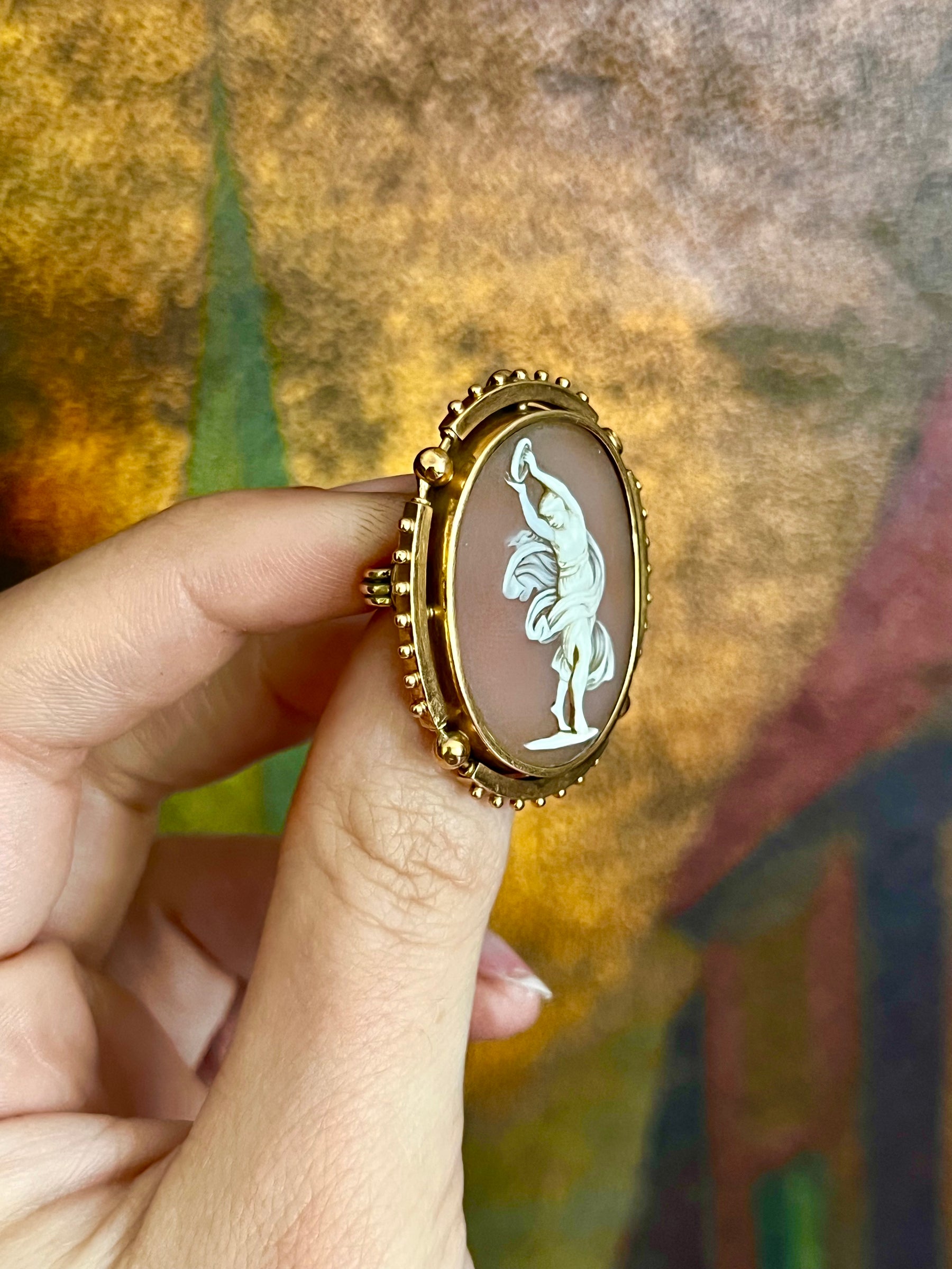 Particularly challenging to find, French shell cameos set in 18ct are things of wonder. Especially from the middle of the 19th century, they posess a different type of archaeological revival aesthetic than English or American jewelry of the era... this French hallmarked example features a boulework decorated frame that terminates in four faceted disco-balls that create further polarity for our star, the Grecian muse, Terpsichore, to dance within. Often considered the most famous muse of the 9 (the others being Clio, Euterpe, Thalia, Melpomeni, Erato, Polymnia, Urania, and Calliope) Terpsichore was the muse of music and dance. While she is more commonly found with a lyre, she was famously painted by Boucher at the end of the 18th century with a tambourine (shown bellow) and later, Limoges did a famous rendering in enamel of her with the tambourine above her head, around the same time this cameo was carved. I absolutely adore this cameo and think it is such a delightful example of the work that France was known for in the 19th c.
