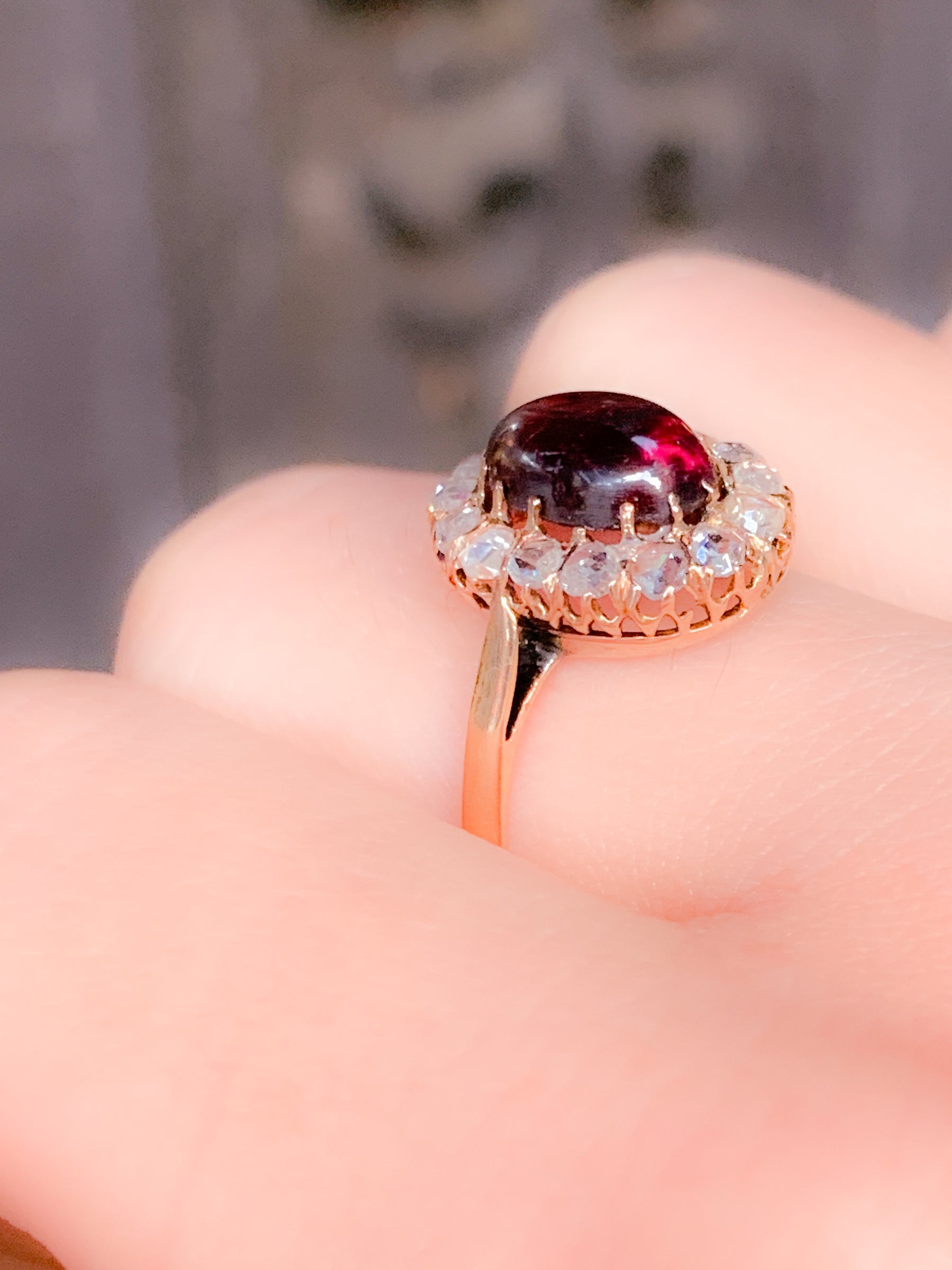What makes this ring so unique is the rarity of the rose-cut diamond halo featured. Additionally, the center cabochob is a delicious deep red, a blushing almandine garnet  of 1.20. This is a ring just waiting to make a statement on your next night out!