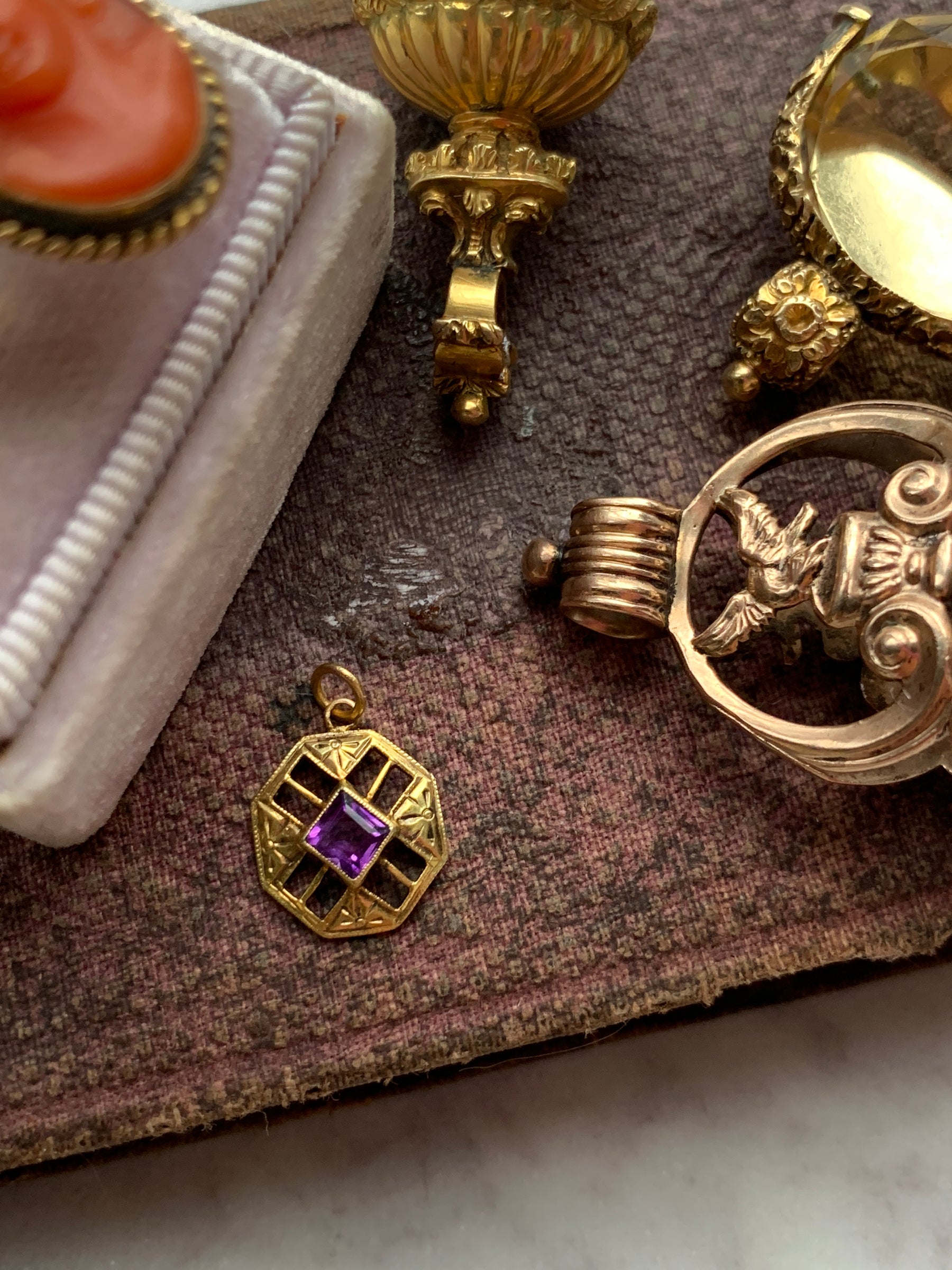 This dainty, detailed pendant features a central diamond-shaped amethyst stone. February's birthstone and said to offer protection and spiritual wisdom, this pendant fits in beautifully in any charm stack in a chain.