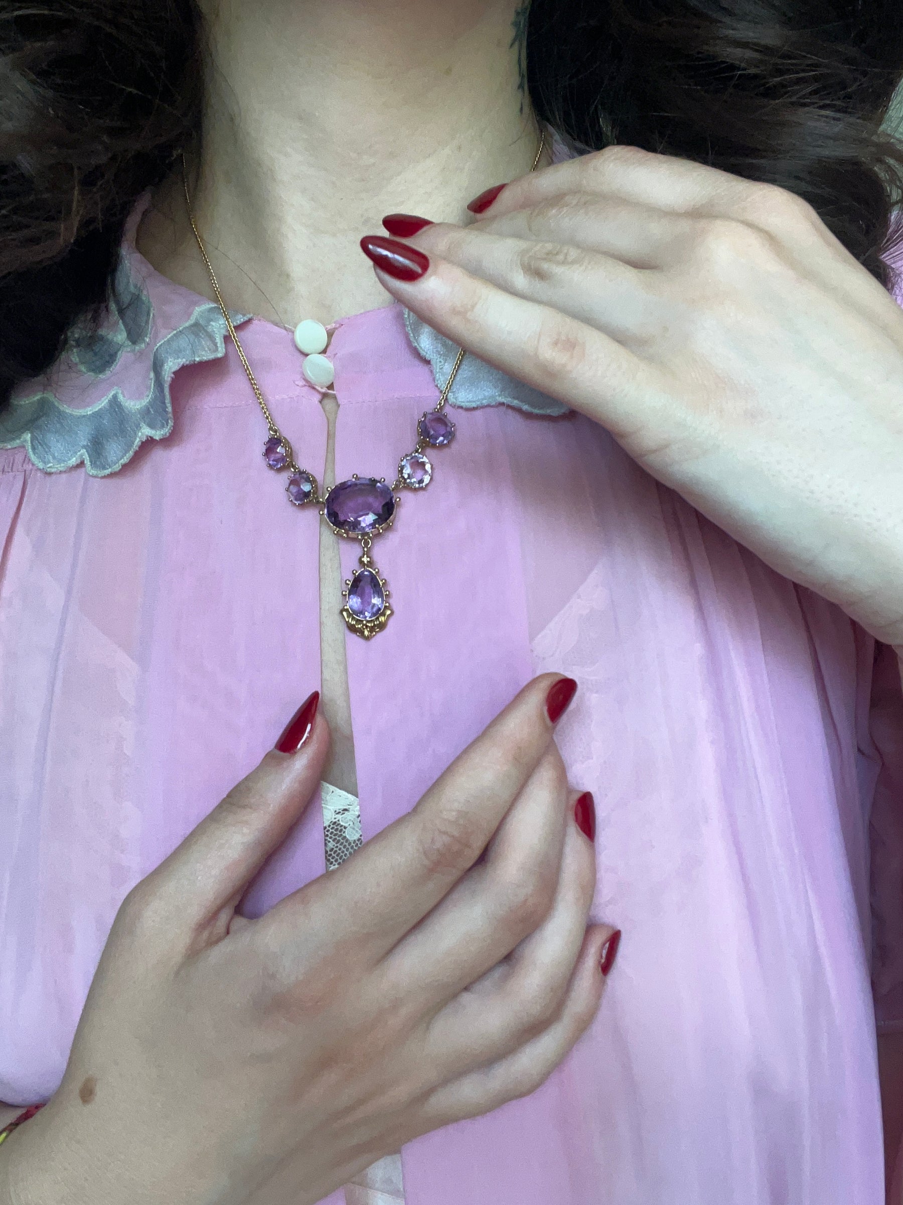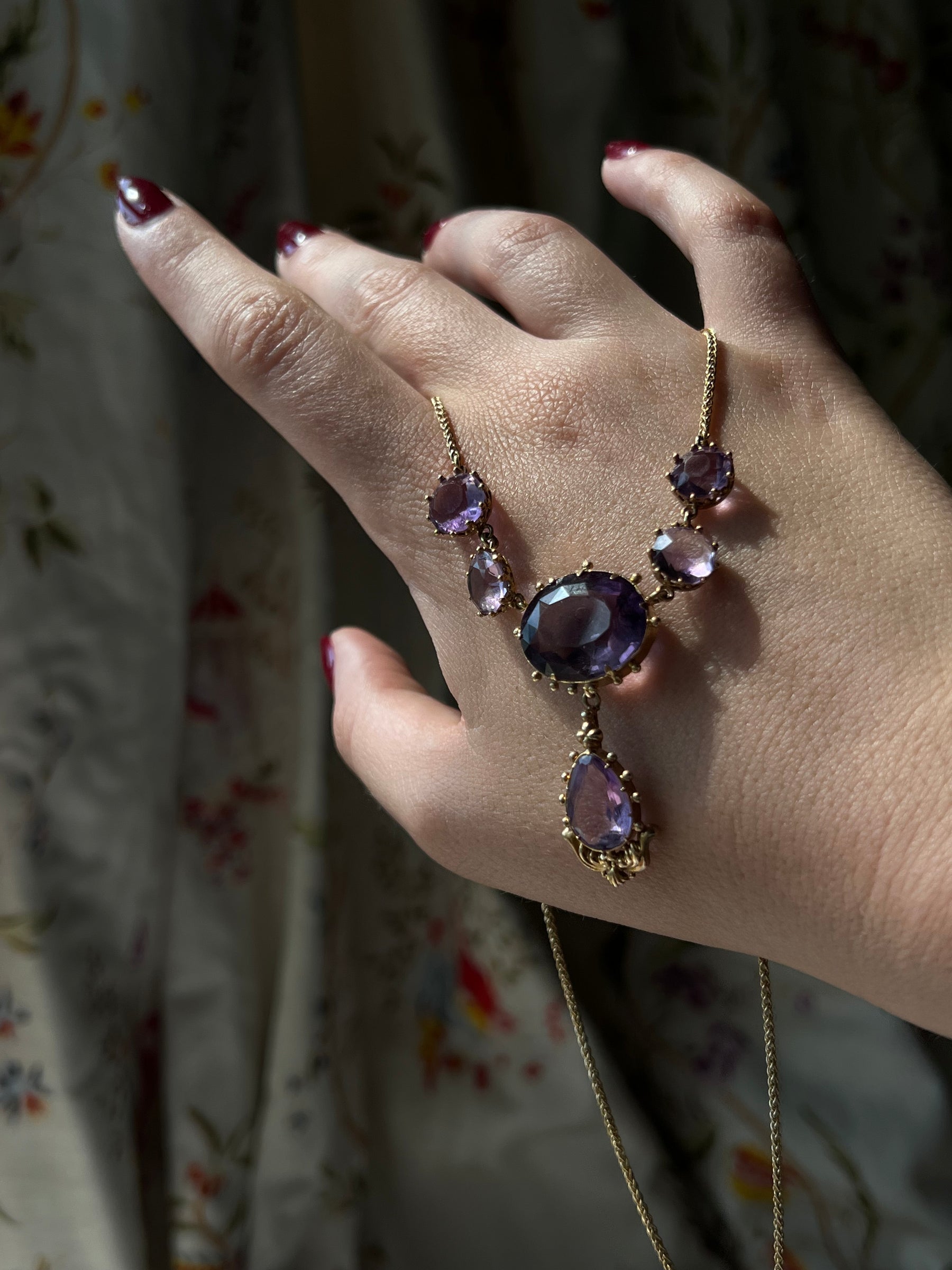 The amethyst stones are truly exceptional: their lustrous lavender hue glimmers in the light, and they are set against the chain in lovely open-back riviere style settings. Below the central drop stone sits the beautiful gold construction of a dove, wings spread open as if cradling the amethyst in its feathers. Such a lovely and sweet detail that only adds to the whimsical silhouette of this necklace.