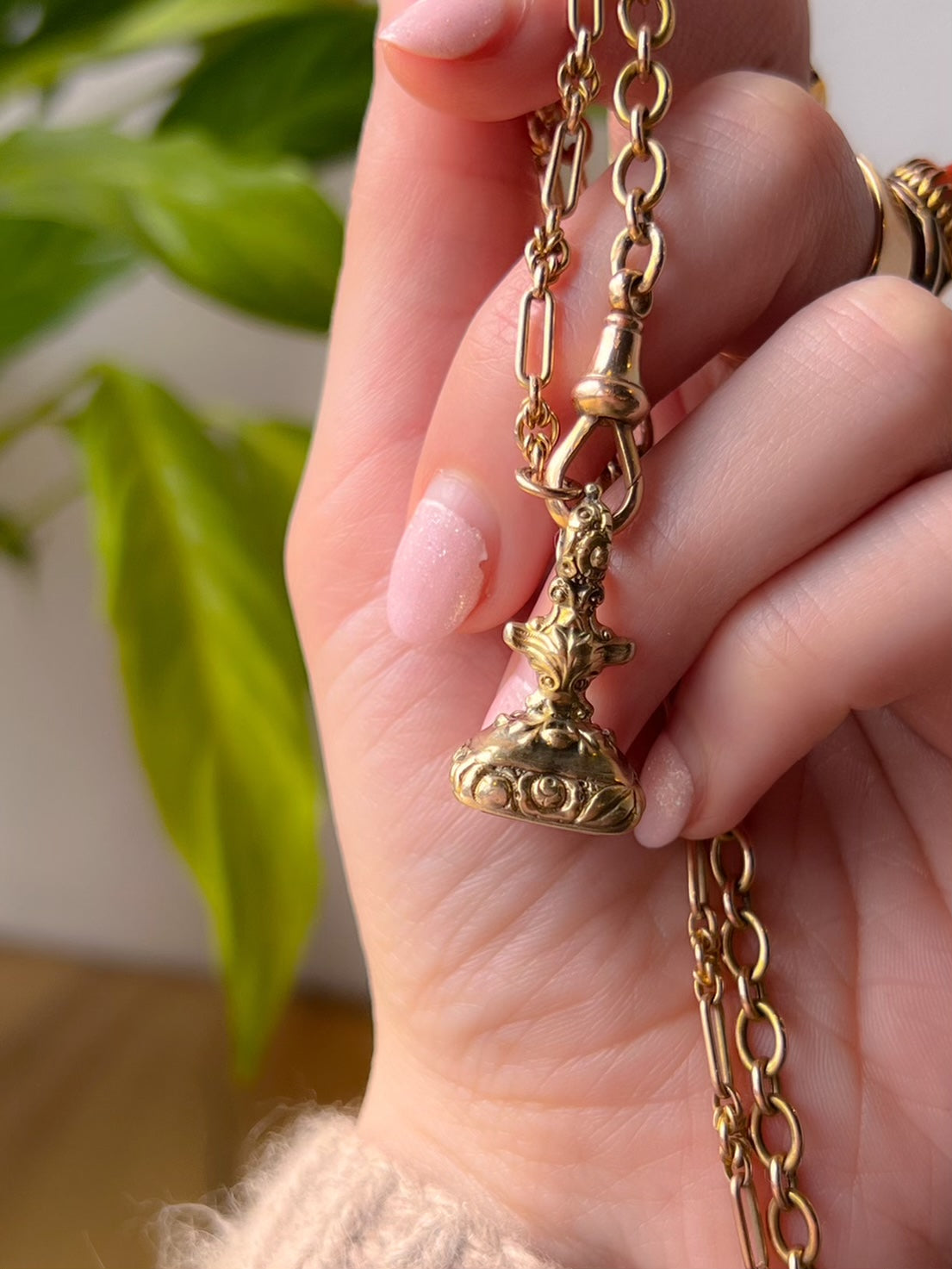 Rare and elusive, foiled amethyst fobs have been, and always will be on the top rung of the luxury bauble ladder. This example, with her sensual, scrolling details, floral finishes, and morning glory paisley at the top bale remind the wearer of the whimsey enjoyed in Regency details. A time of cryptic messages and hidden meanings, this fob certainly masqueraded as a utilitarian object- but did not quite possess the succor, there is no etching on the bottom, and the foil is quite pristine! It is likely that she was never forced to interact with hot wax.