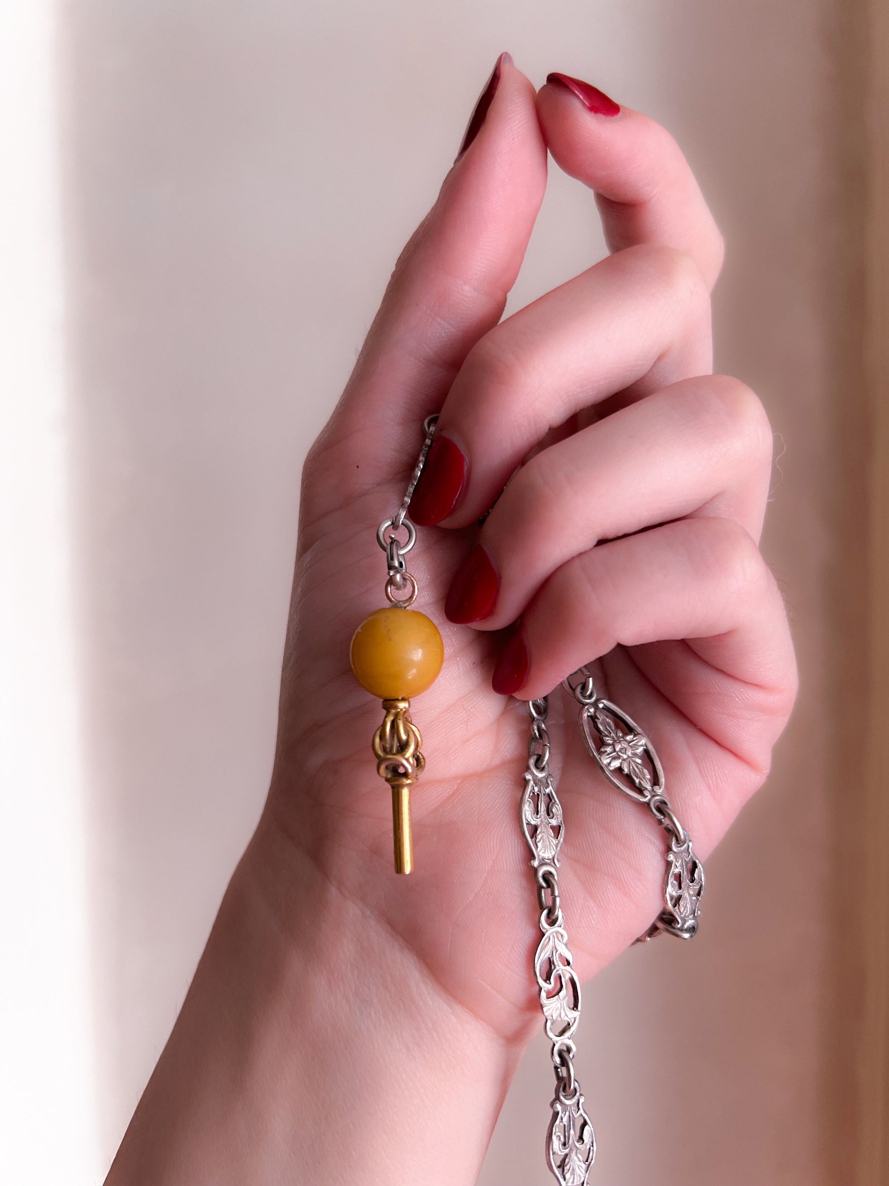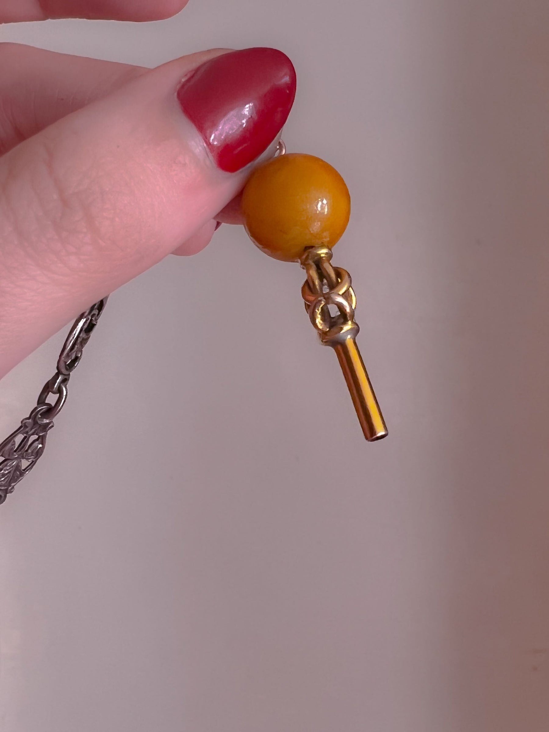 A very rare 9k watch key, this English example depicts a fanciful lover’s knot, topped with a substantial Amber bead! Baltic amber of this quality was highly prized in the early 19th century. This raw honey color specimen is likely 40-50 million years old!
