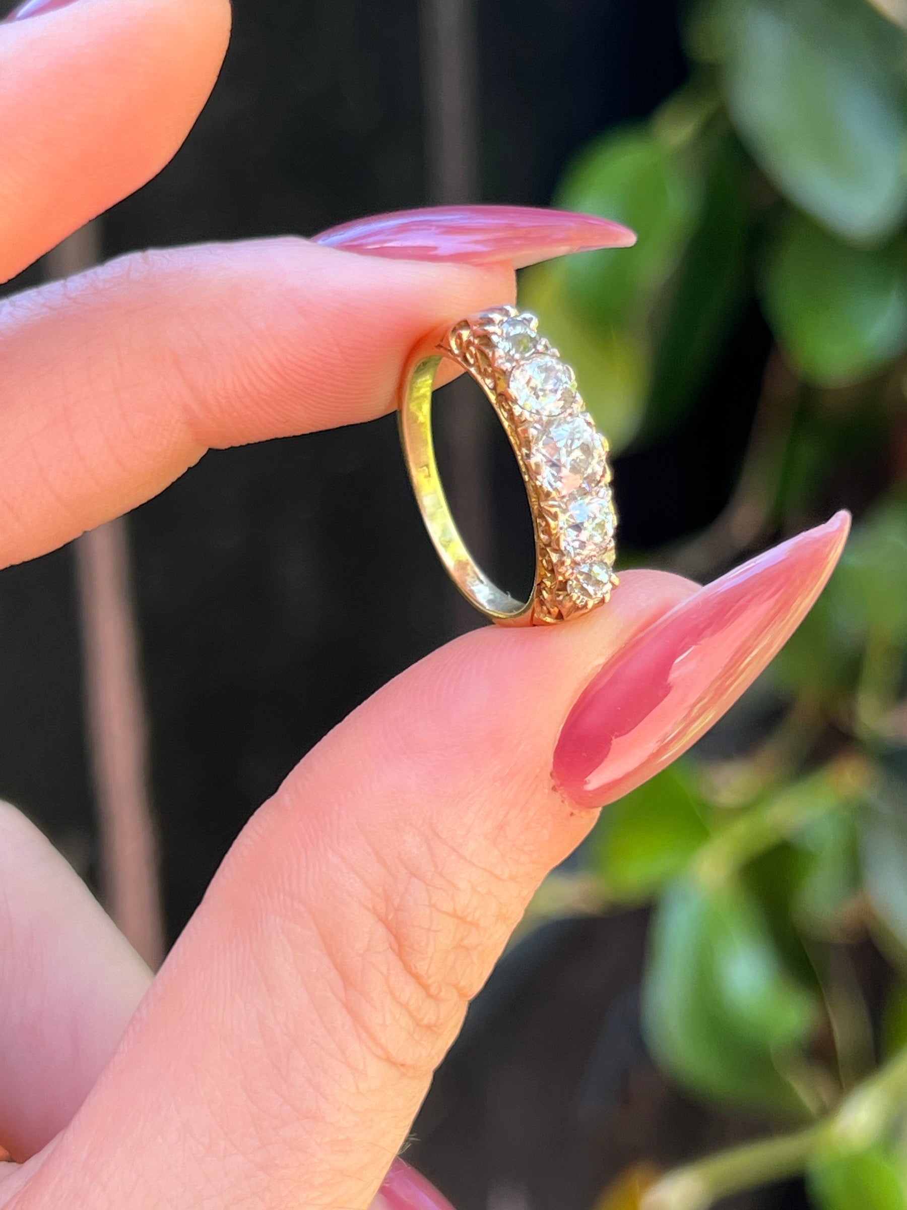 A wonderful five stone diamond band, classic to the third quarter of the 19th century. With warm color diamonds of a VSII to SI1 clarity, this beautiful ring is a classic example of the historical band that always has a home in any stack! With her sensual lofted gallery in very yellow 18ct, fresh to NYC from London.