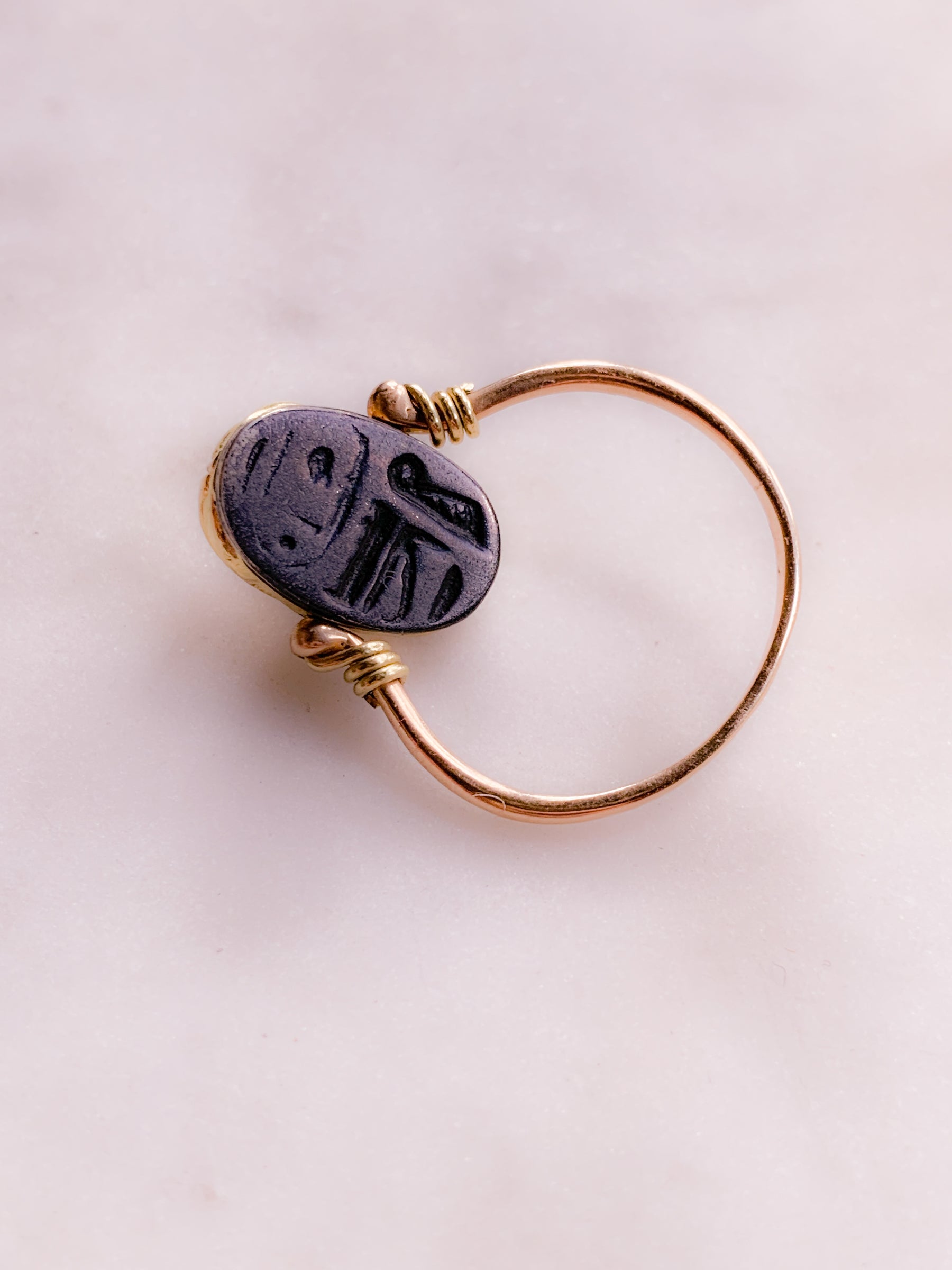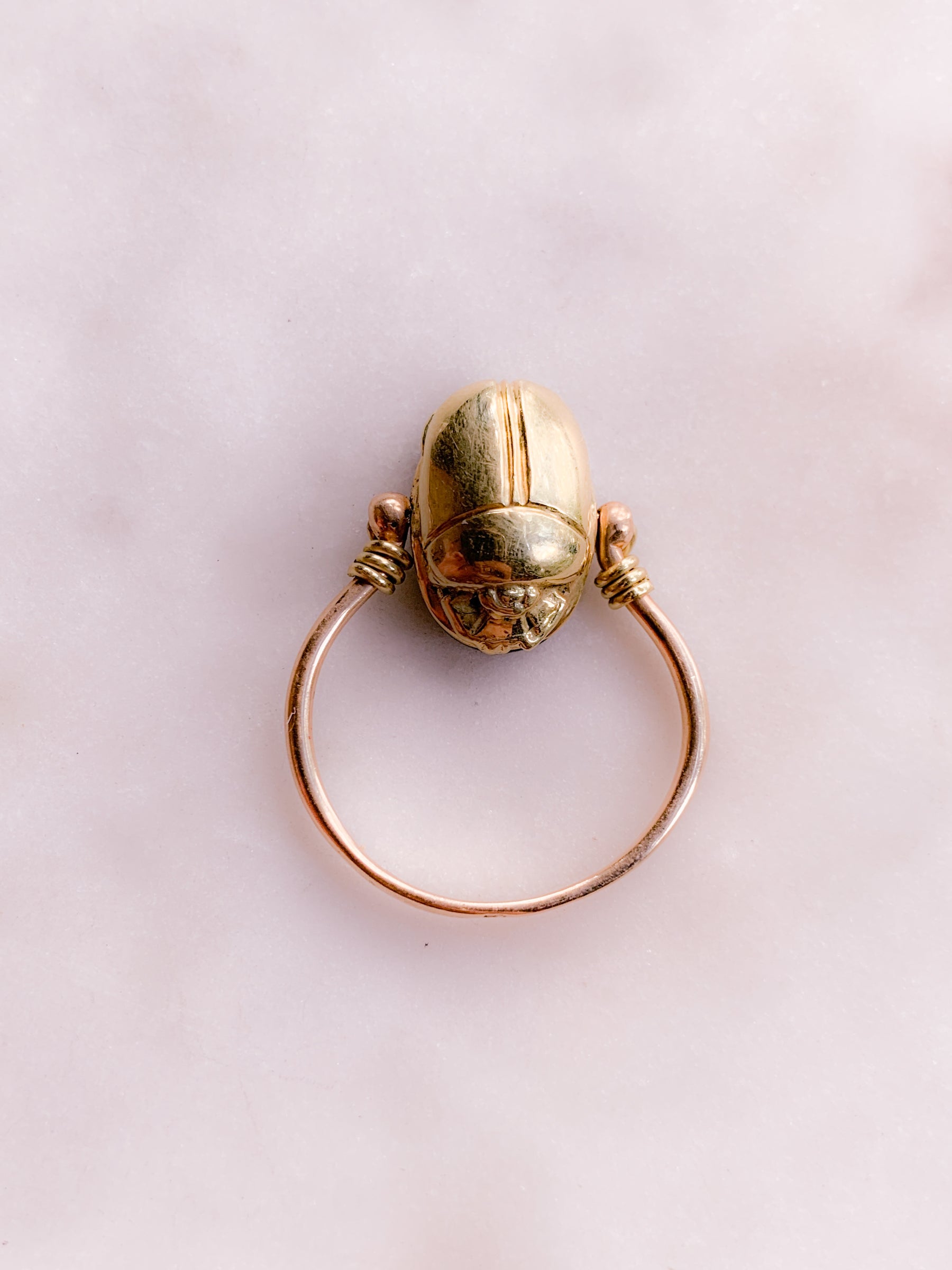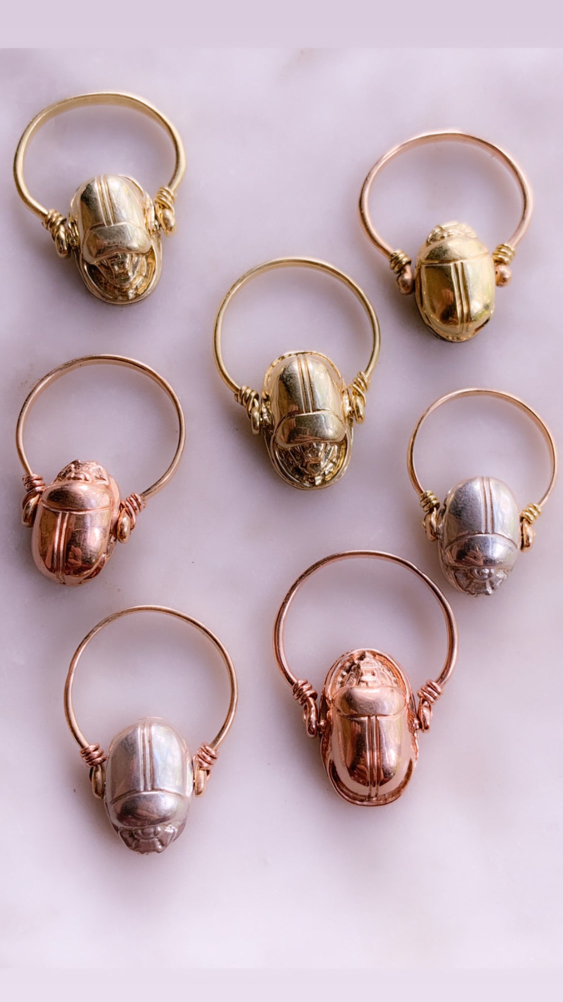 Materials: 14k pink gold band, 18k yellow gold gold wire wrap, oxidized sterling reverse of scarab.