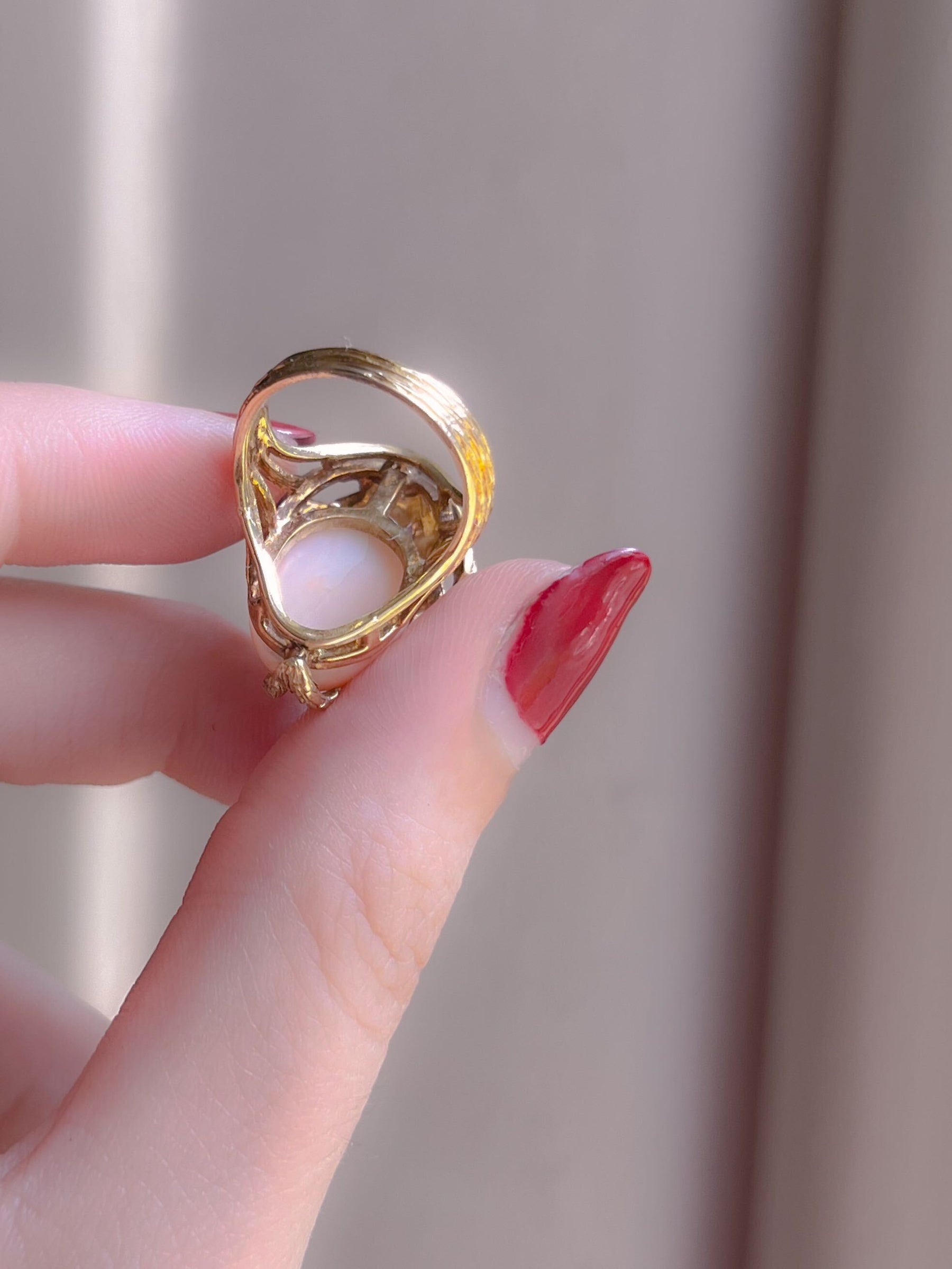 ✨SIZING INCLUDED FOR L ✨A rare fantasy ring in 14k, weighing a massive 9.4g. Featuring .15cts of diamonds and a large coral “dragon’s egg.” A very special fantasy piece, in a size 6.