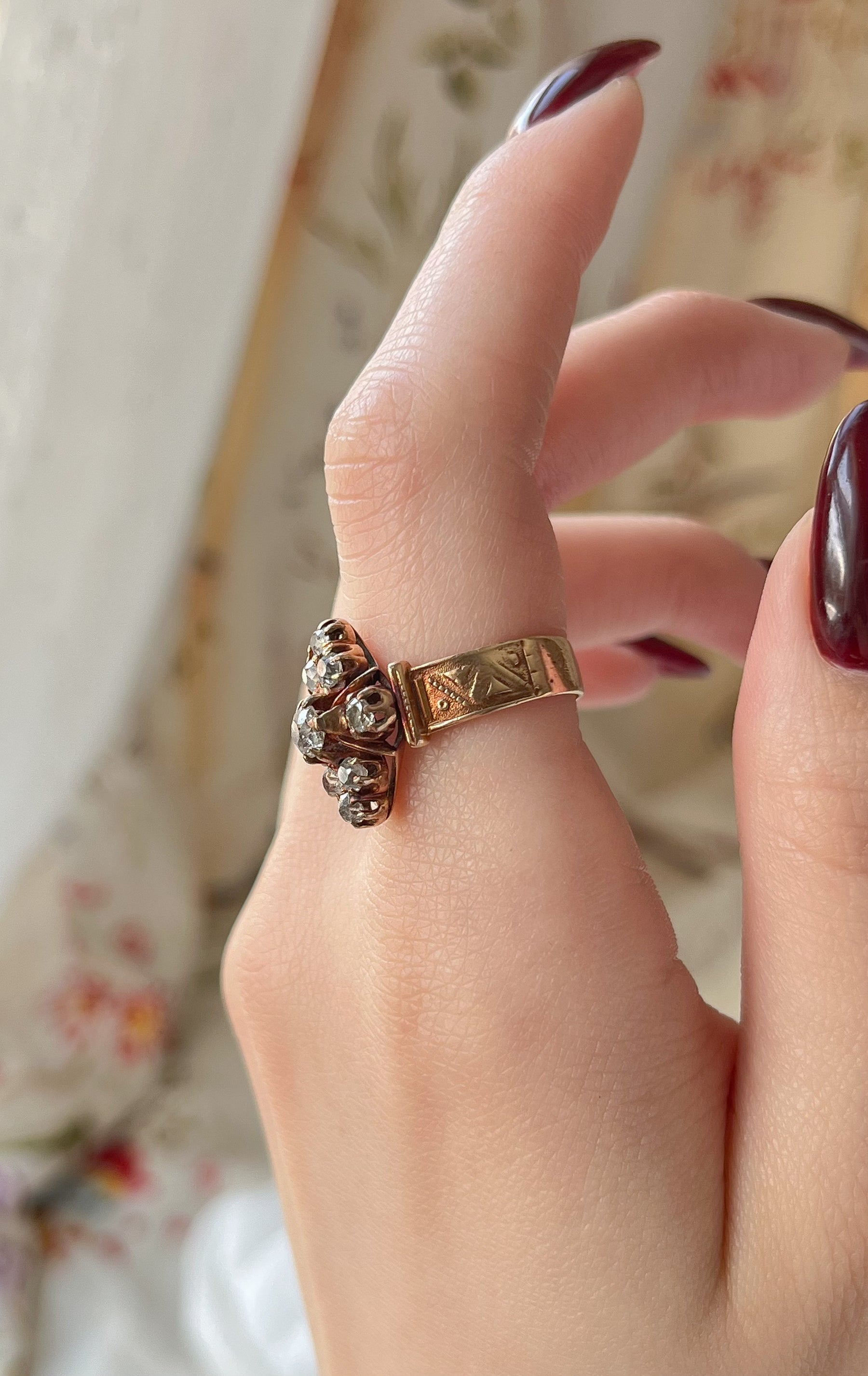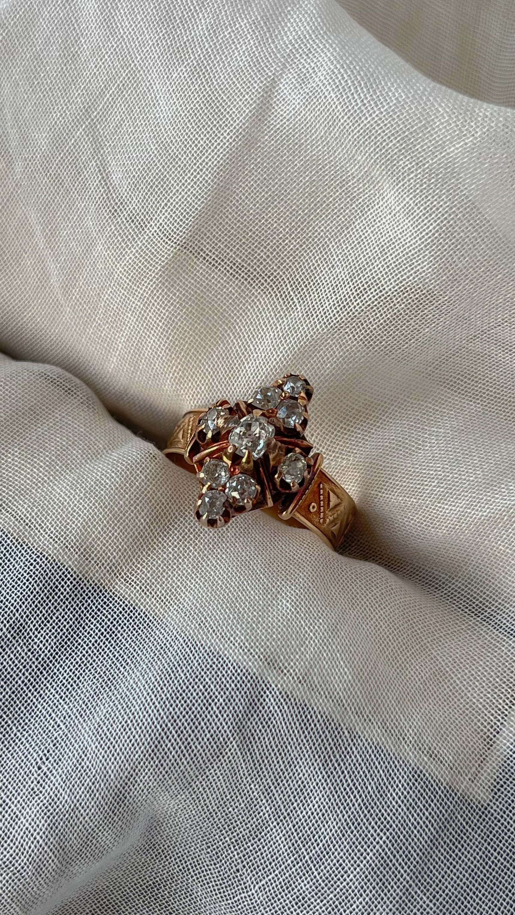 A deliciously rare all original navette ring with geometric band. This diamond example with nine stones set in brilliant blushing pink 14ct makes a stunning addition to any collection. Particularly notable the clusters at the top and bottom that elegantly elongates the ring on the finger. Absolutely remarkable!