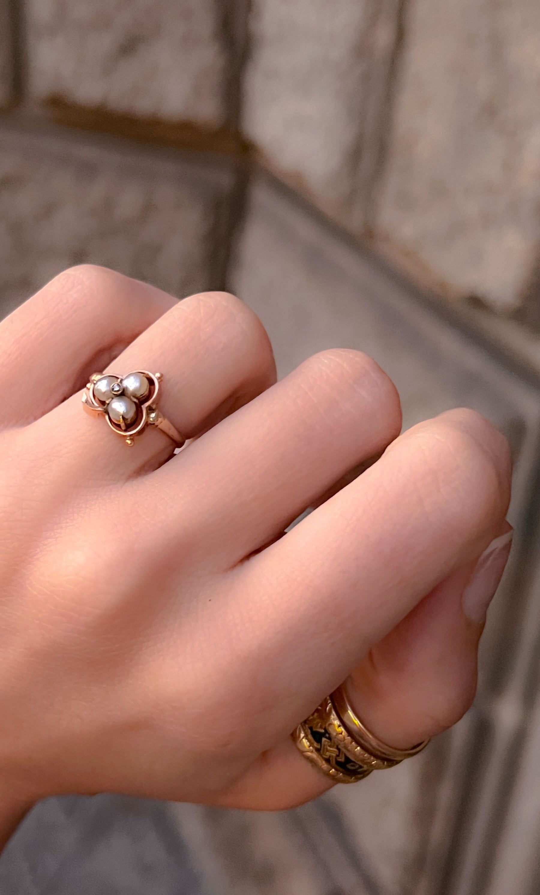 A very sweet pink gold Victorian clover ring, this beauty features a diamond center, fine hybridized settings, and a low profile shank. Originally a stick pin, now finely converted, I do adore this piece as a ring as it allows for a careful examination of the bezel setting around each cool-toned plump pearl, further secured with claw prongs, and nicely accented with a clover tail, at the base, set on an angle to the side.
