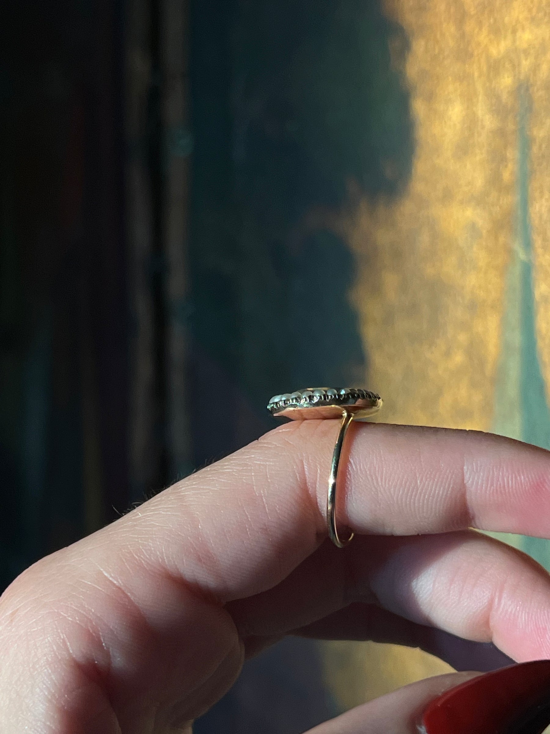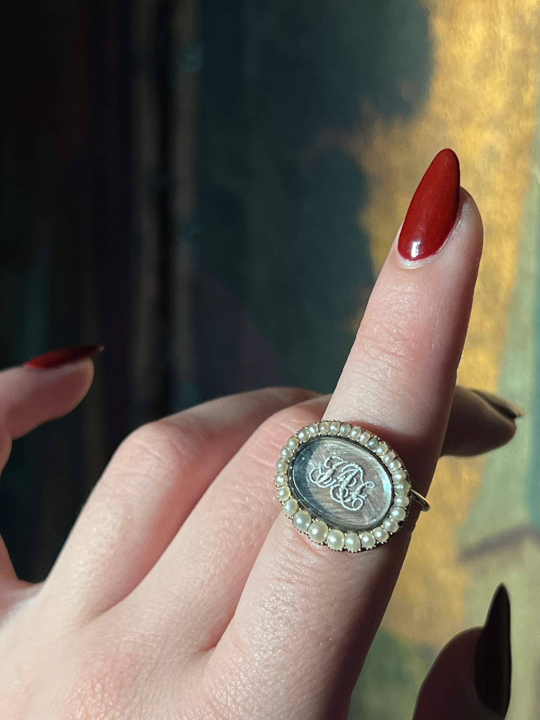 Crafted circa 1790 in a beautiful 14 carat gold, this Georgian Memorial ring is a pinnacle example of such amatory jewelry. The design is impeccable, featuring stunning miniature natural seed pearls halo’ing a glass-topped enclosure. The glass is inlaid with a beautiful tuft of woven hair; and on the surface of the glass is a monogram painted in stark white relief.