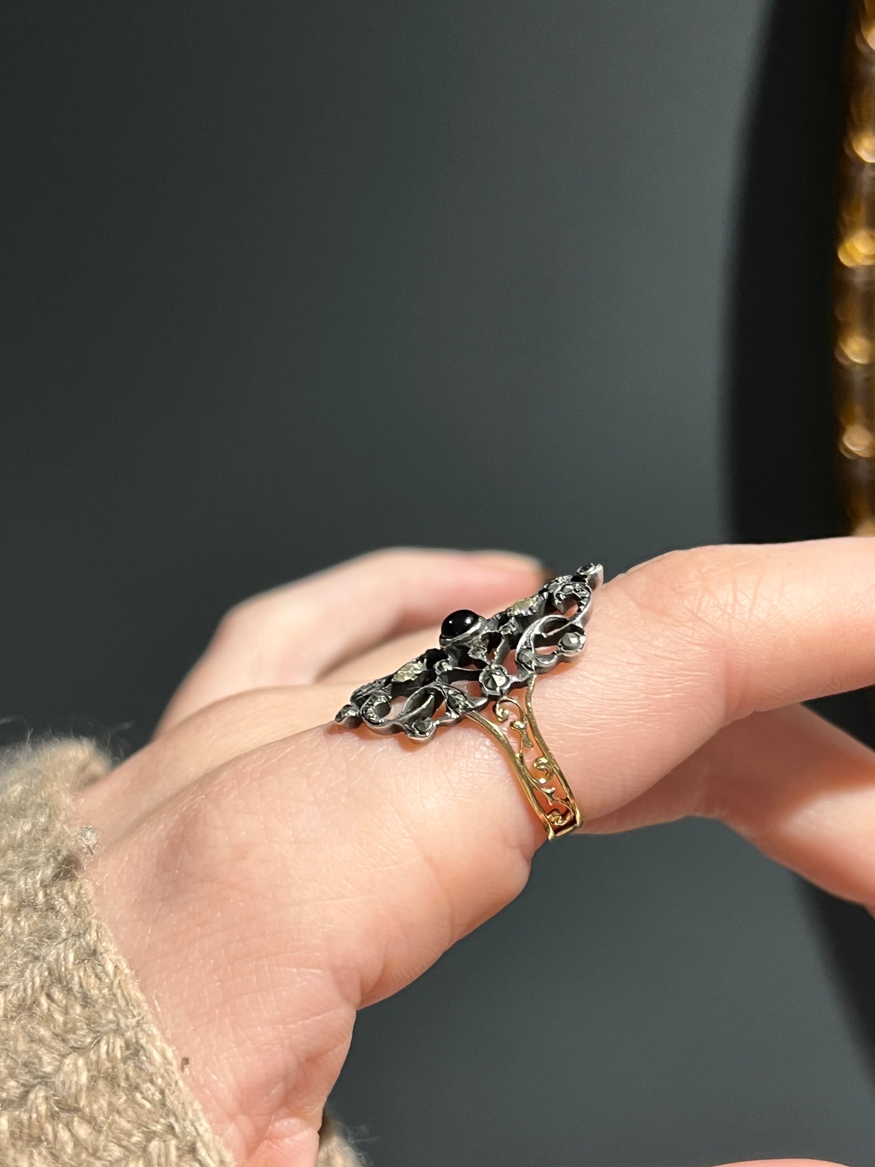 In the 19th C tradition, we find this exceptional marcasite, diamond, garnet and 18ct French beauty with her sensual construction- reminiscent of a garden gate.