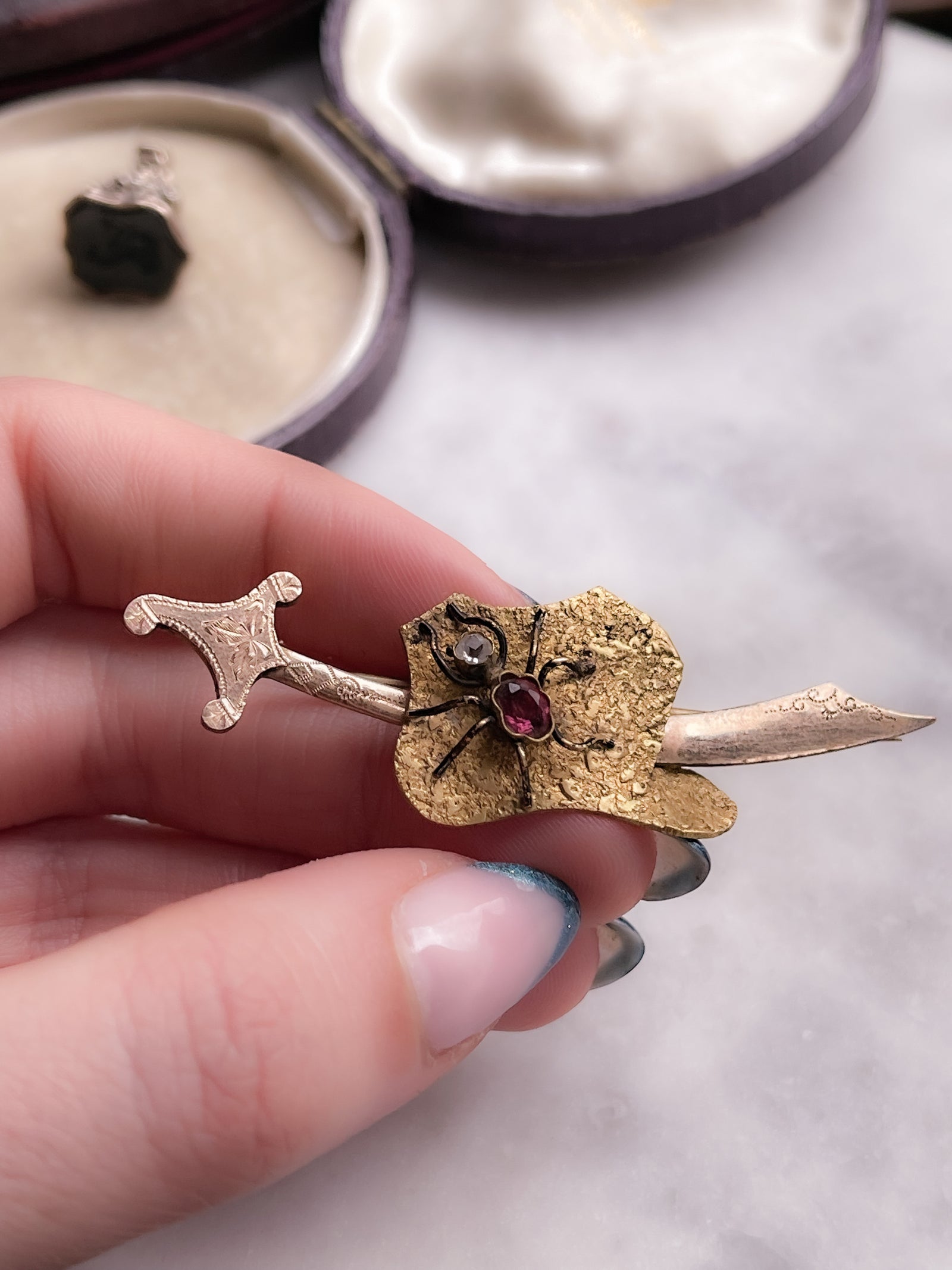 Gold-Filled Scimitar with Paste Ruby Bug