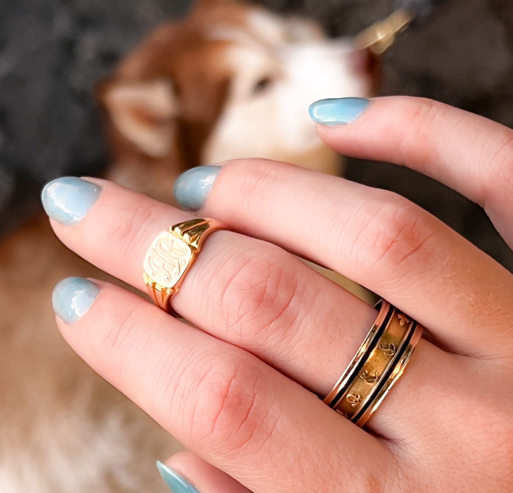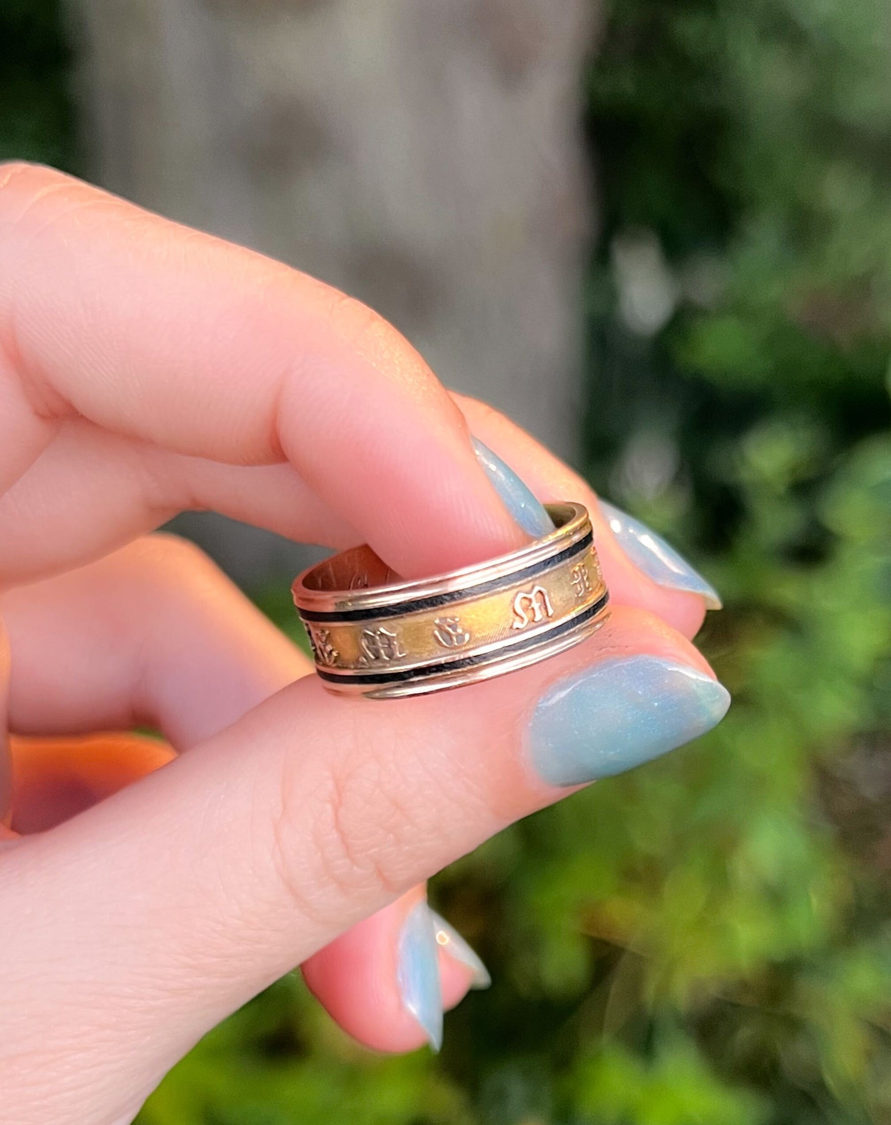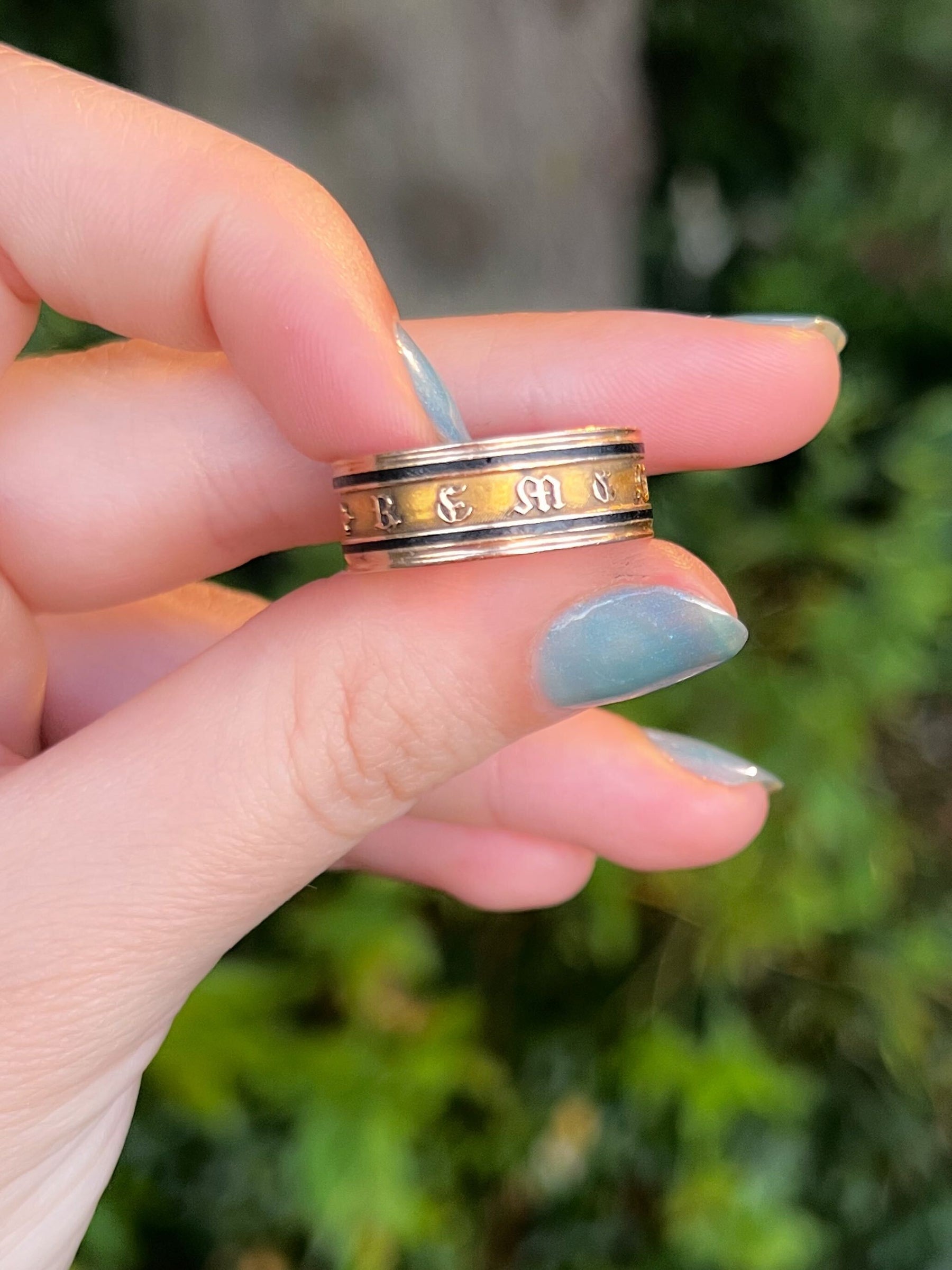 One of the most charismatic memorial rings I've had the pleasure of handling, this early 19th-century example features a very rare gothic font declaring "Remembrance" around the exterior rim. The N letter is here morphed into the Greek Omega character, a finalizing symbol, and the last letter of the Greek alphabet, indicating the end of Mr. Atkinson's life. Two black bands of enamel form eternal rims around the word.