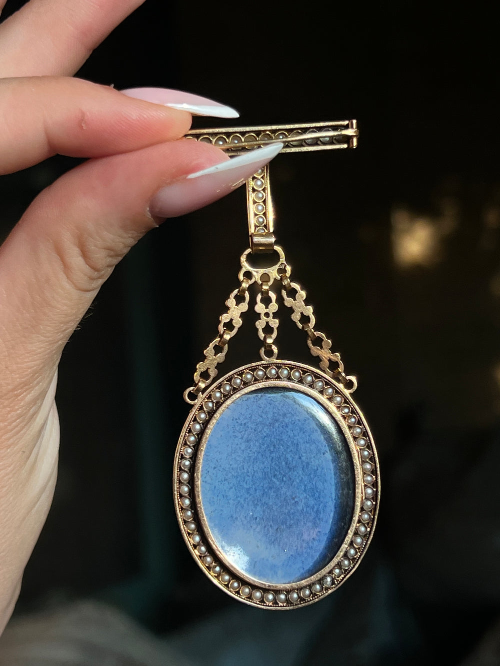 The piece also features a vinaigrette top and a glass locket back, both rare. It’s a jewel with narrative depth, painterly sophistication, and historical pedigree, the perfect 1850’s collection cornerstone.