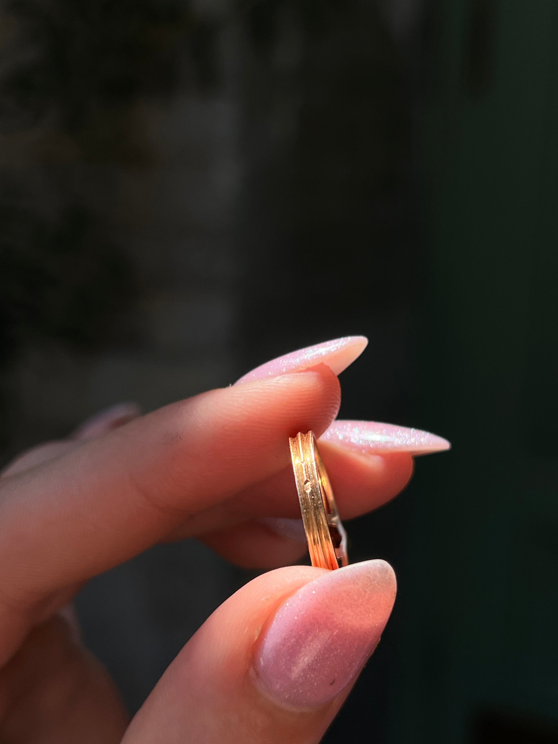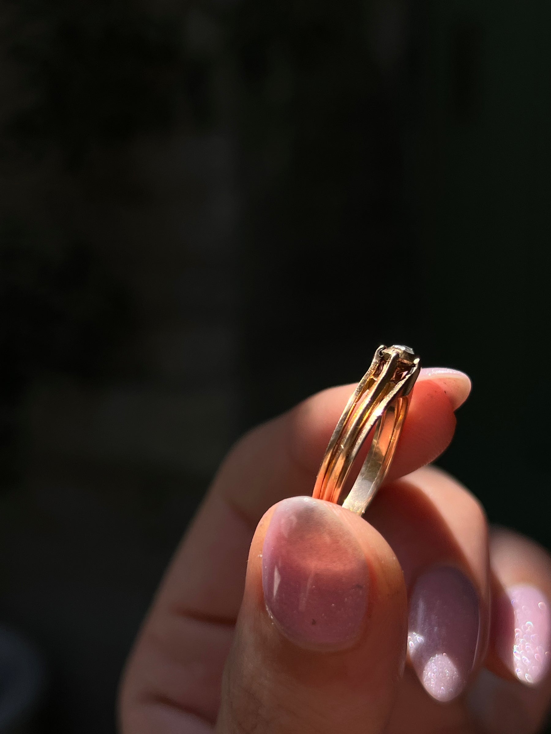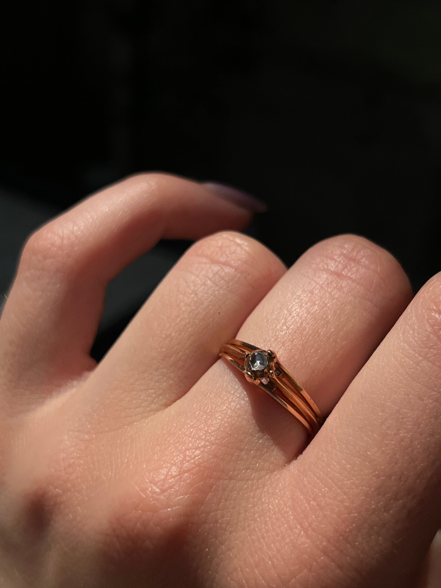 Dainty and darling! This French Diamond ring is a fine example of Napoleonic design. Crafted circa 1840’s in 18 carat gold, this piece features one of the most beautiful rose cut diamonds of the period, a Napoelon III example. Also gorgeous is the triple “knife band” construction, a common detail of jewelry from mid-19th century France.